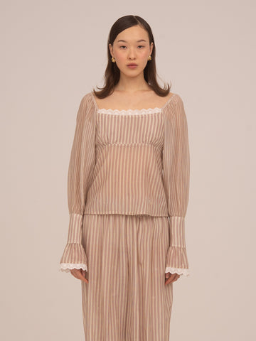 Blusa en tono crema suave, confeccionada en un tejido ligero y semitransparente. Escote recto rematado con un detalle de encaje fino....