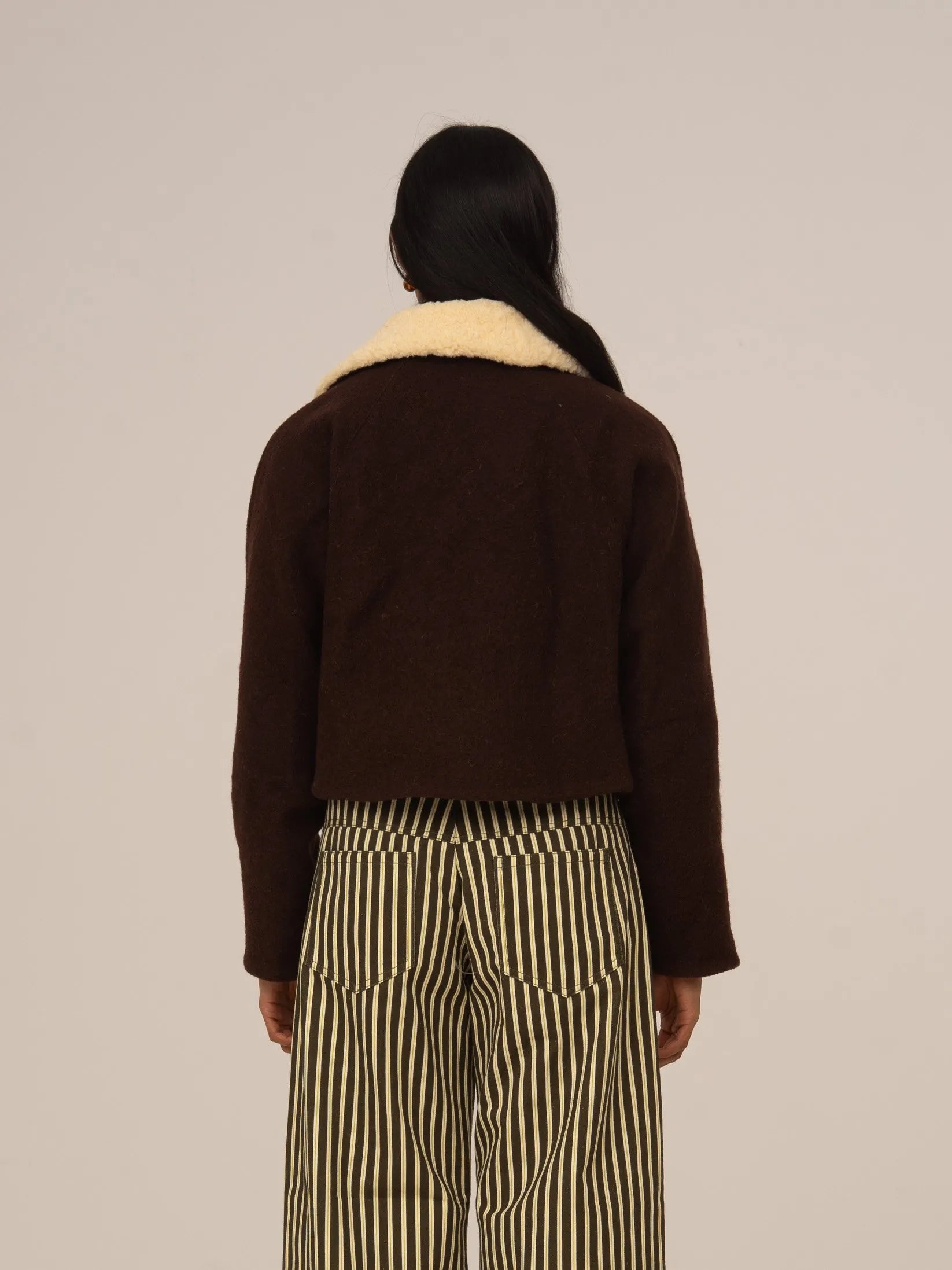Short brown jacket with a shearling collar, warm and with retro charm.