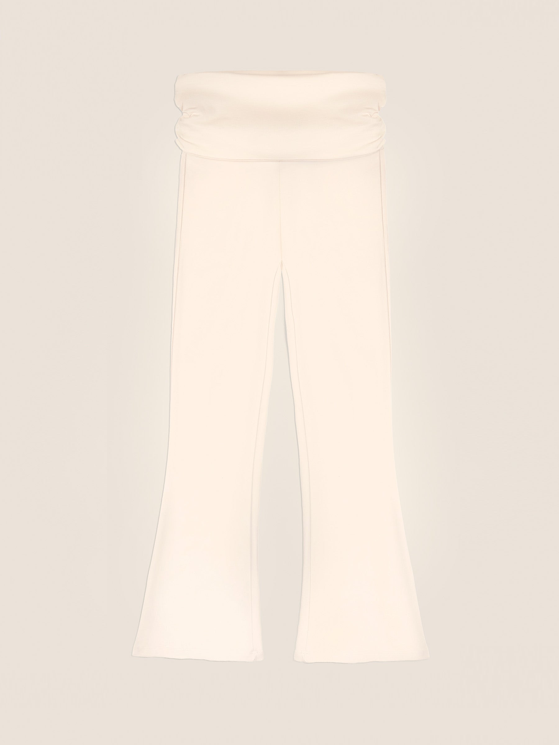These elegant white trousers flatter the figure with a slim fit at the hip and a gently flared silhouette. The overskirt adds a distinctive and sophisticated touch, creating a fluid and contemporary look. Made from soft, stretchy knit fabric, they offer comfort and freedom of movement without compromising on style.