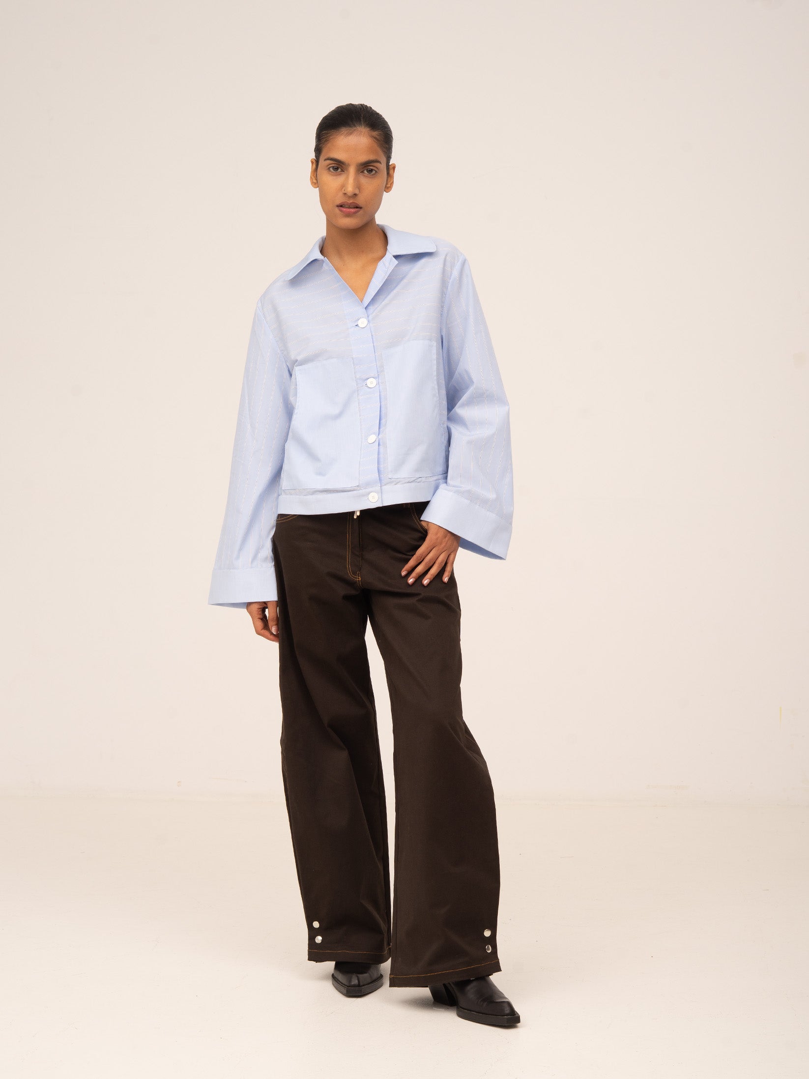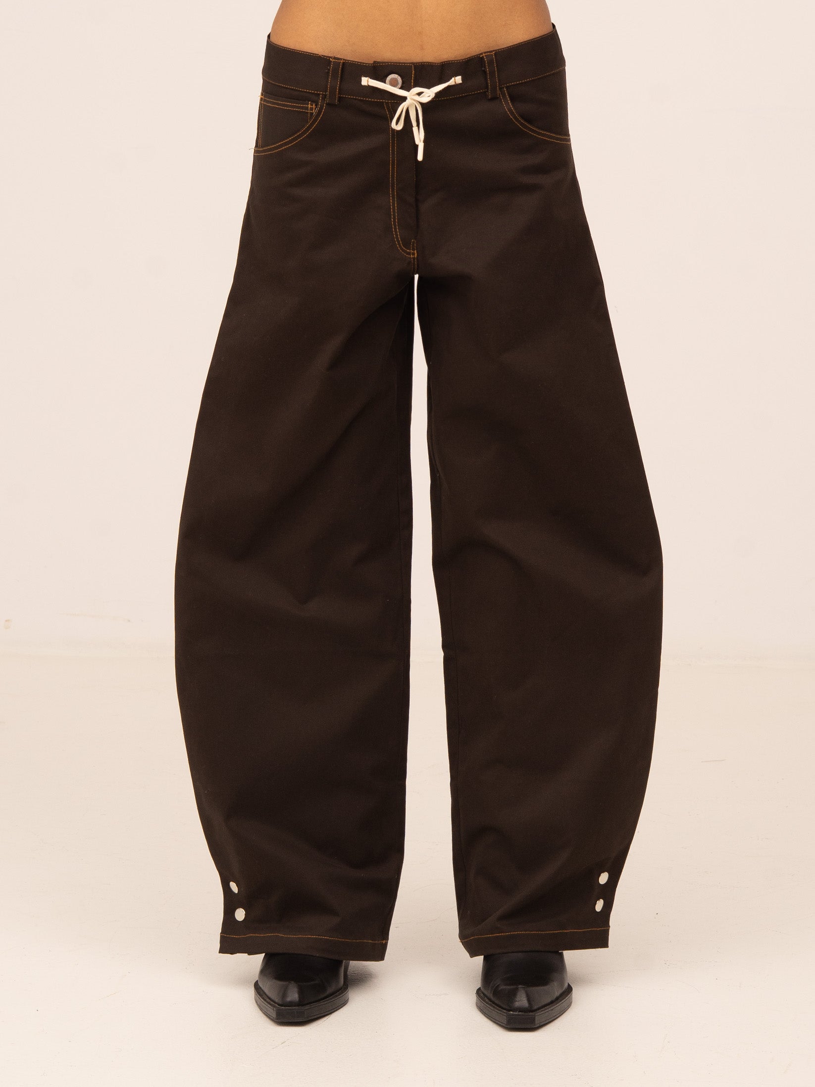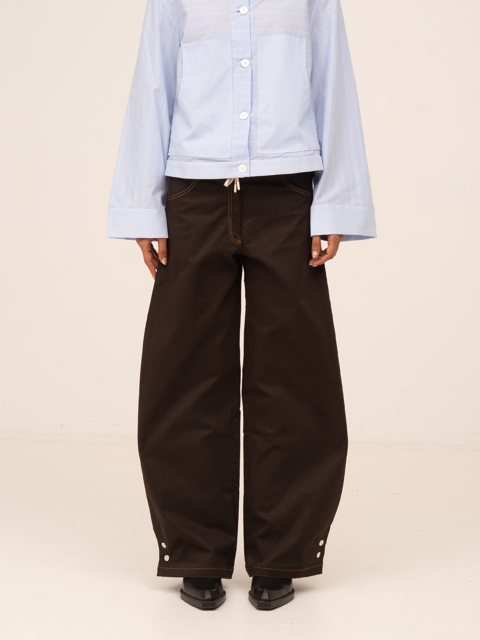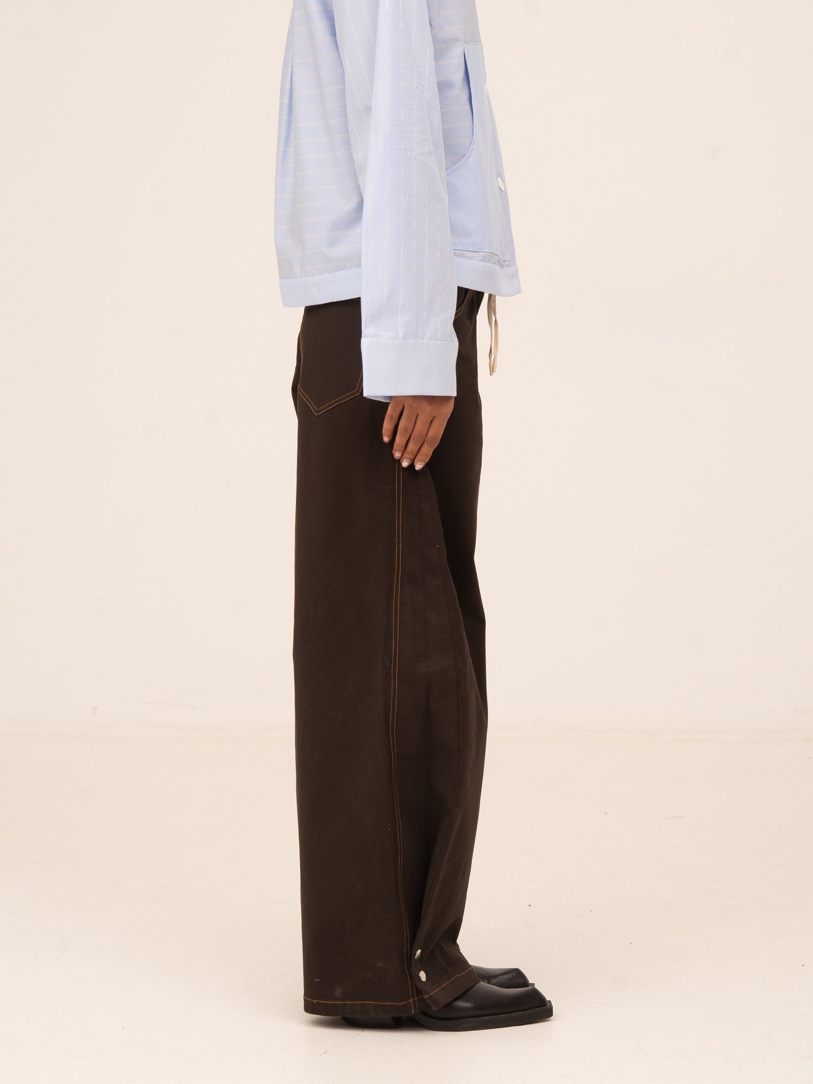 Wide-leg jeans. Snap button closure detail at the calf.