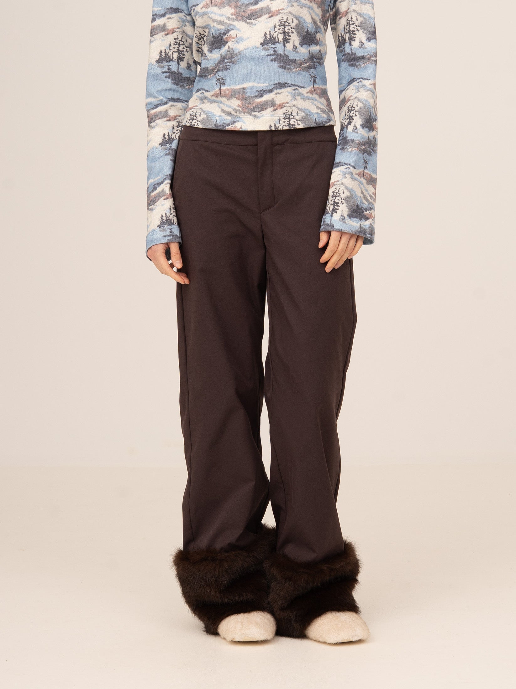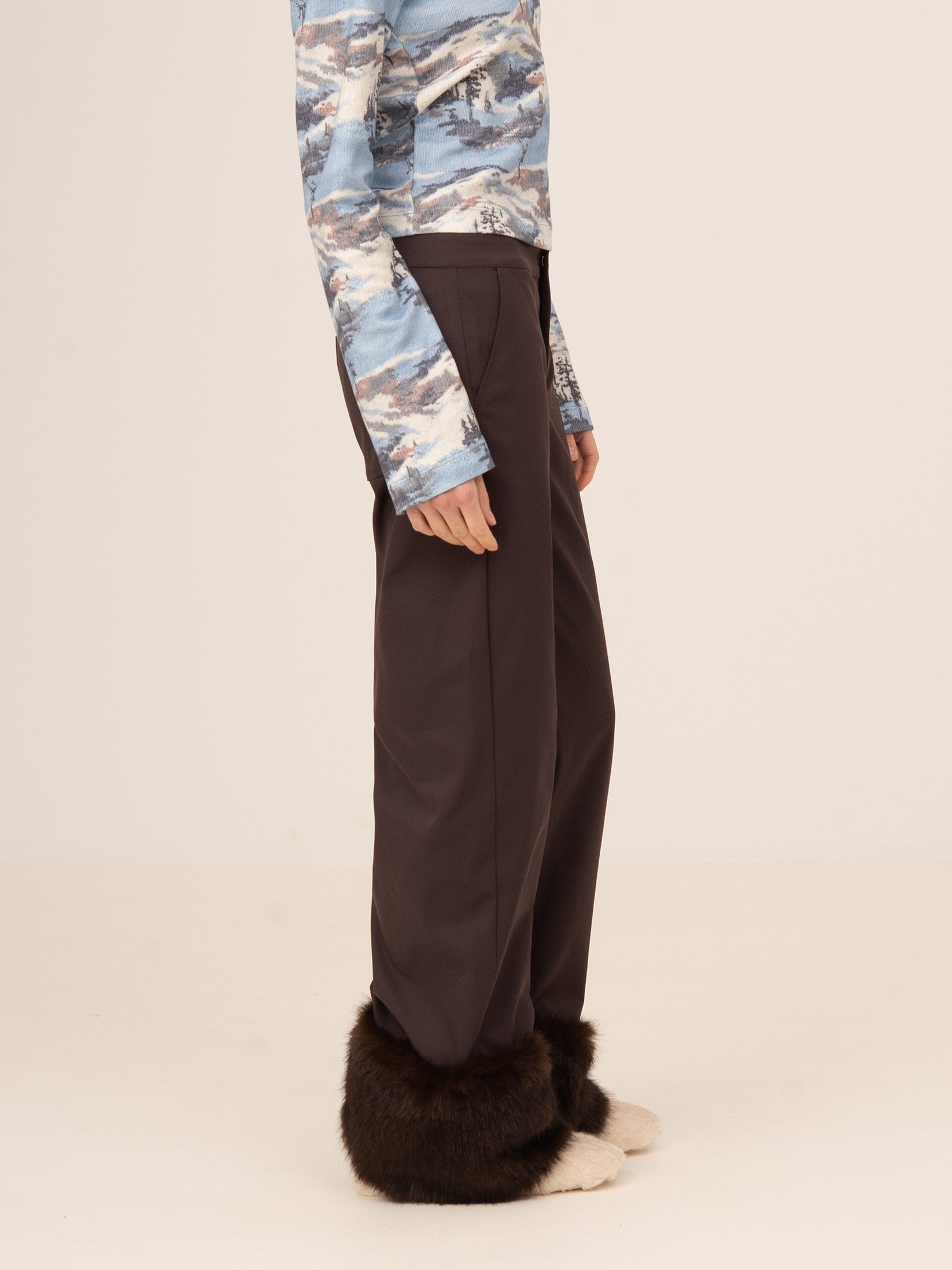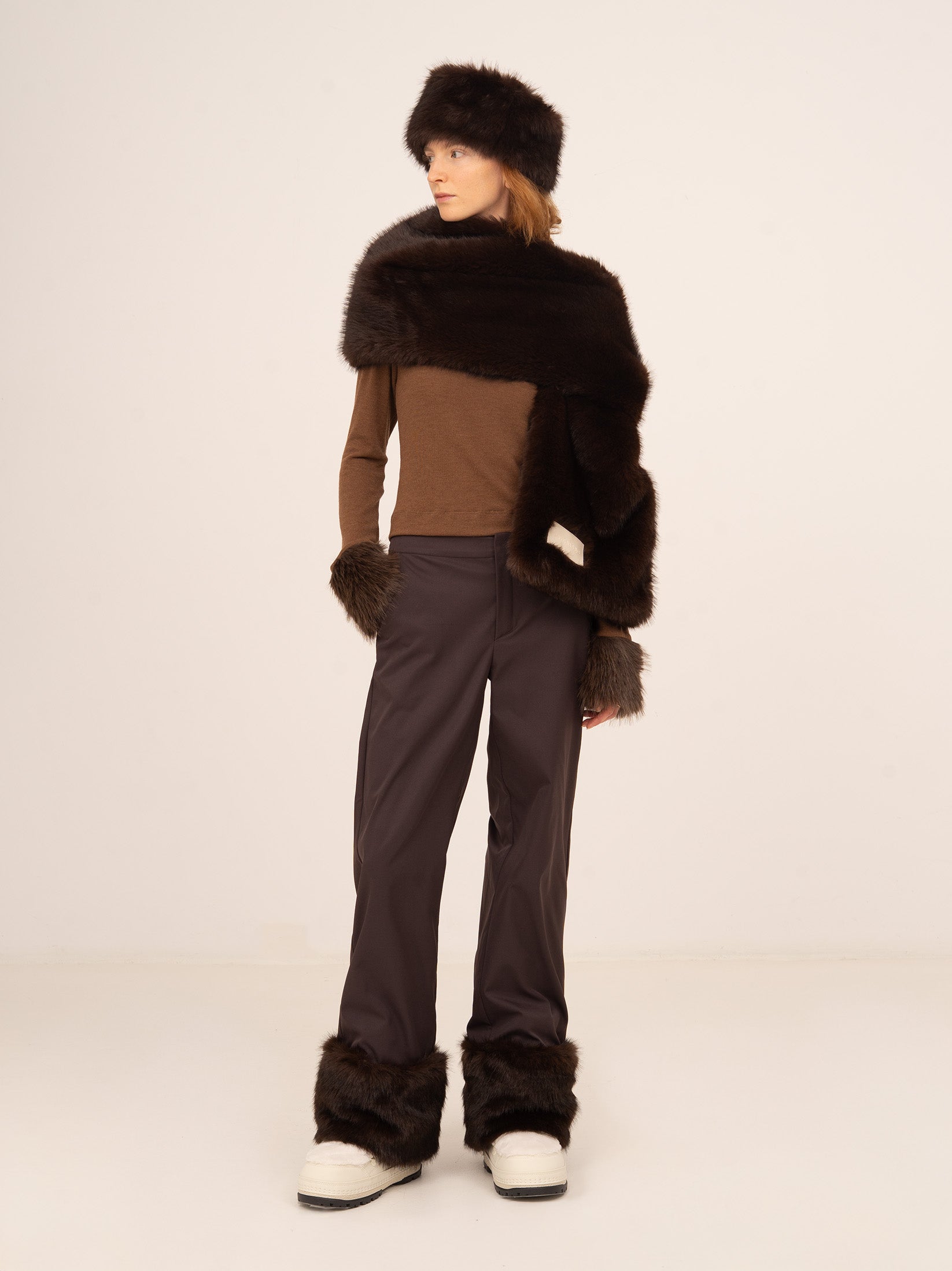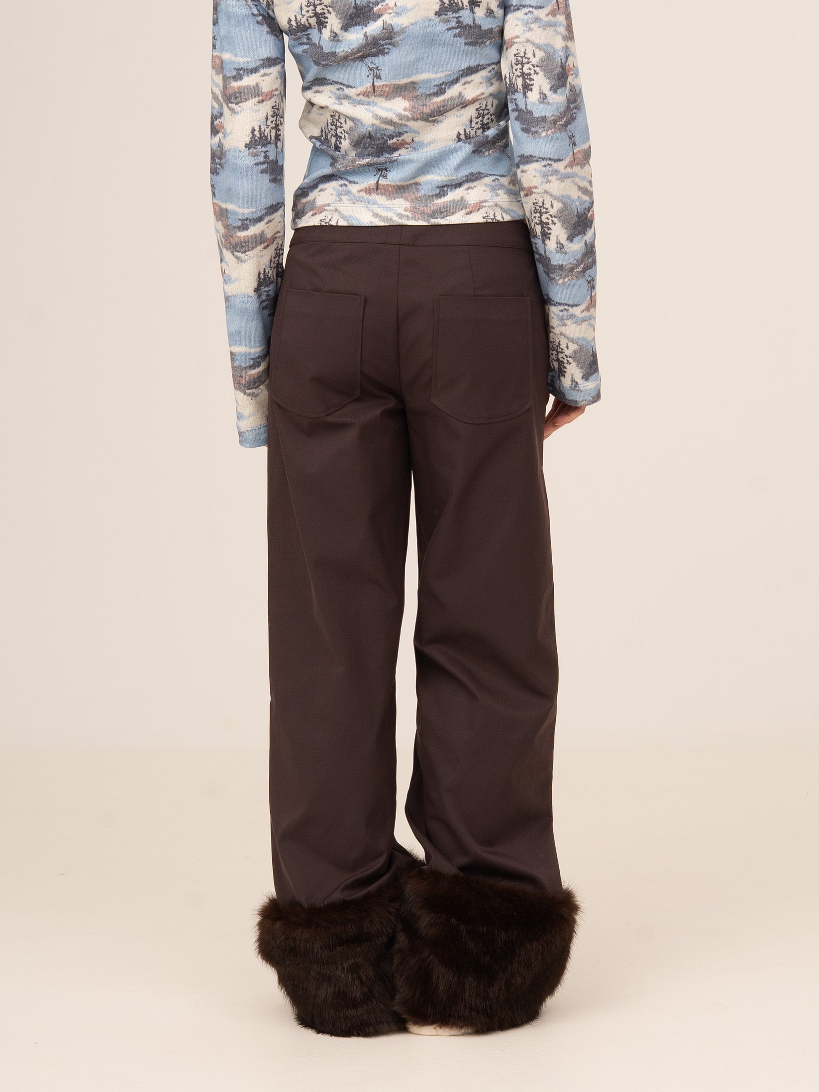 Women's brown trousers made of technical fabric, with an elegant fur detail at the hem that adds a distinctive and sophisticated touch to the design.