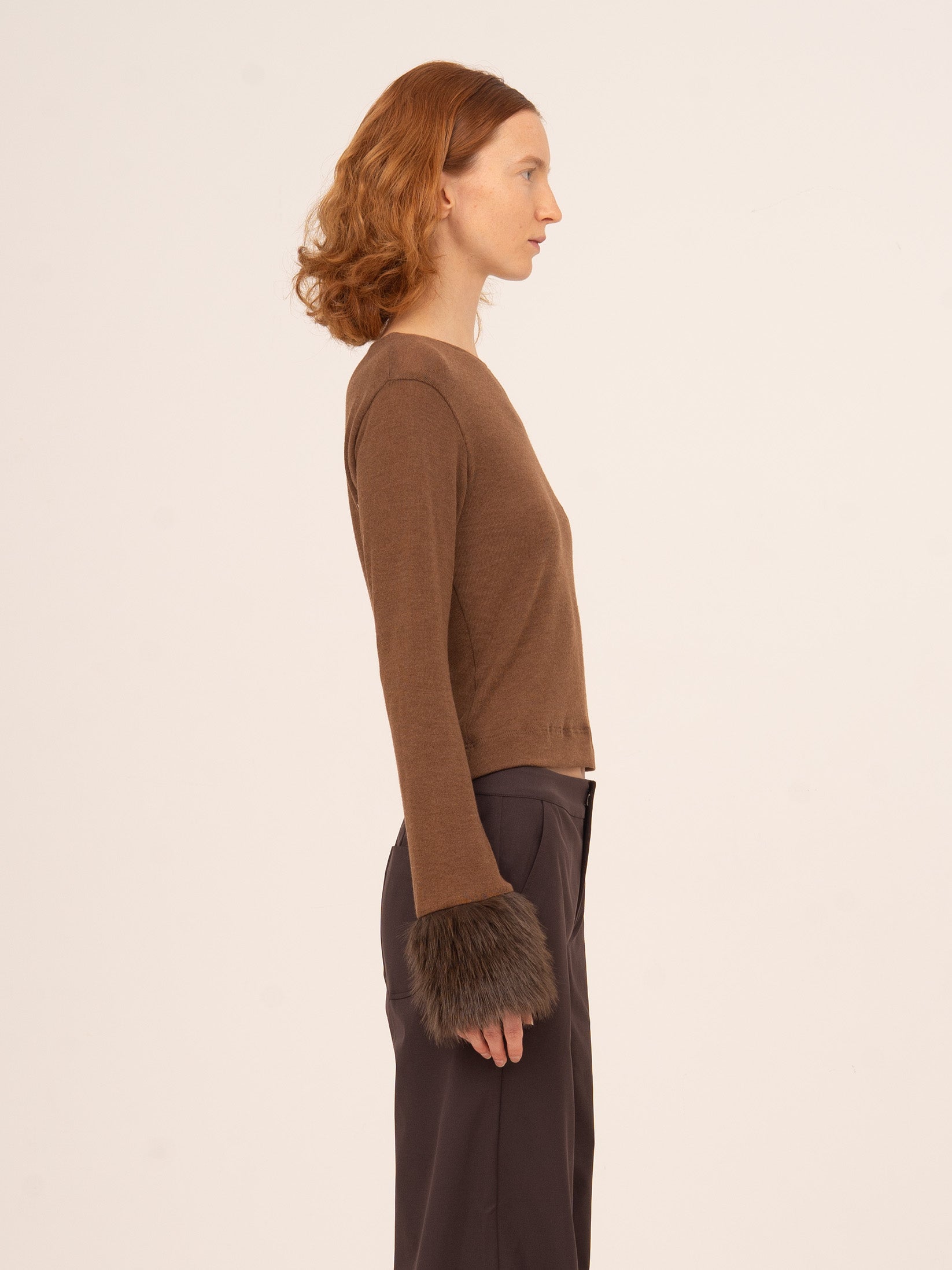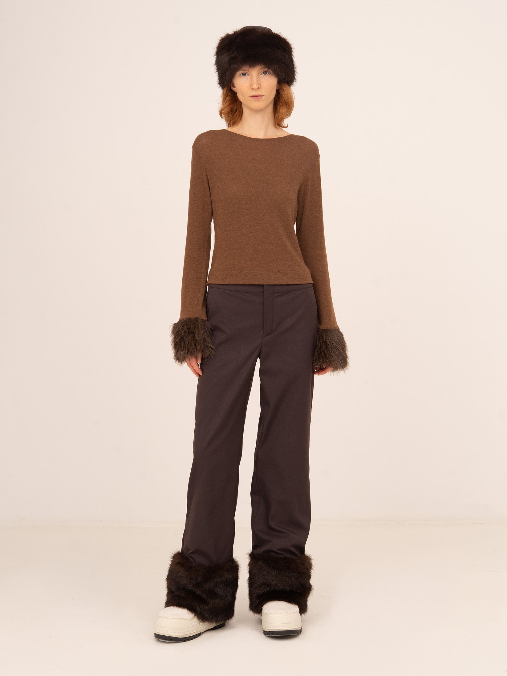 Top elastic color brown with fur details in tune on the fists.
