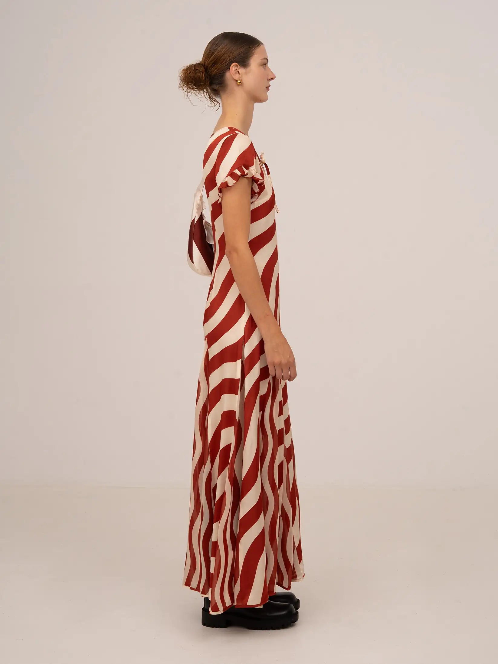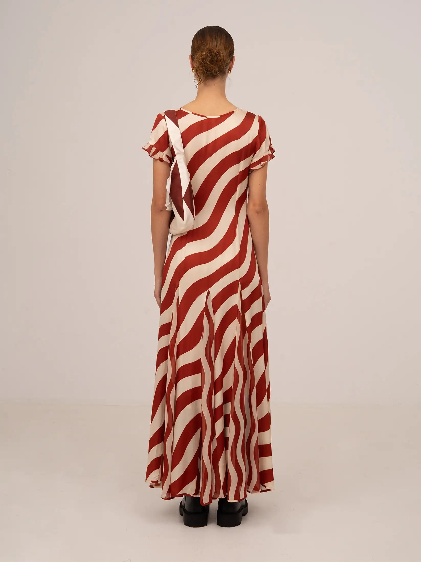 This maxi dress stands out for its flowing design and wavy striped print, which flatters the figure and creates a dynamic and very flattering visual effect. The V-neckline adorned with a bow adds a feminine touch, while the short sleeves with small ruffles add delicacy and subtle volume. Made from a light and comfortable fabric, it drapes naturally. The hem finished with piping and the invisible zipper complete a polished and meticulously crafted look.