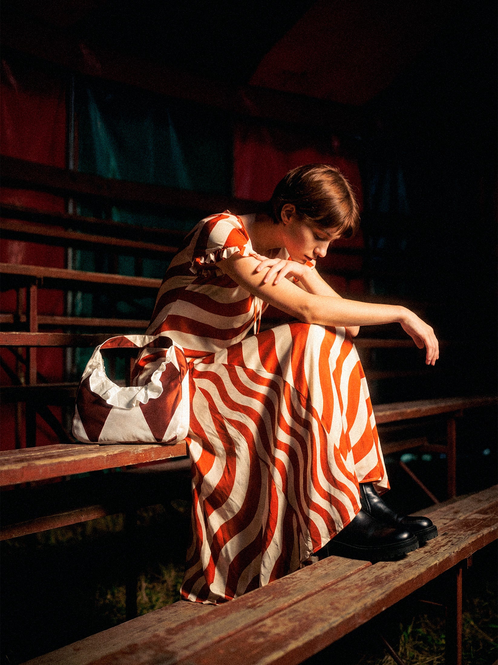 Maxi party dress with a wavy print in red and cream, a light and elegant piece that brings movement and sophistication.