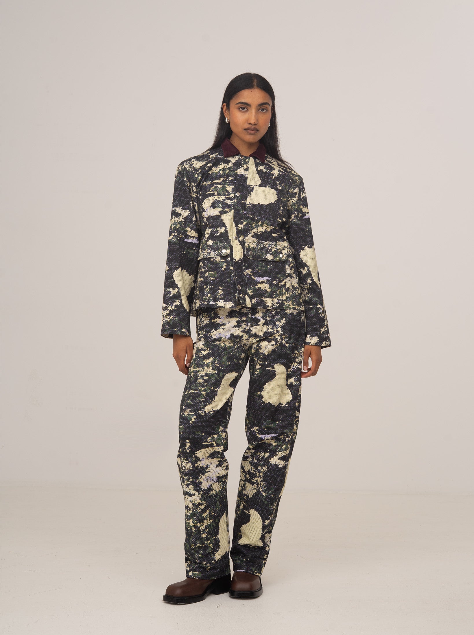 The Bird Print Denim Jacket combines the casual style of denim with a nature-inspired print for a fresh, artistic feel. Its burgundy corduroy collar creates a sophisticated contrast, while the front pockets and center button closure with a metal zipper add functionality and modernity.