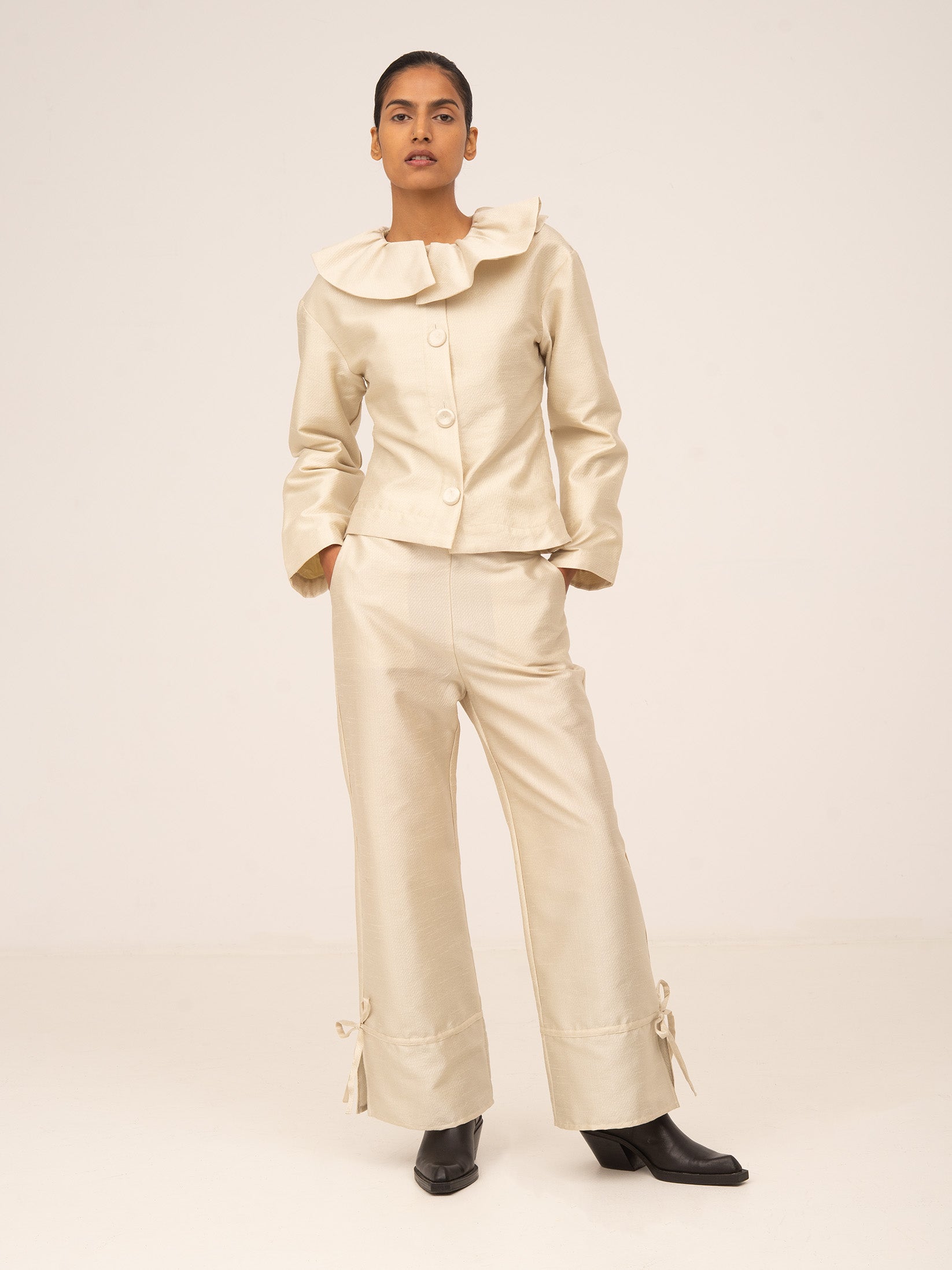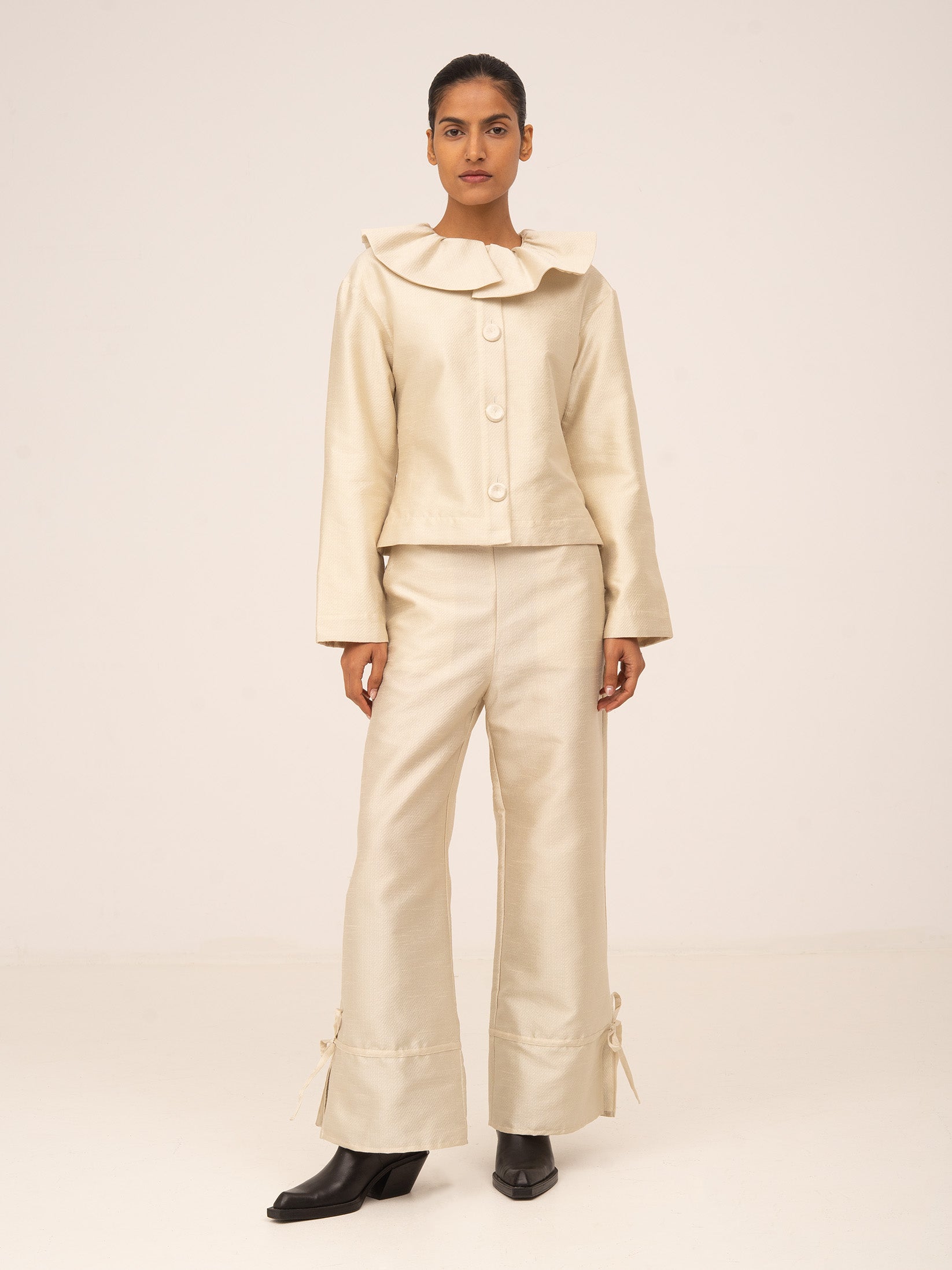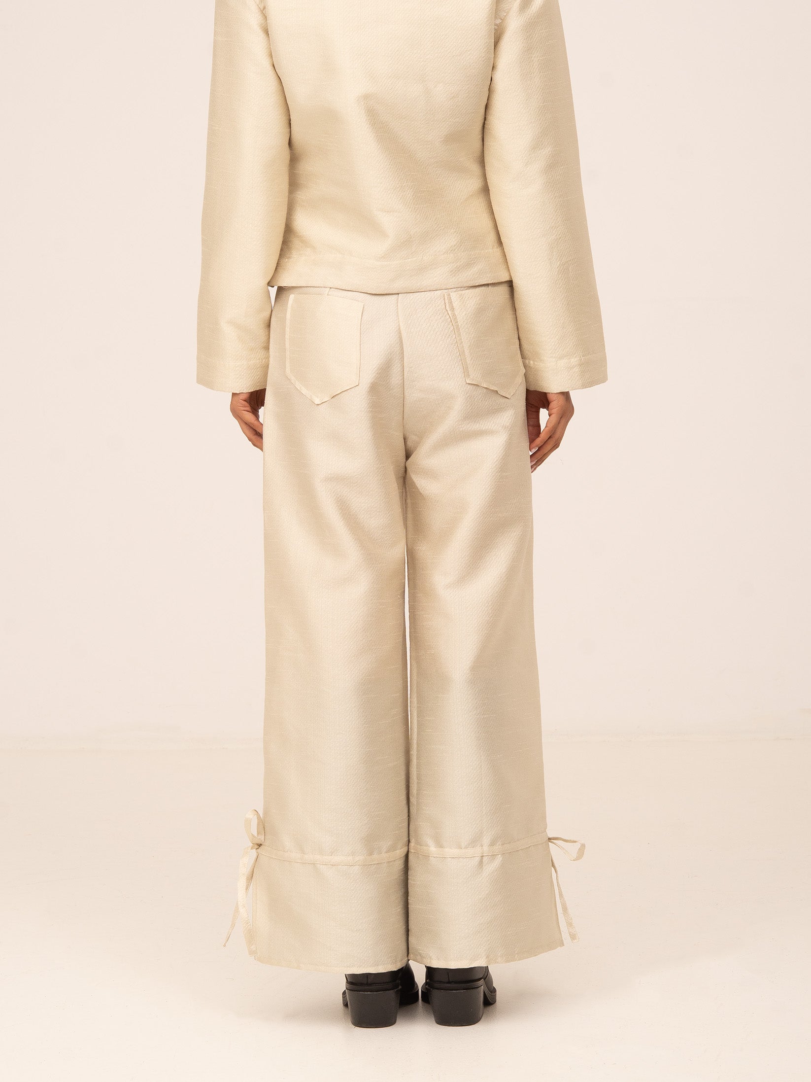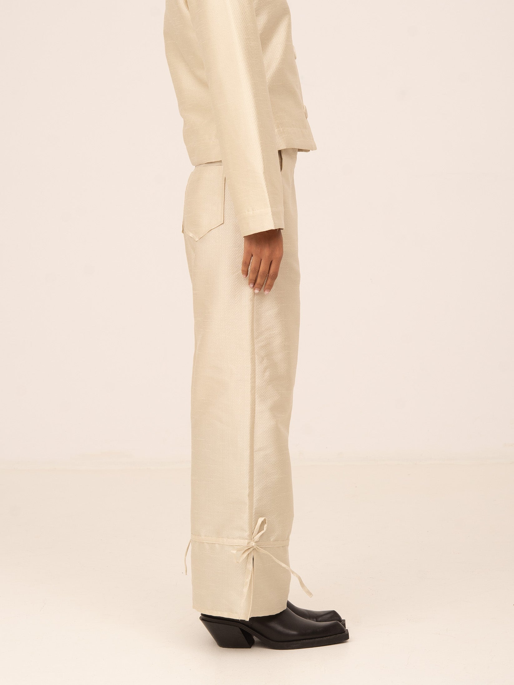 Cream-colored, shiny fabric trousers with tie detail at the hem. Side zip opening.