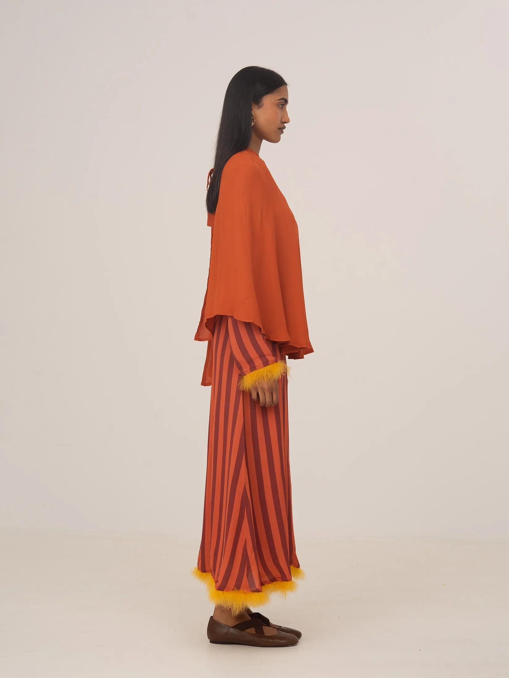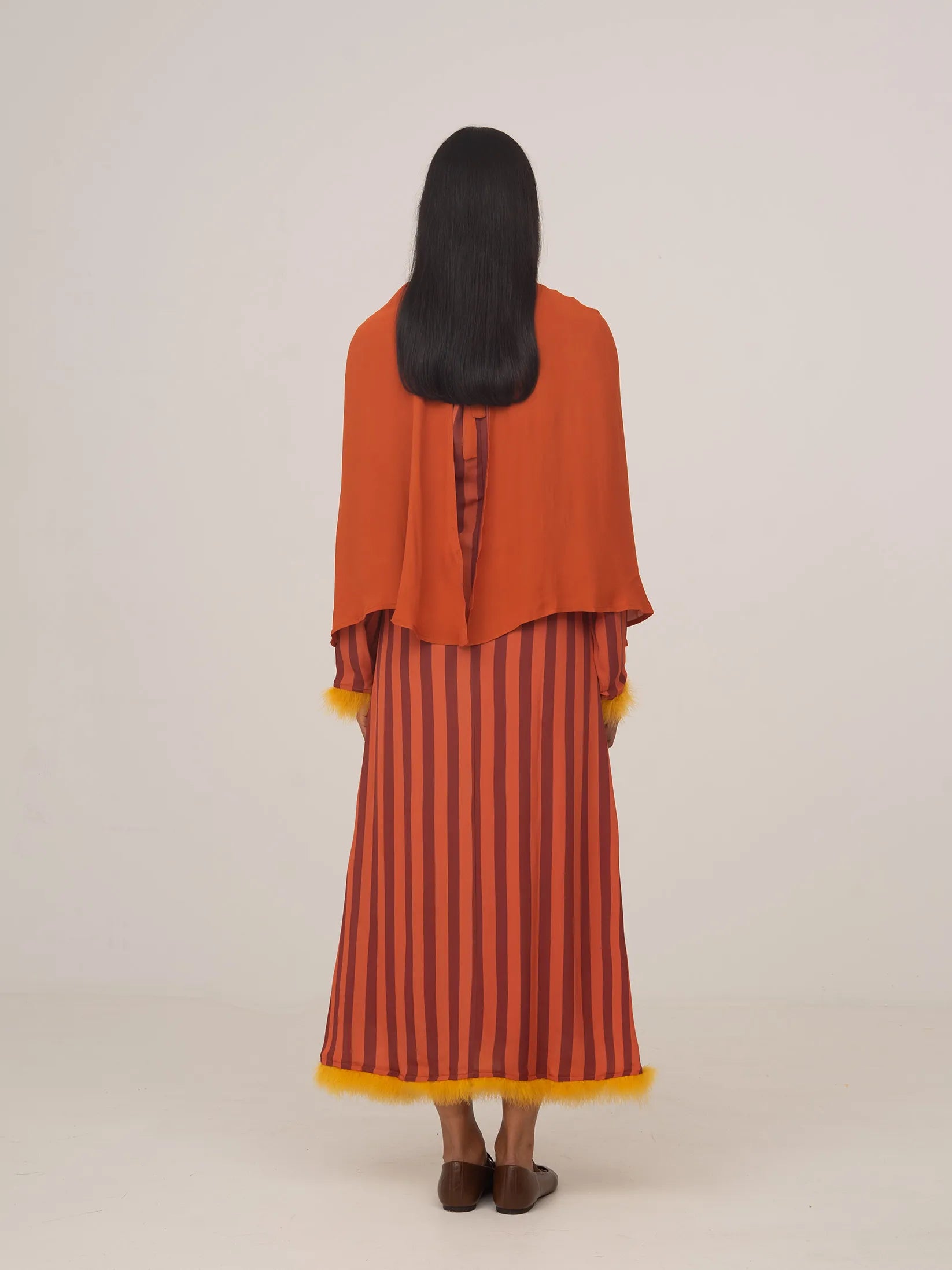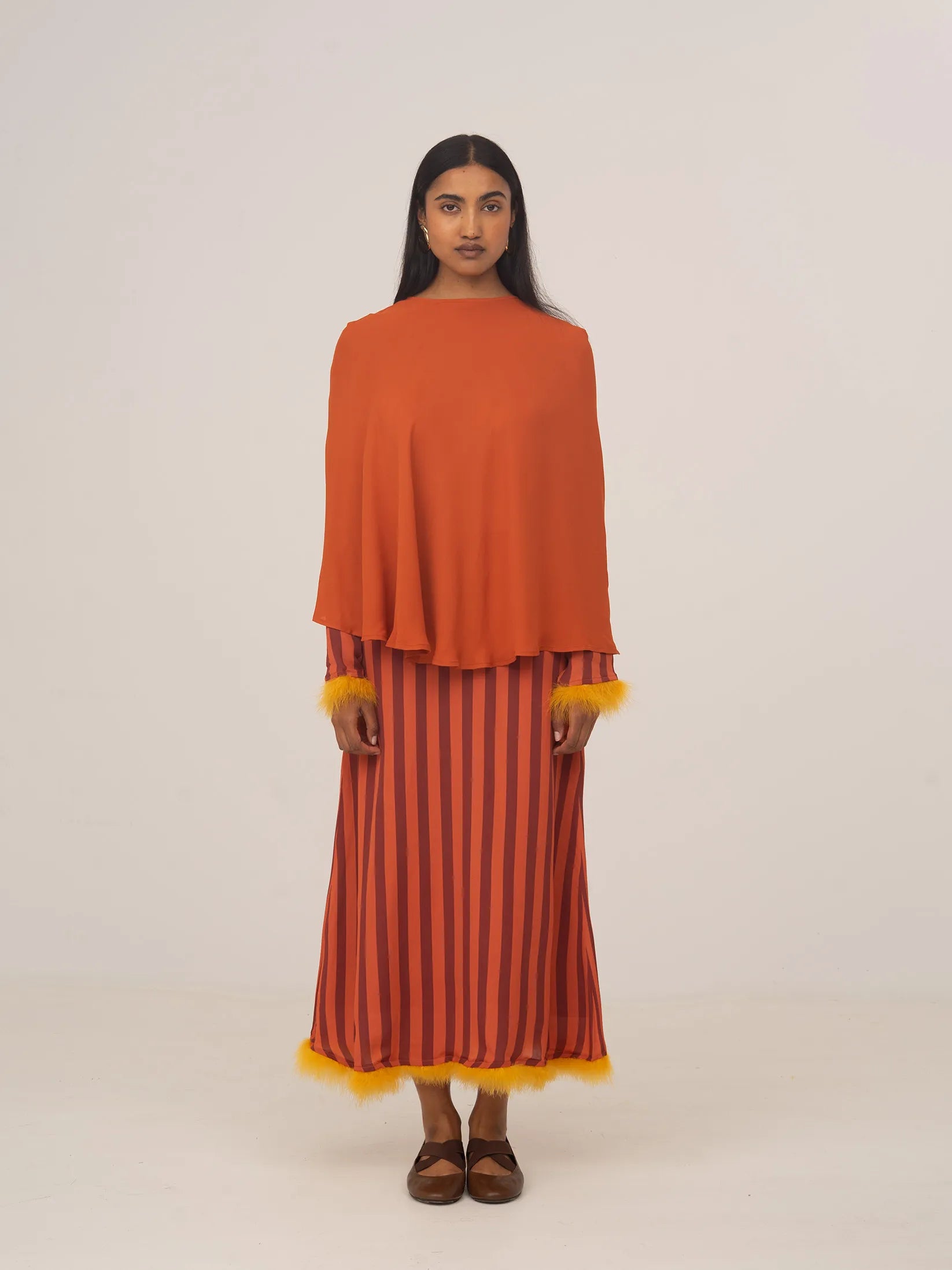 Elegant orange-toned guest cape, ideal for elevating any occasion look.
