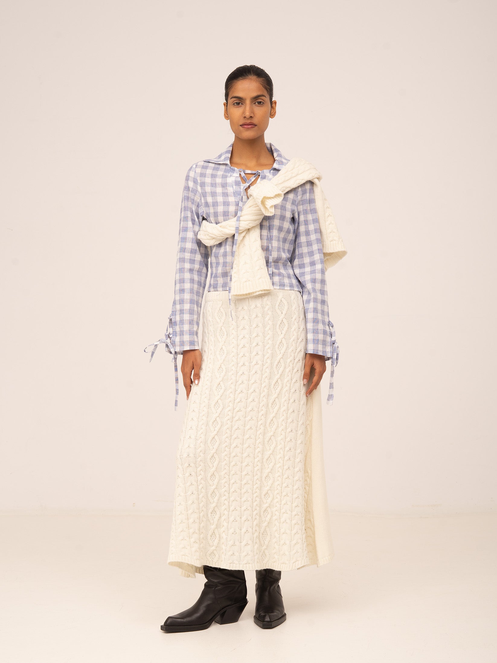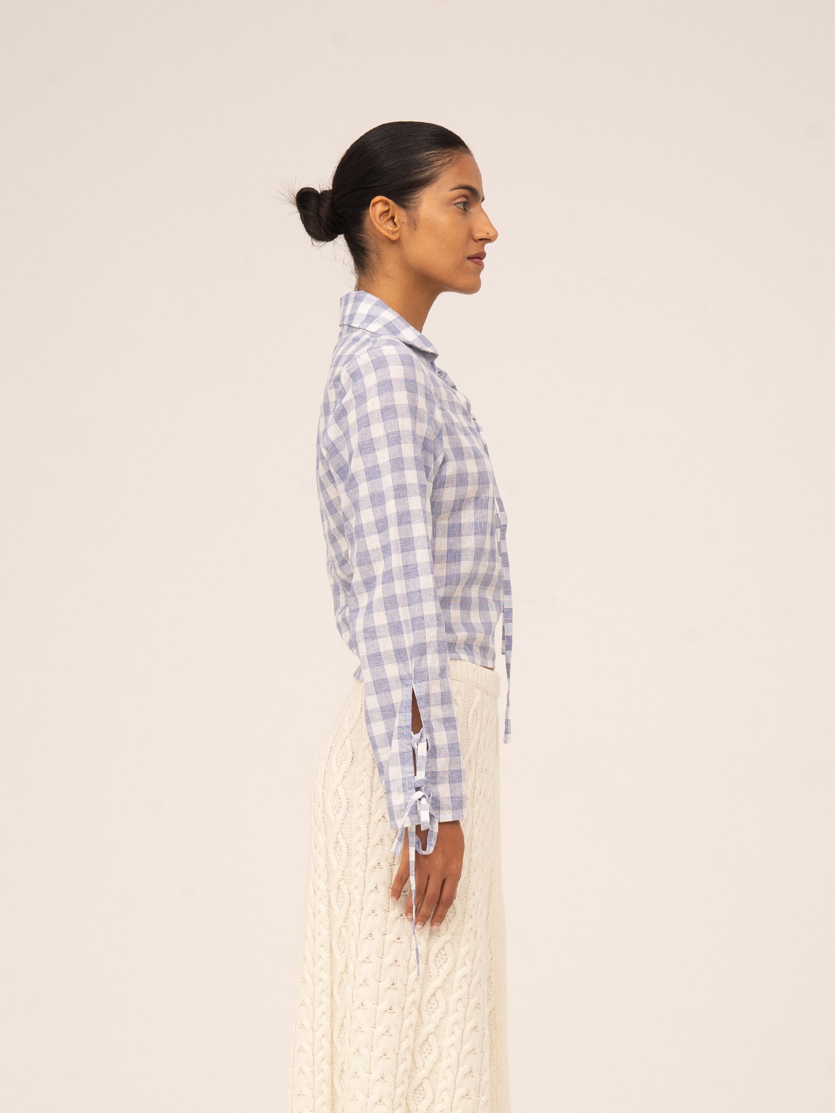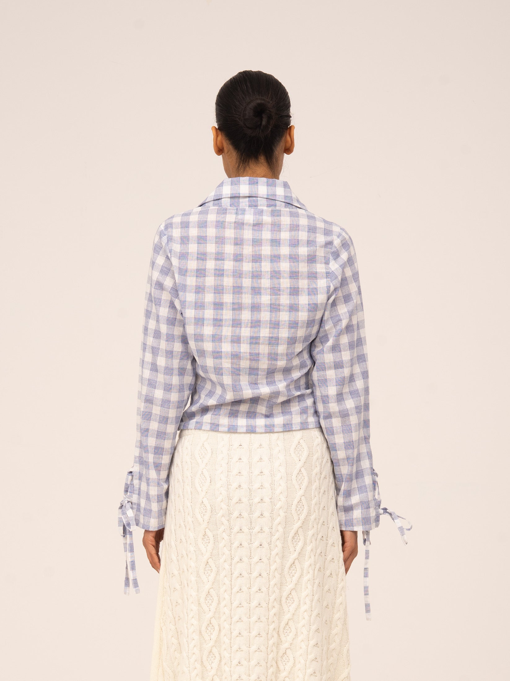 Crafted from a lightweight blue plaid fabric, this shirt redefines classic style with modern, feminine details. The bow at the neckline and cuffs adds a delicate touch, while the tailored fit flatters the figure. The invisible side zip ensures a snug and comfortable fit.