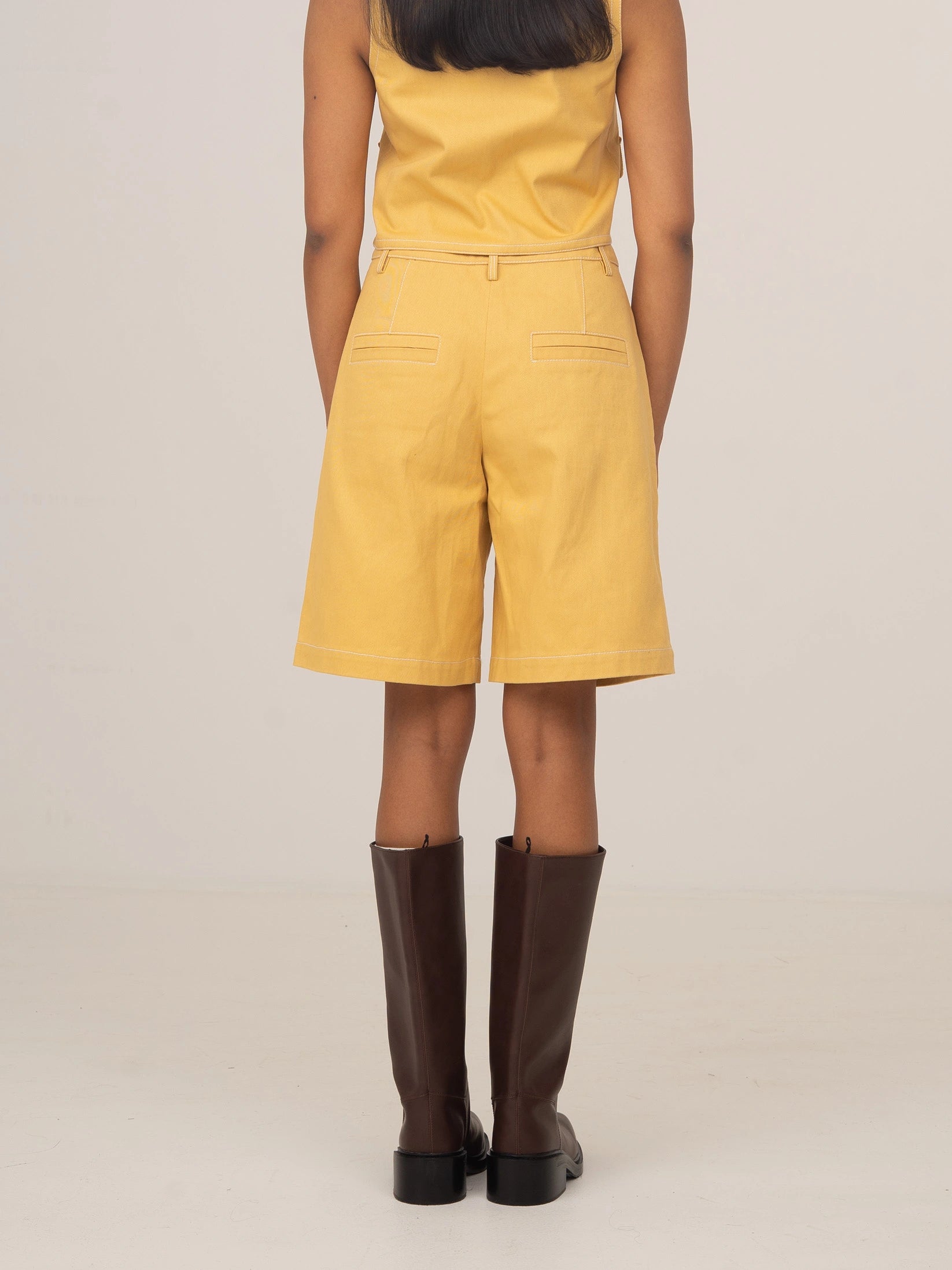Made from denim, these Bermuda shorts feature a structured design with darts at the waistband for a flattering and elegant fit. The zip and button closure ensures comfort, while the pale yellow hue adds a fresh and contemporary touch.