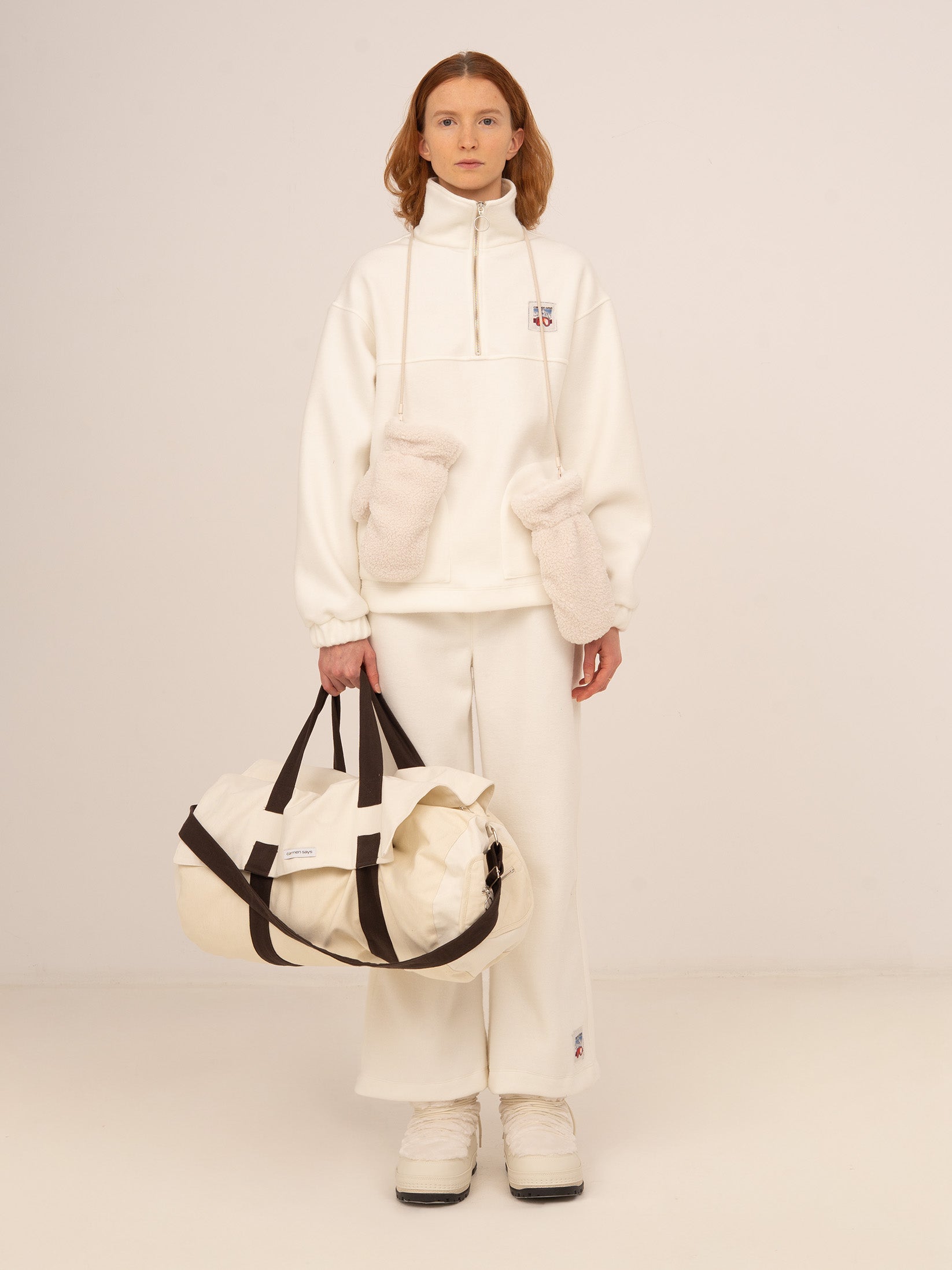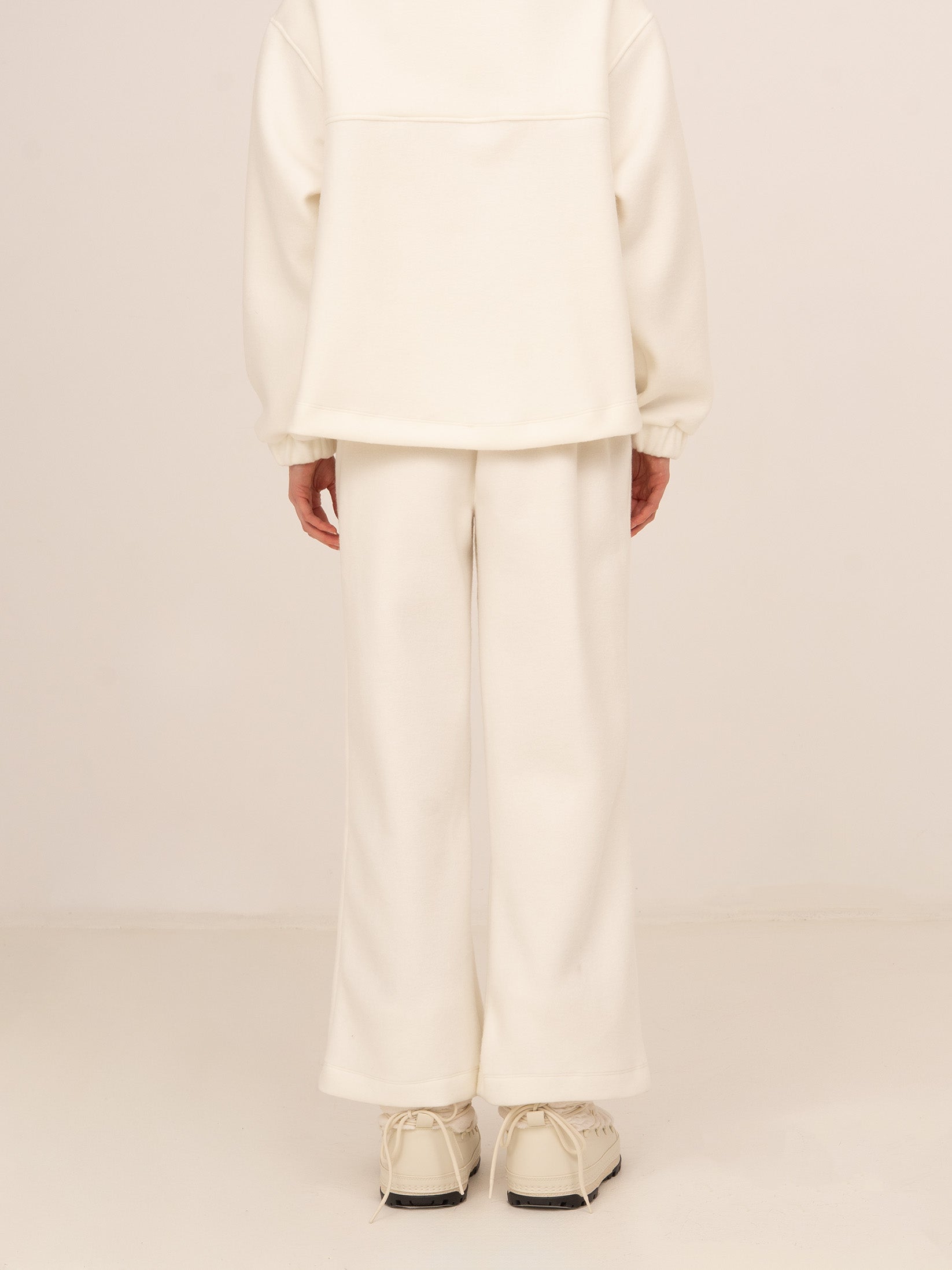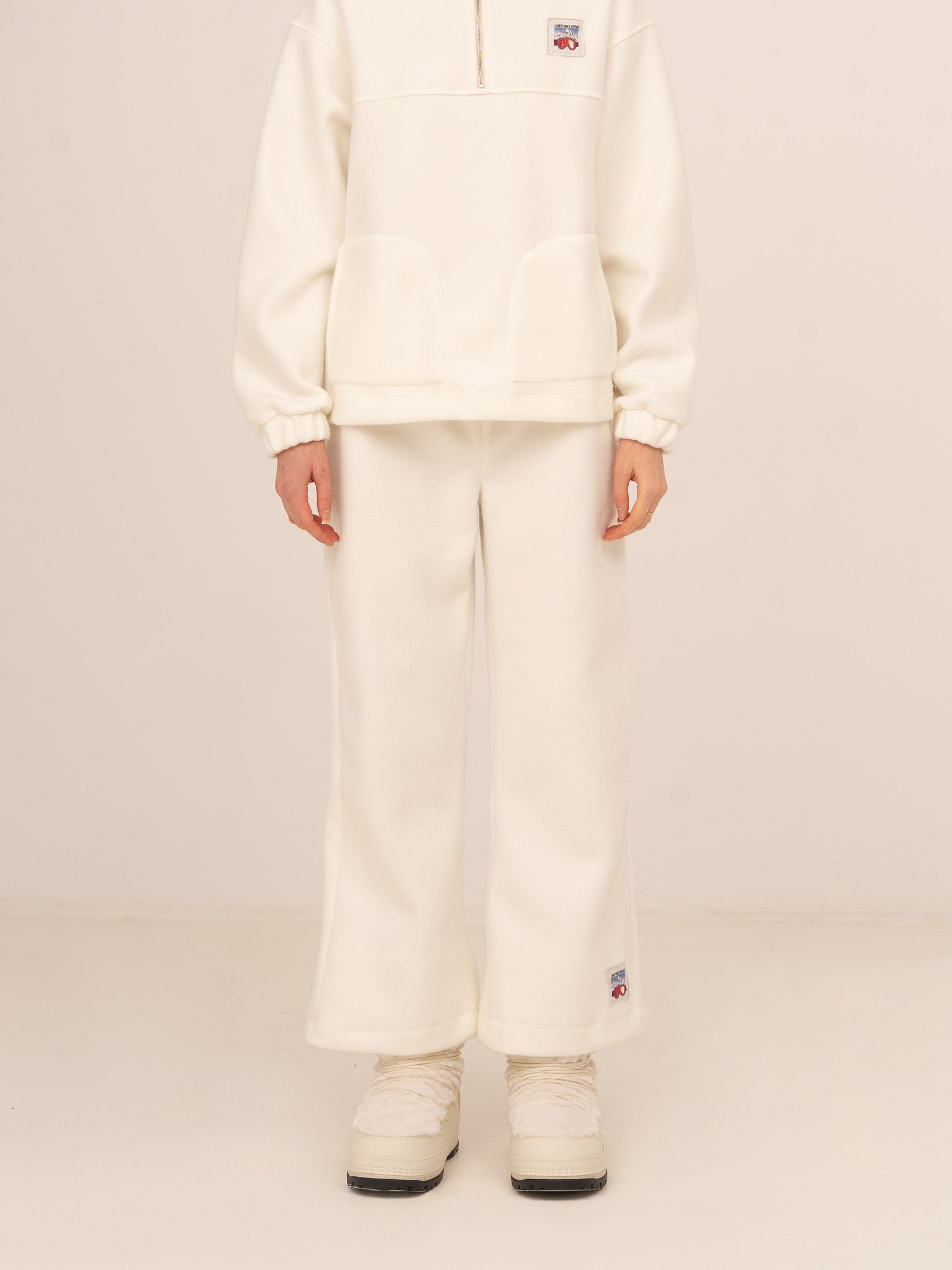 Pants flare with brown side stripe, with waist elastic and detail of the patch on the bass .