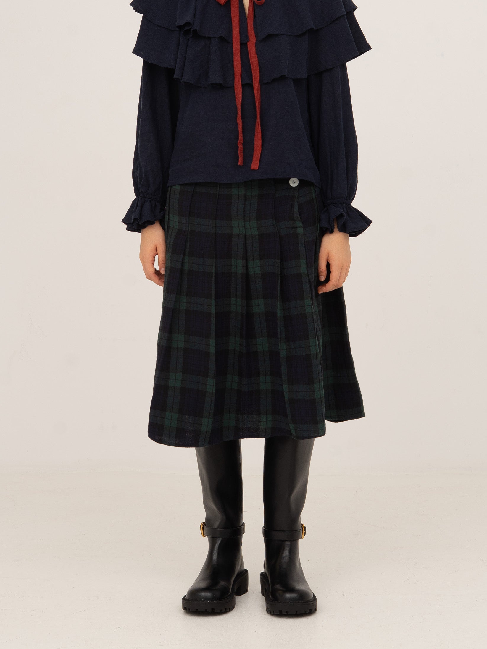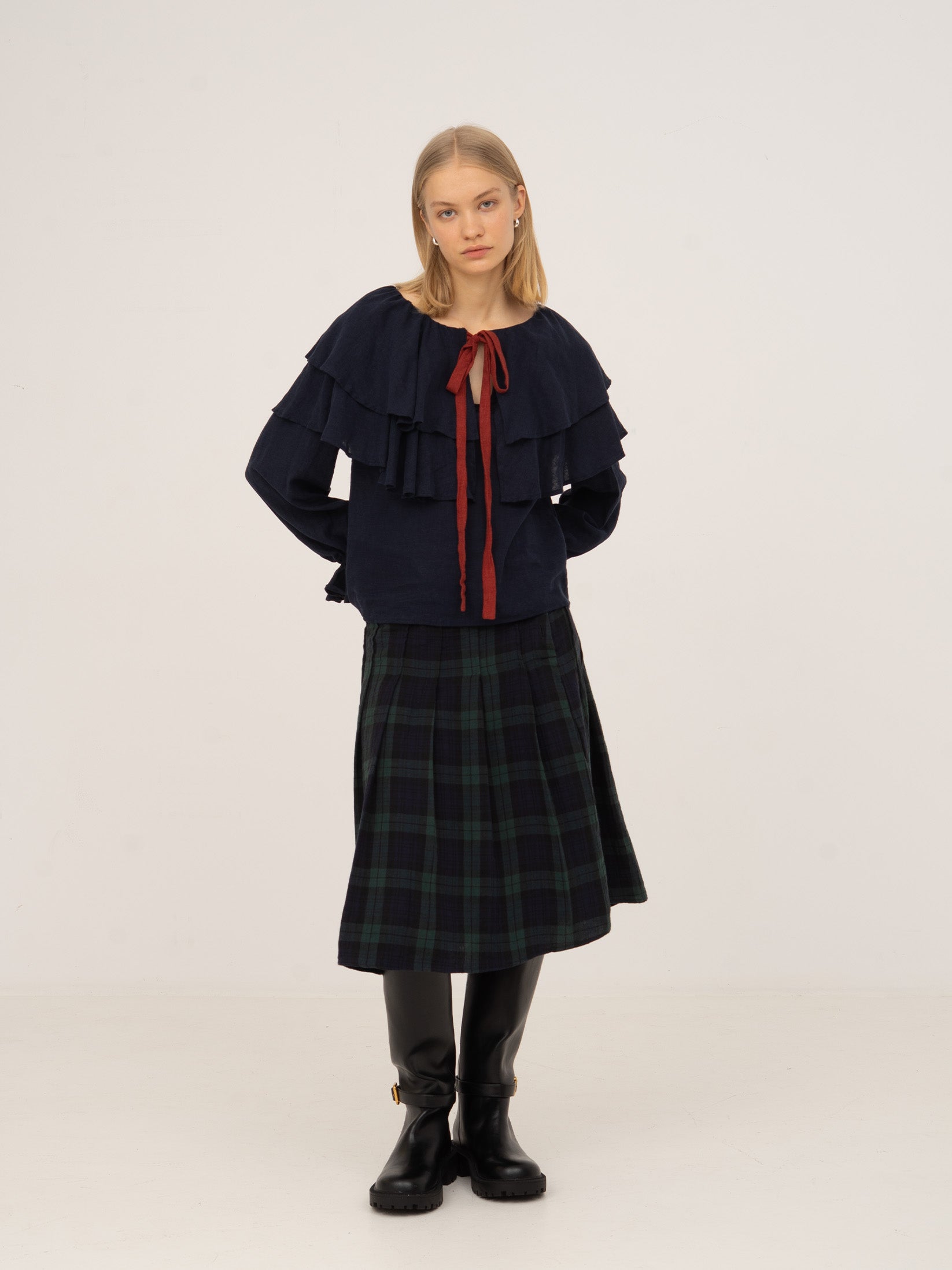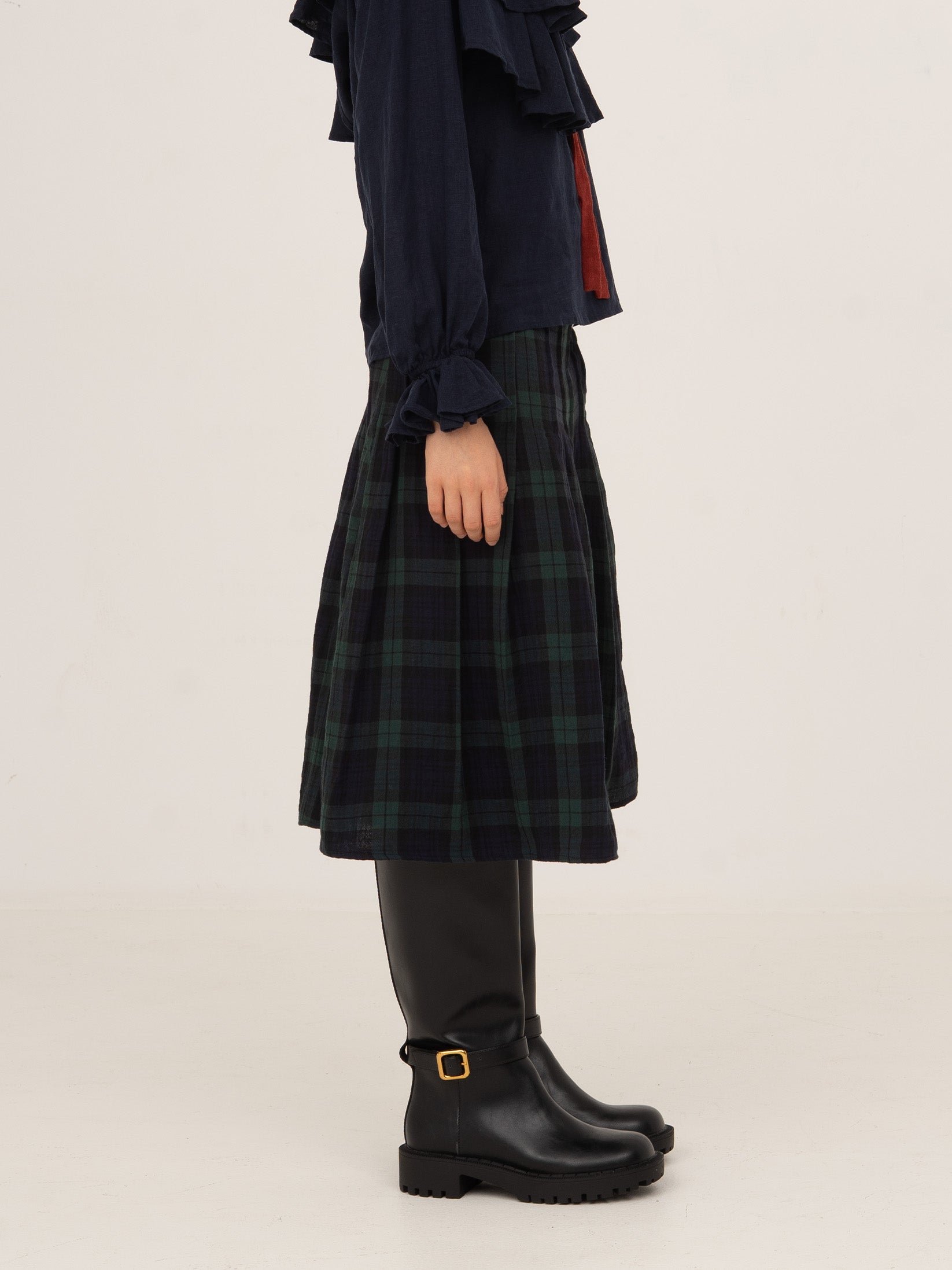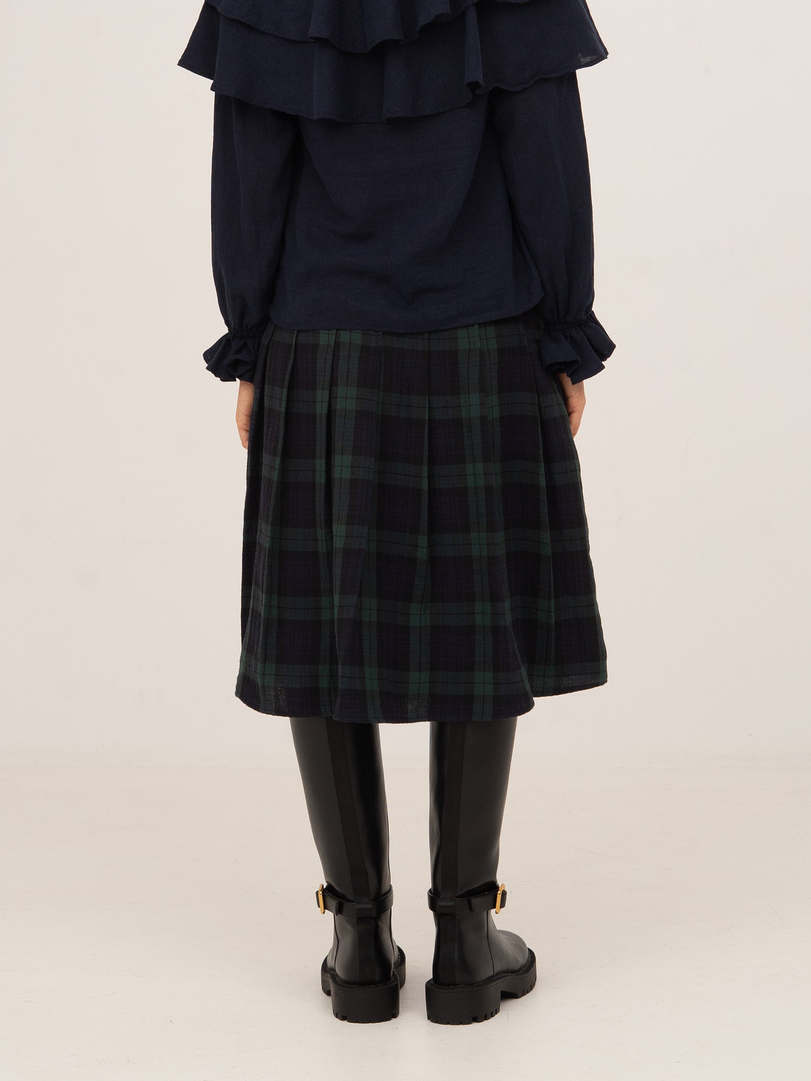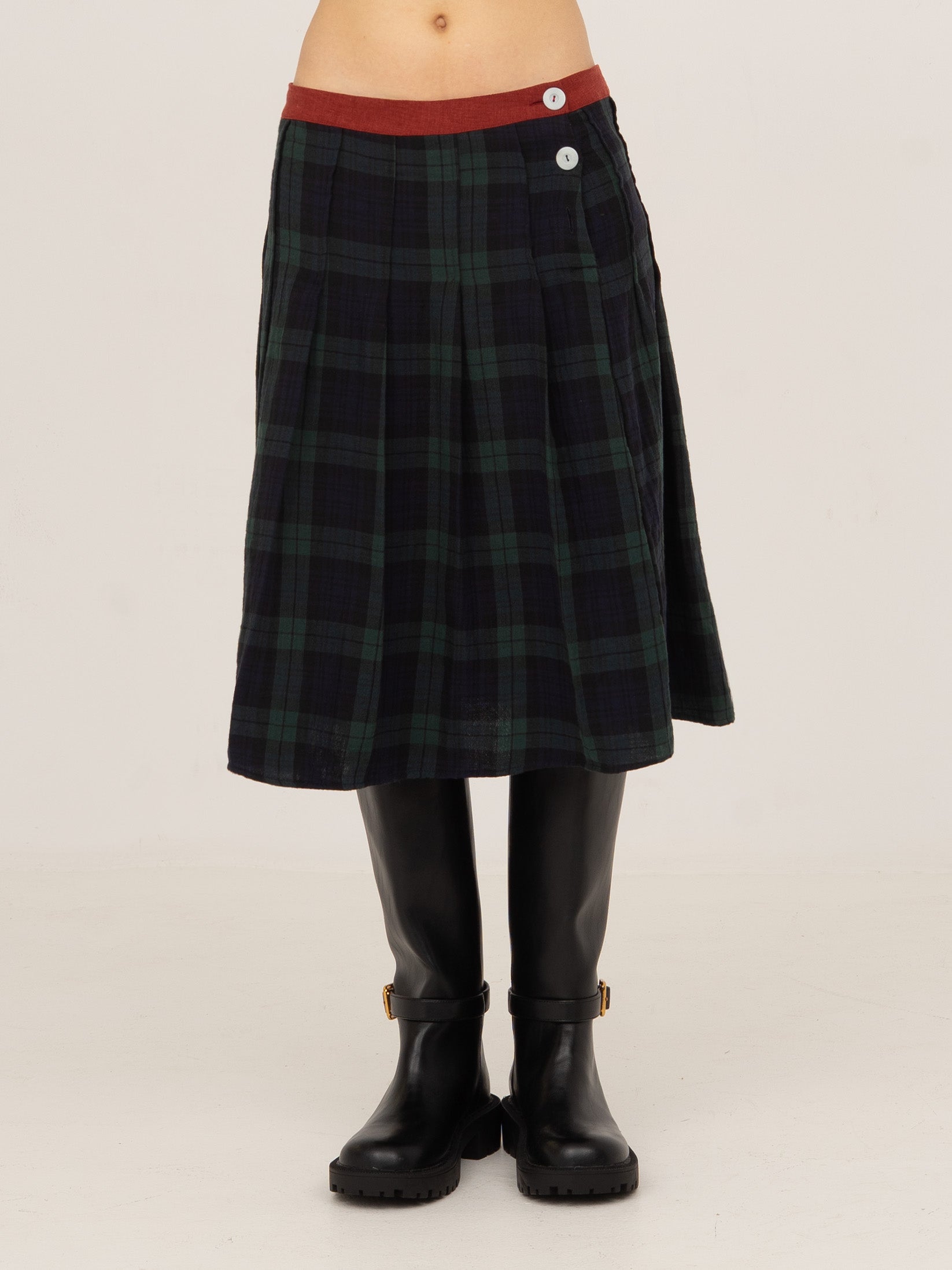 The Evermore midi skirt combines the timeless elegance of plaid fabric with a modern, structured feel. Its pleated design in shades of blue and red creates movement and texture, while the contrasting waistband defines the silhouette and adds a touch of sophistication.