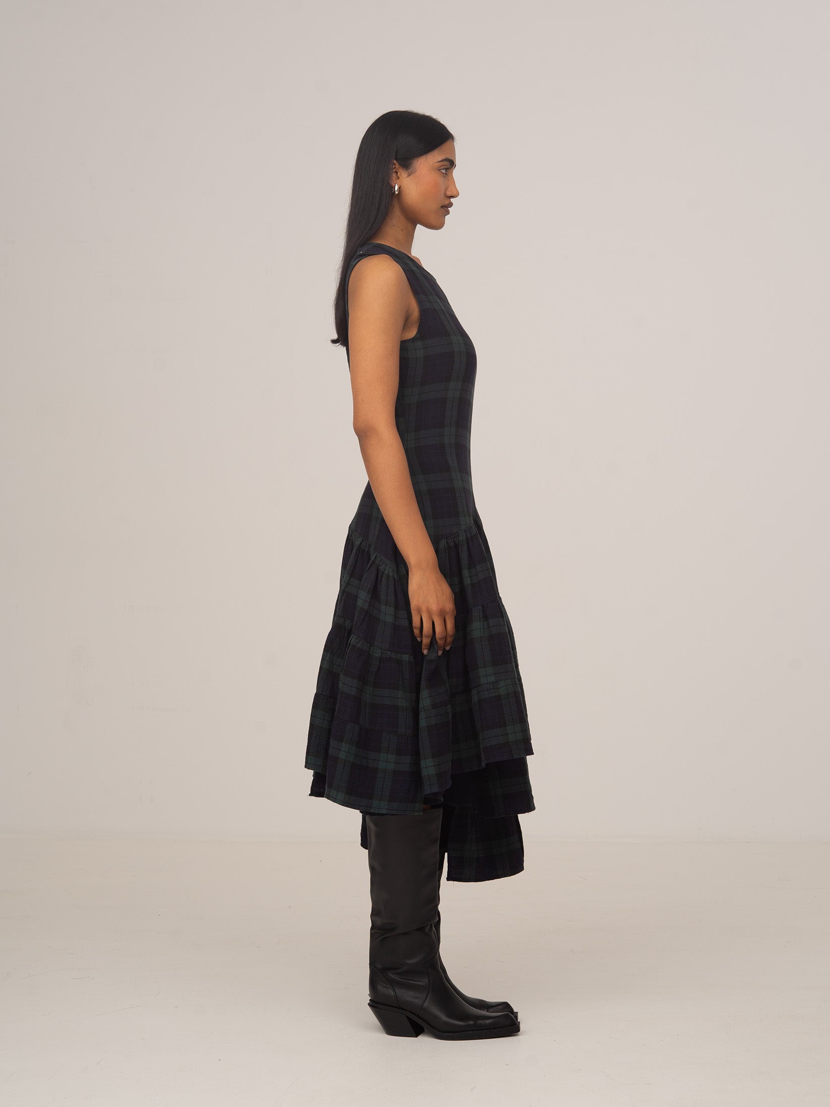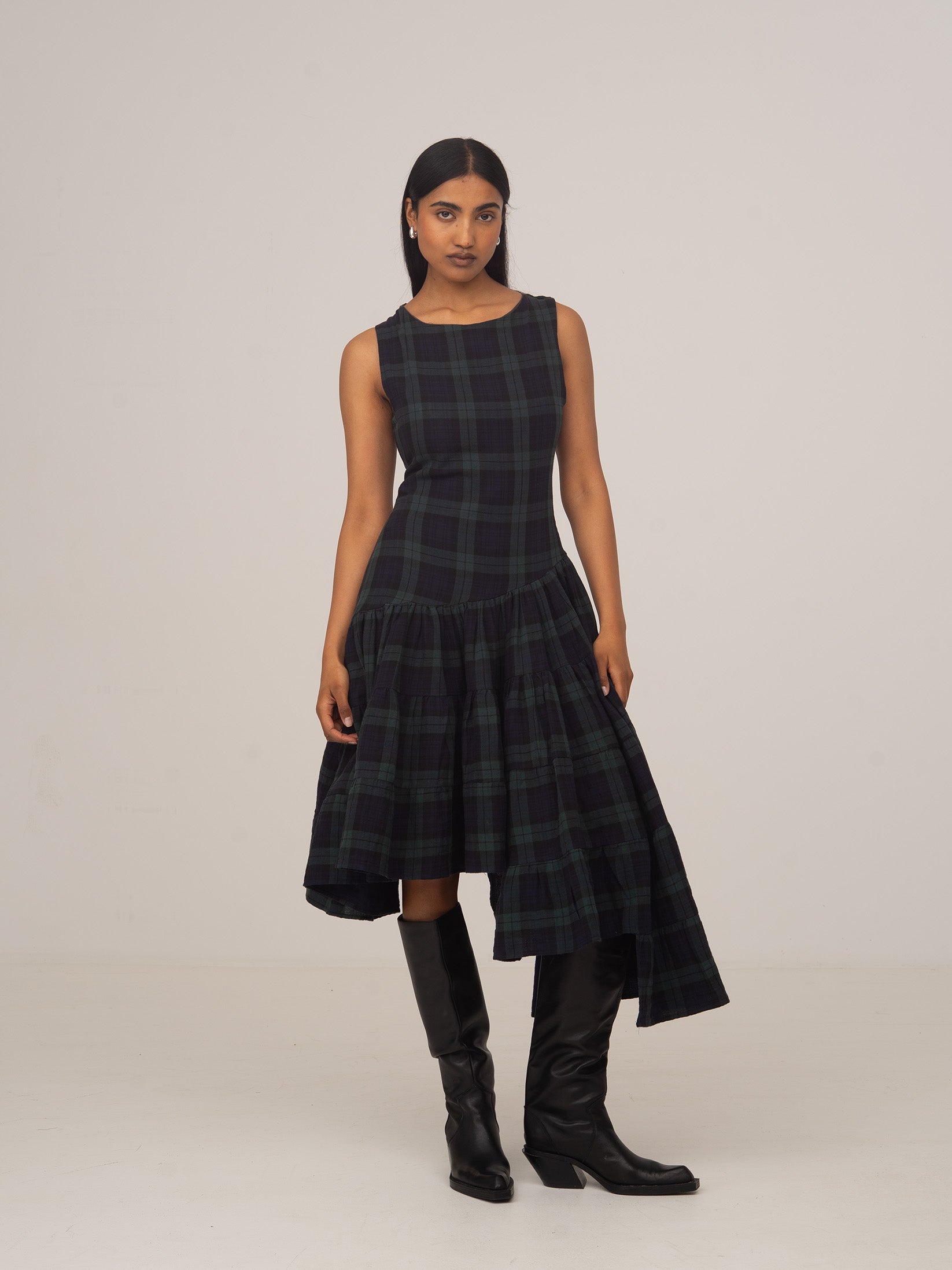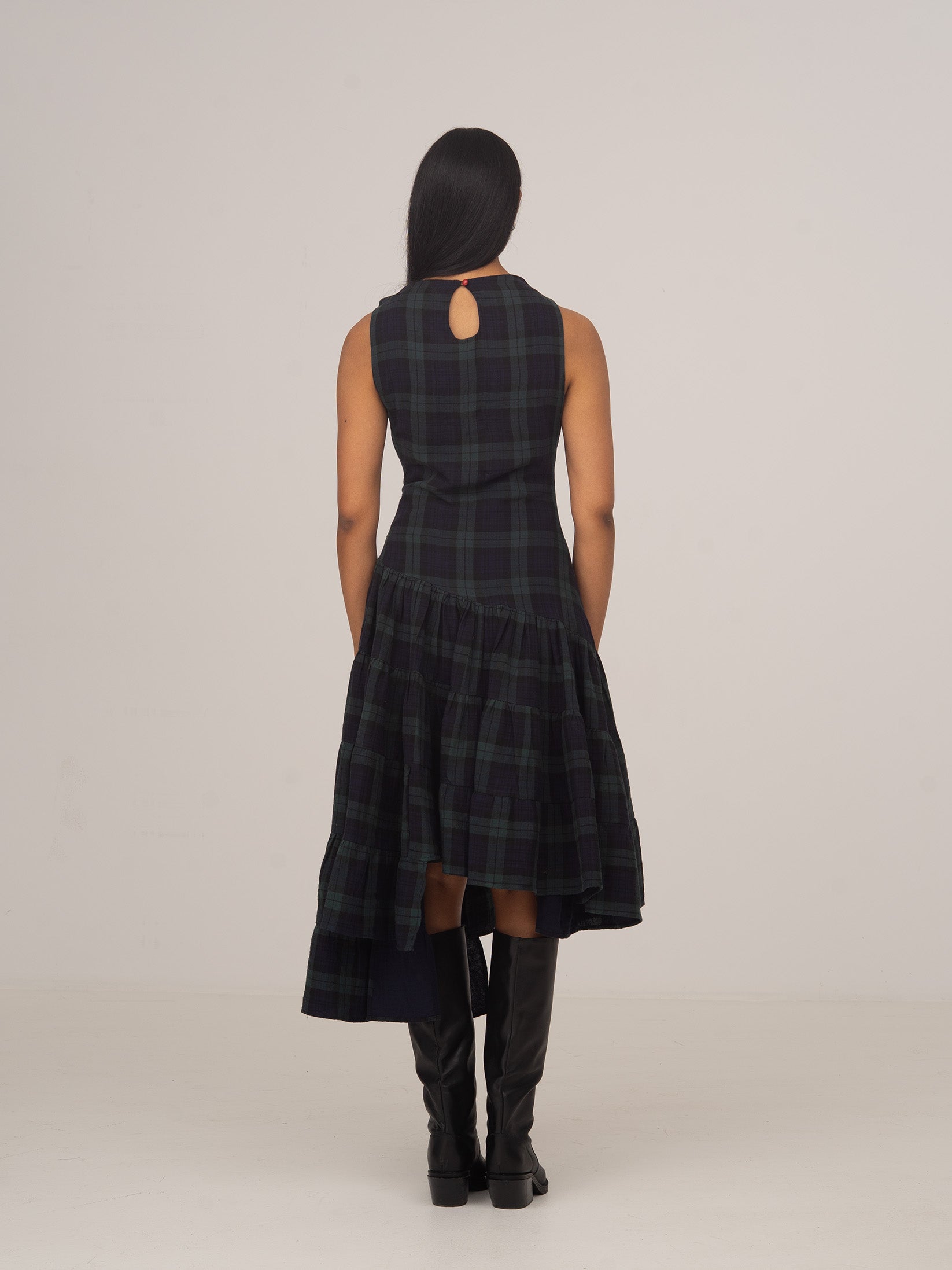 The Evermore plaid maxi dress features a fitted bodice that flatters the figure and flows into an asymmetrical, layered skirt that adds movement and dynamism. With an invisible side zip closure for a clean finish, it includes a delicate teardrop detail at the back that enhances its femininity.