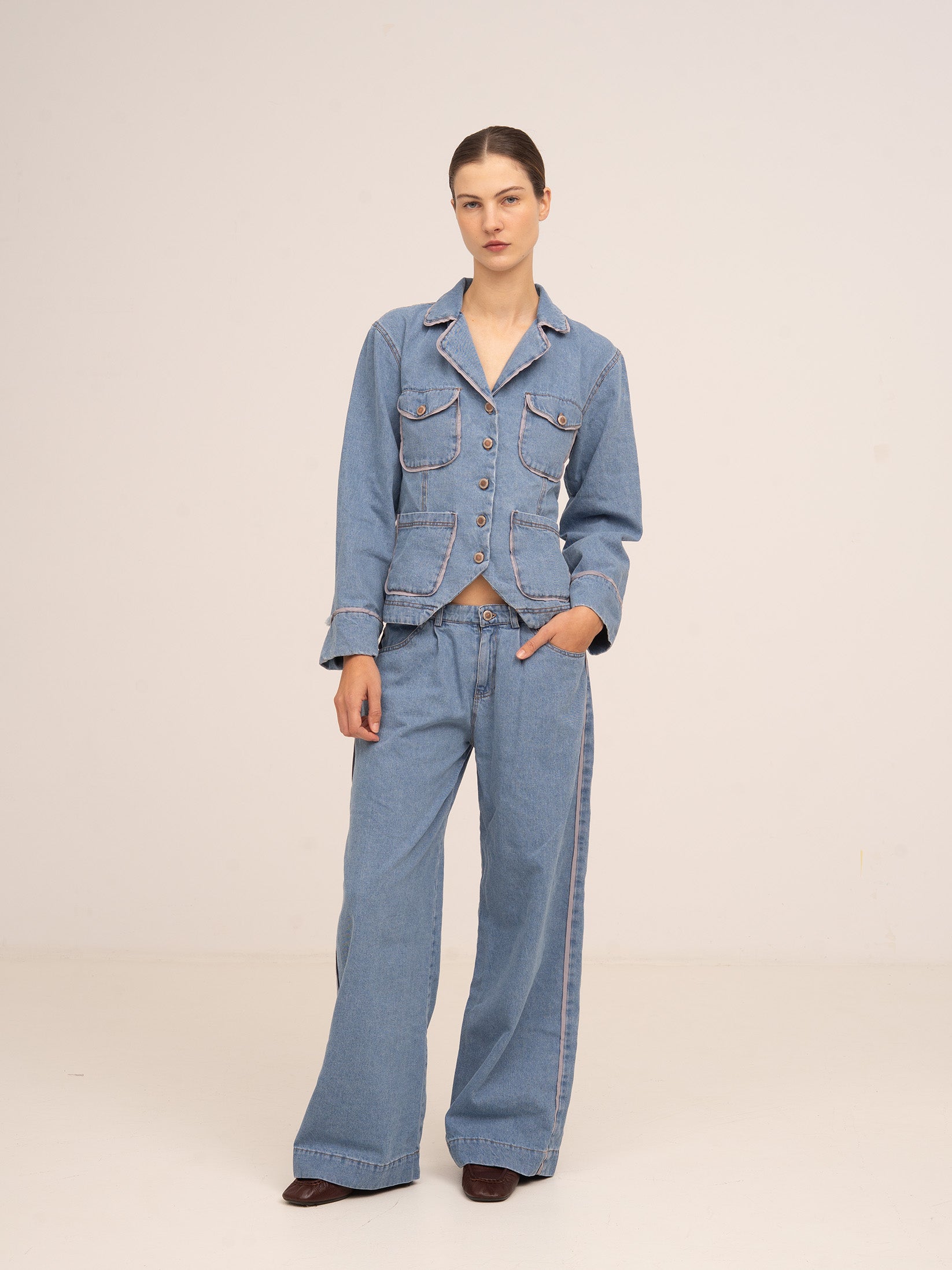 This fitted denim jacket redefines the classic jean with a structured cut that flatters the figure and adds a modern, sophisticated touch. Its sharp seams and contrasting piping brighten the design, while the front pockets add functionality without sacrificing style. The denim fabric is durable yet comfortable, perfect for adding a polished touch to your everyday looks.