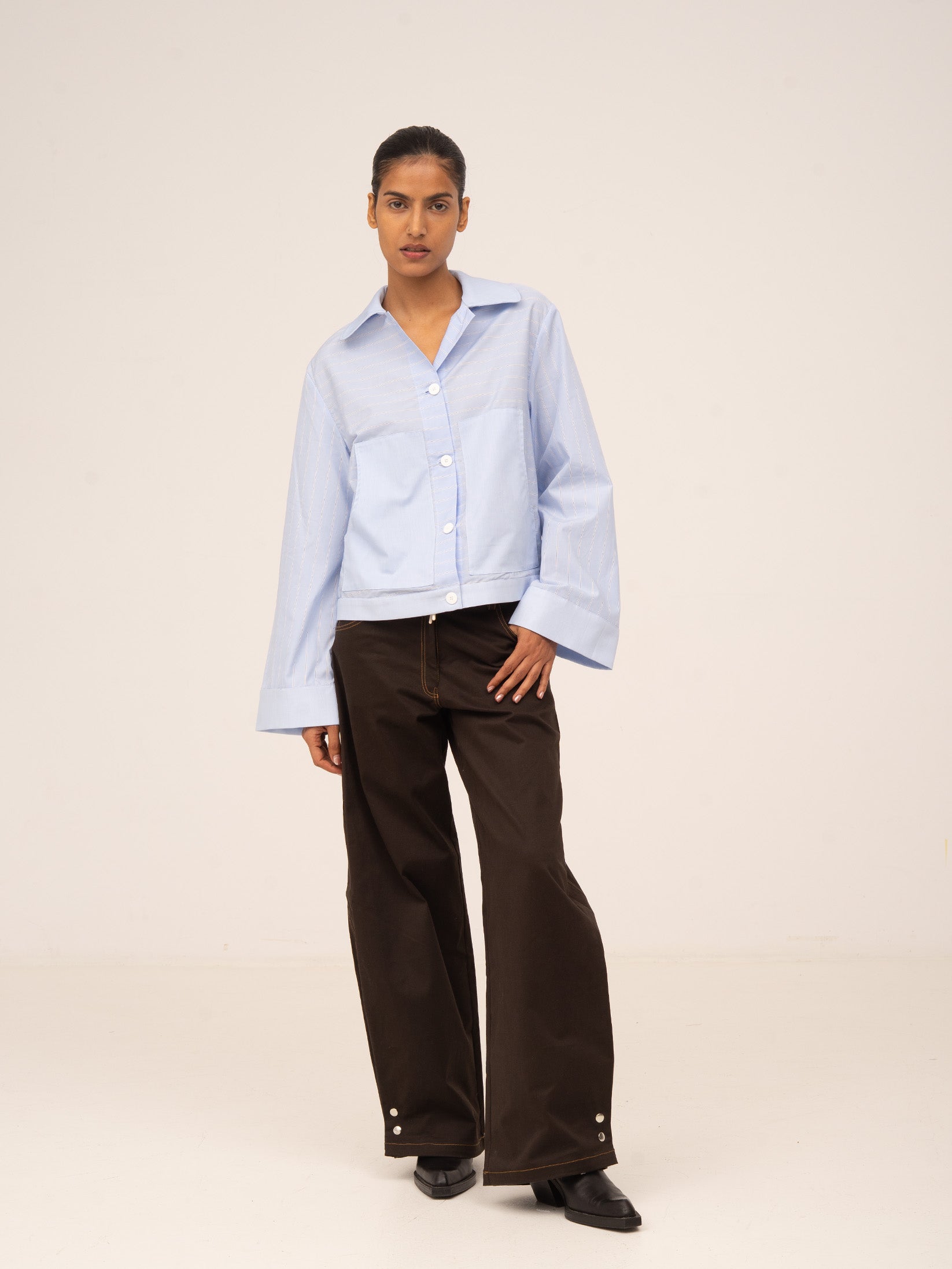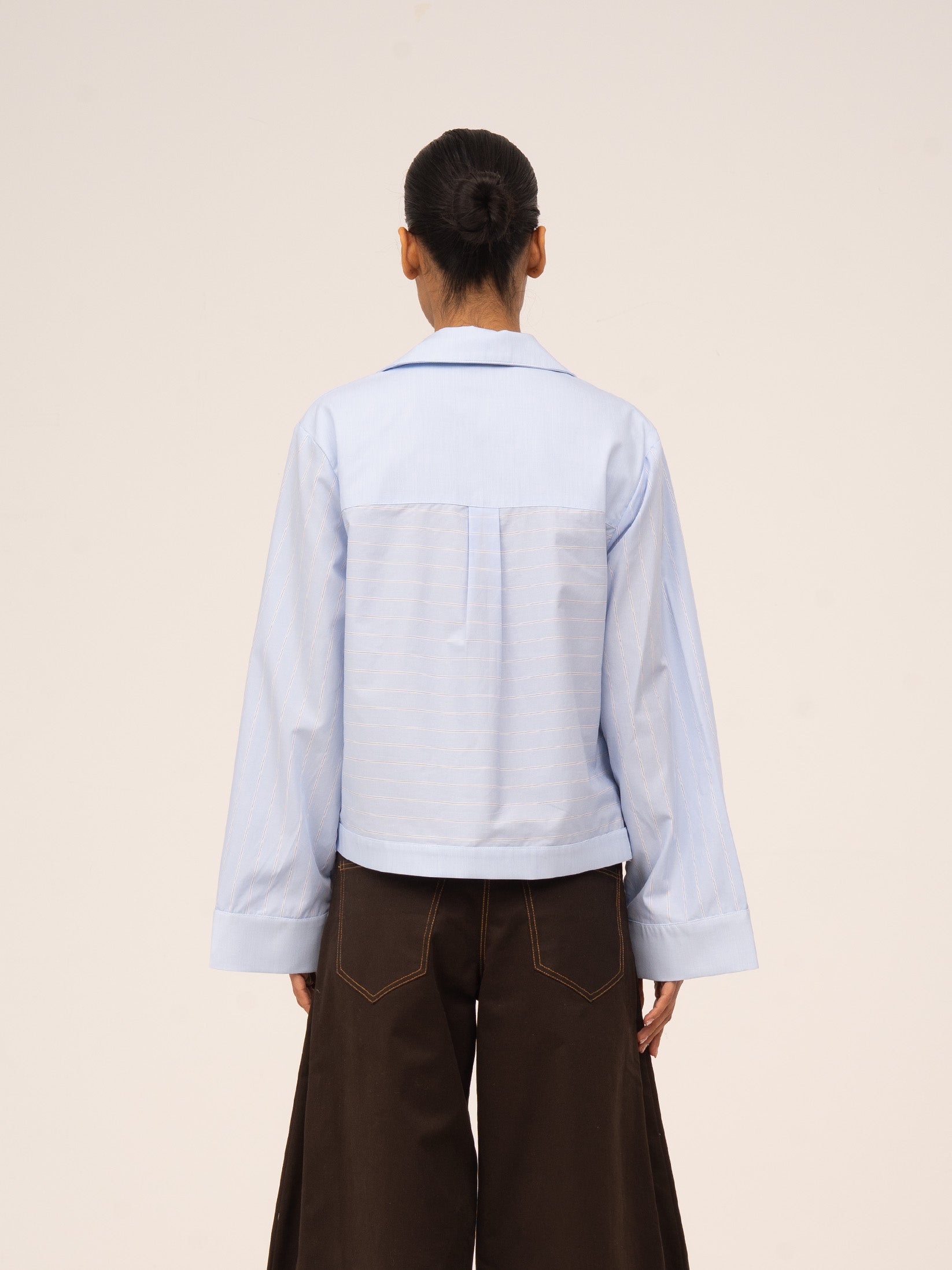 A blue striped shirt with a relaxed silhouette and structured design that blends comfort with contemporary style. Defined seams and front patch pockets add a touch of utilitarian elegance, while the center button placket provides a polished and versatile finish. Crafted from a lightweight and comfortable fabric, this blue striped shirt is perfect for effortlessly stylish looks, whether for everyday wear or as part of minimalist outfits with a modern twist.