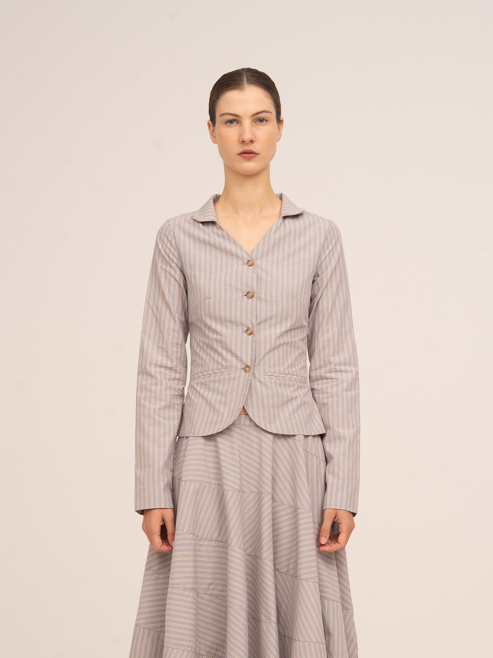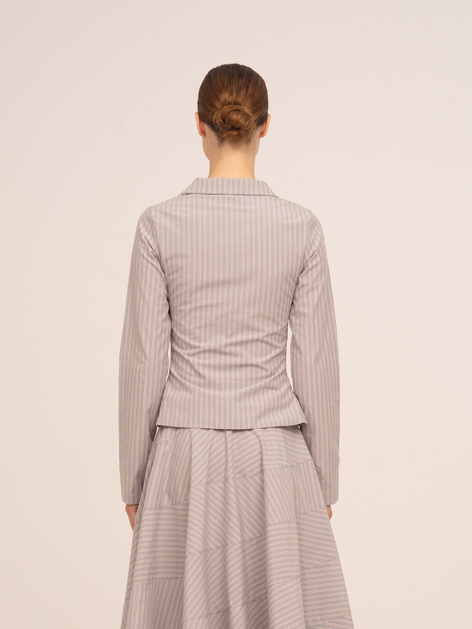 Fitted gray striped shirt with an elegant design and feminine fit.