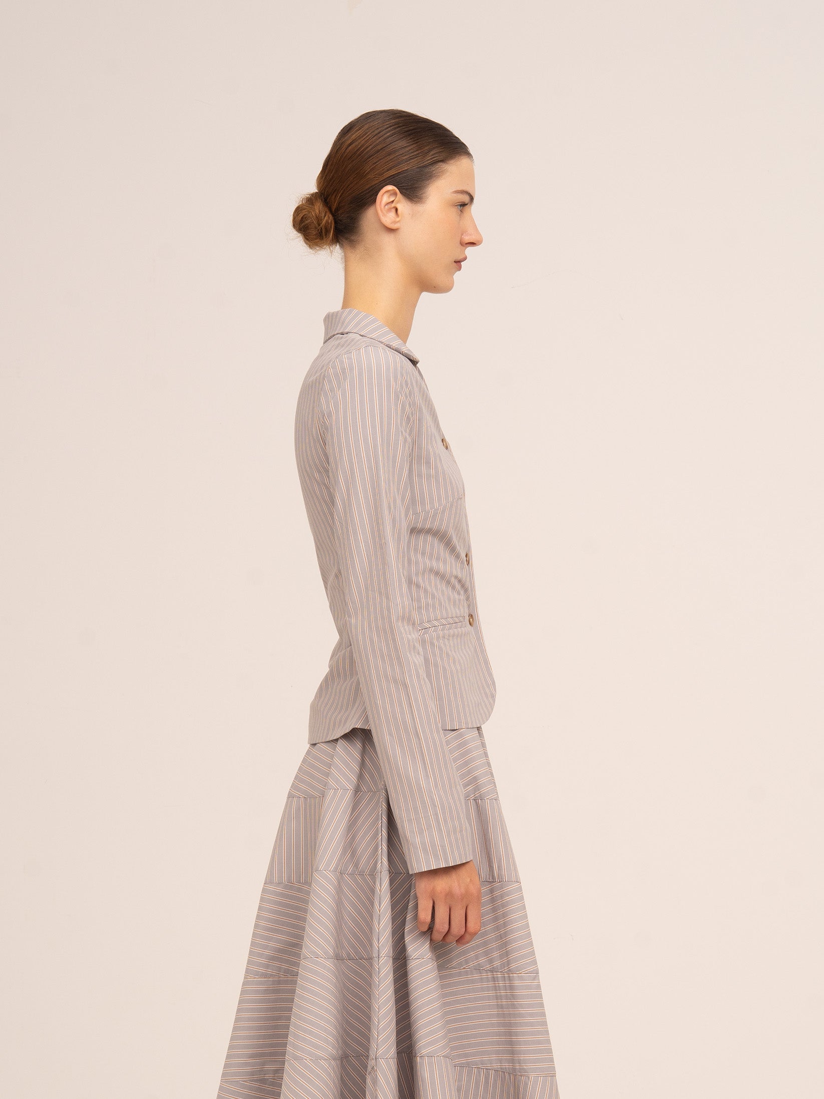 This soft gray striped shirt redefines the classic shirt style with a tailored cut that flatters the figure and adds a touch of sophistication. Its traditional collar and button-front closure maintain its timeless appeal, while the fitted waist creates a delicate and flattering silhouette. The lightweight, soft-to-the-touch fabric offers all-day comfort, perfect for polished looks without sacrificing ease of wear.