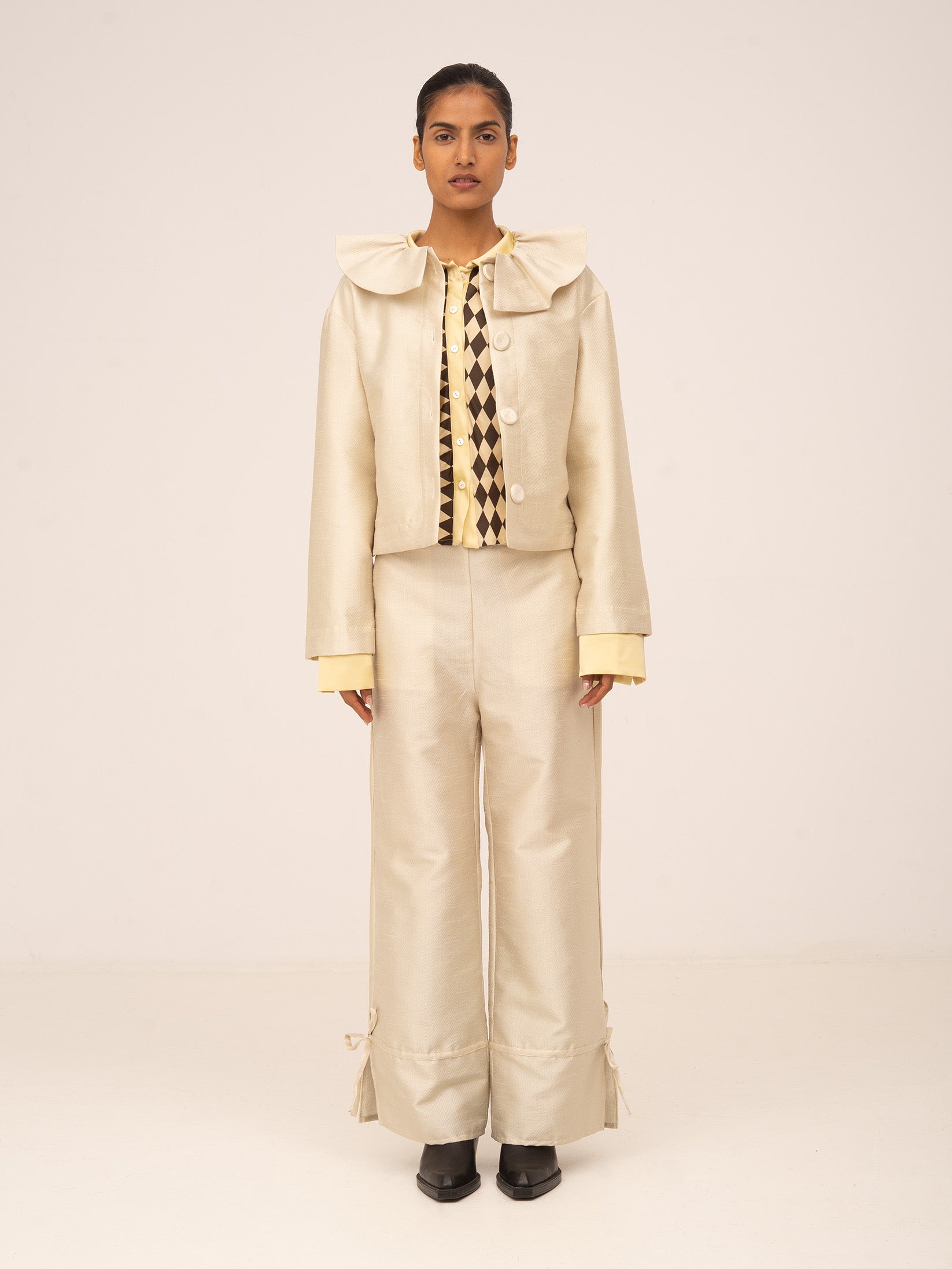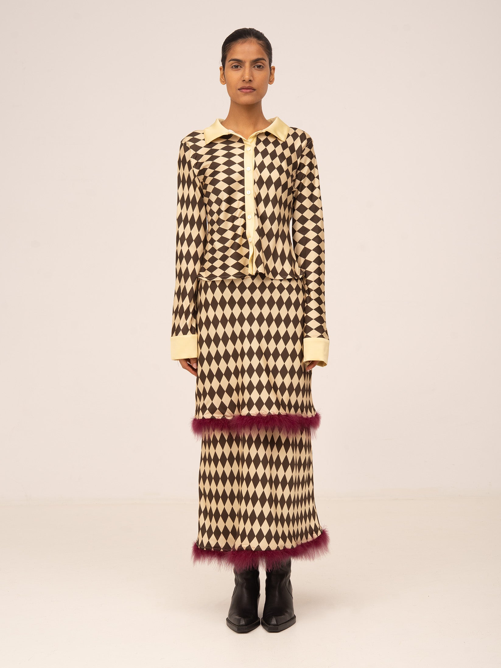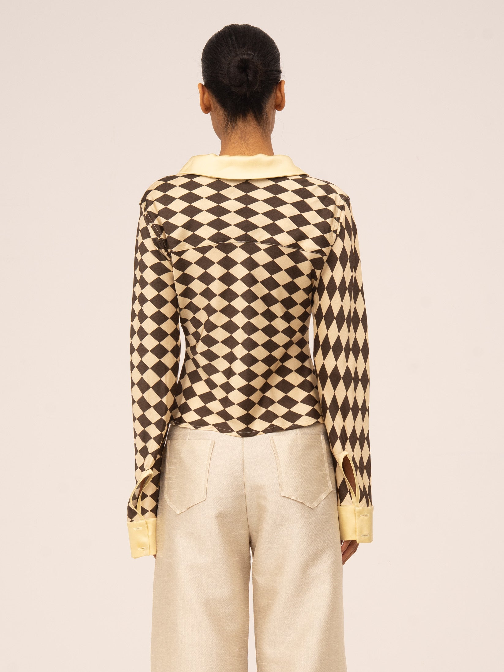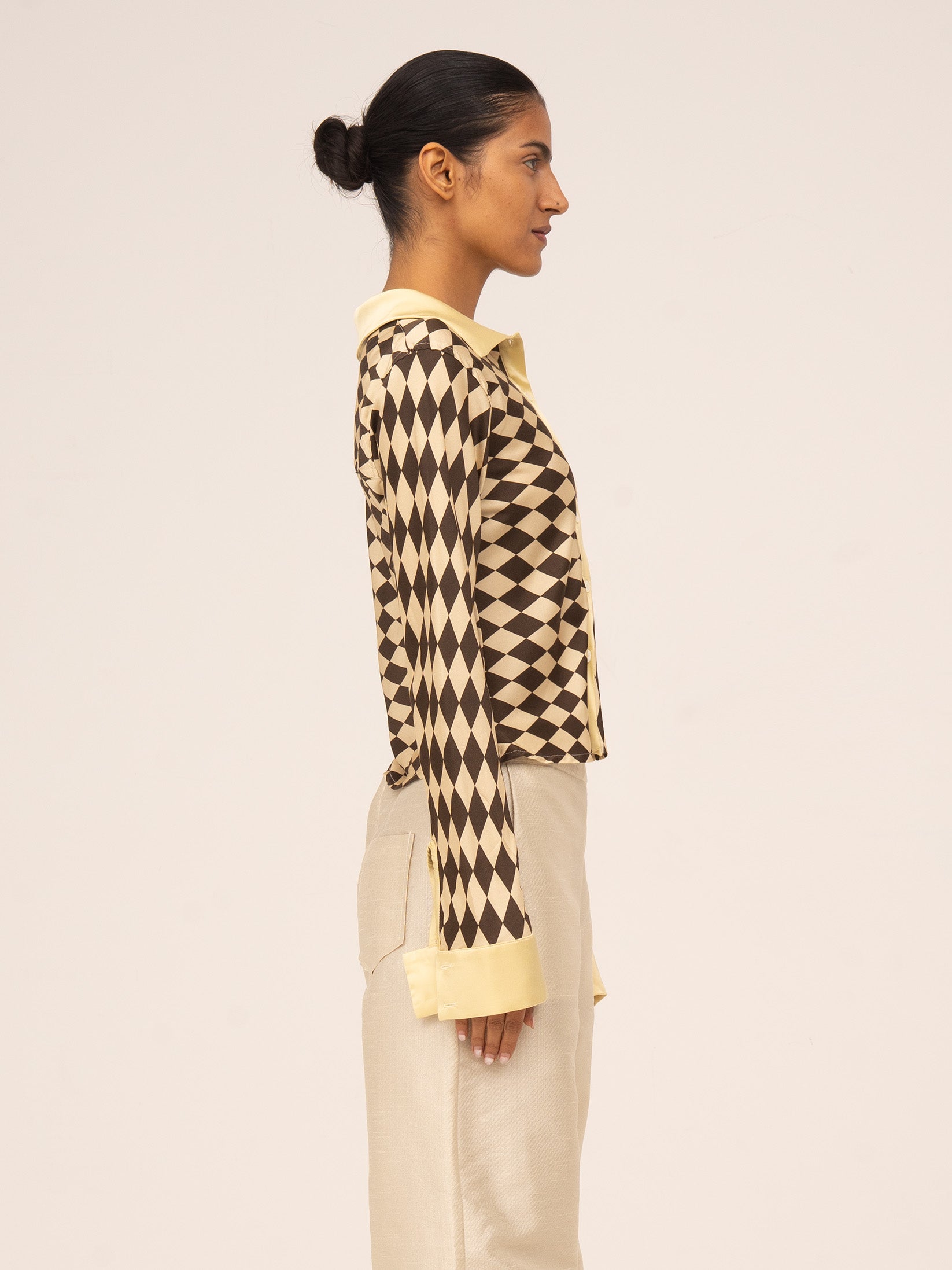 A fitted shirt with a diamond pattern in cream and brown tones, an elegant and contemporary piece that adds structure and personality to the look.