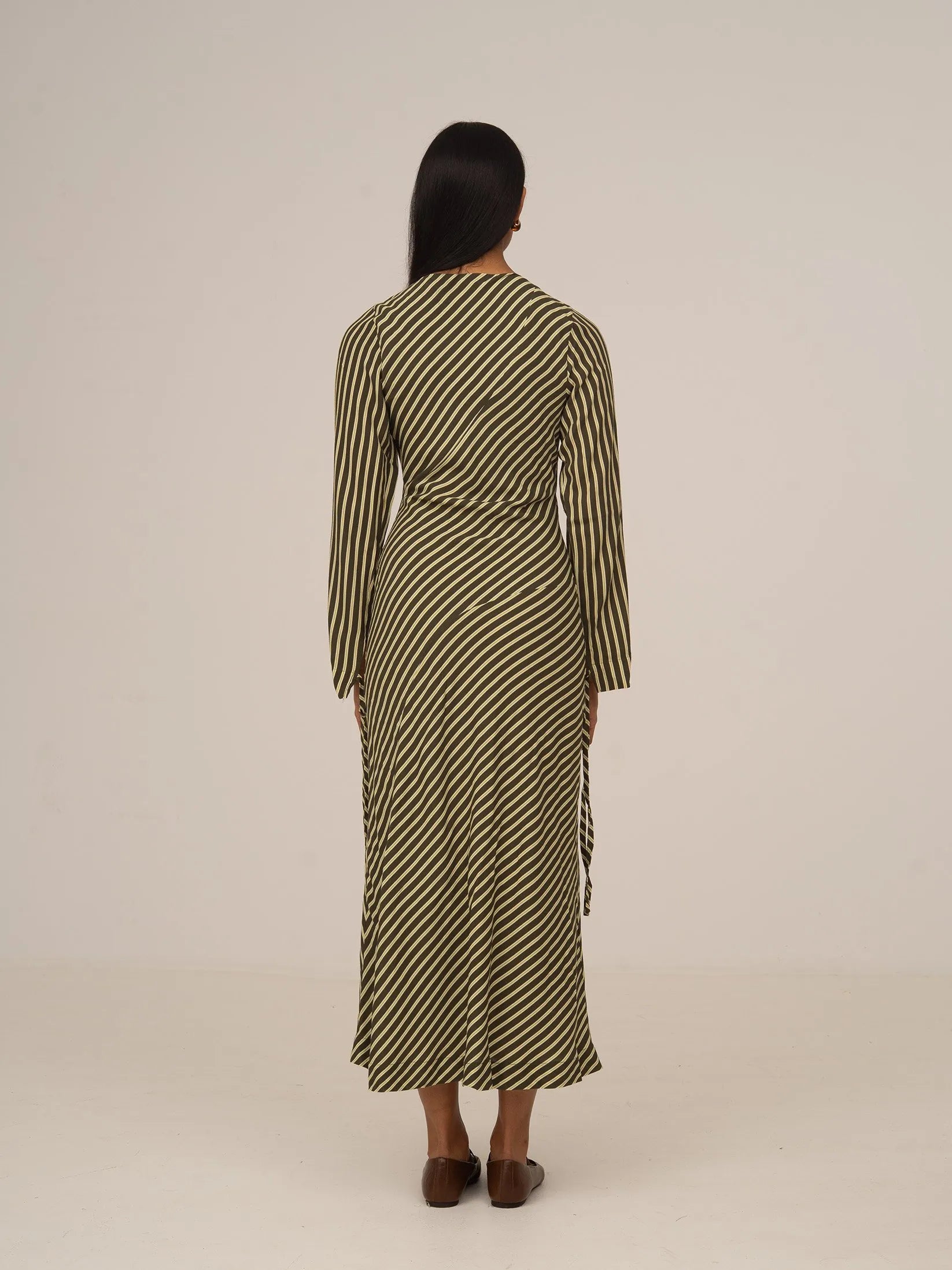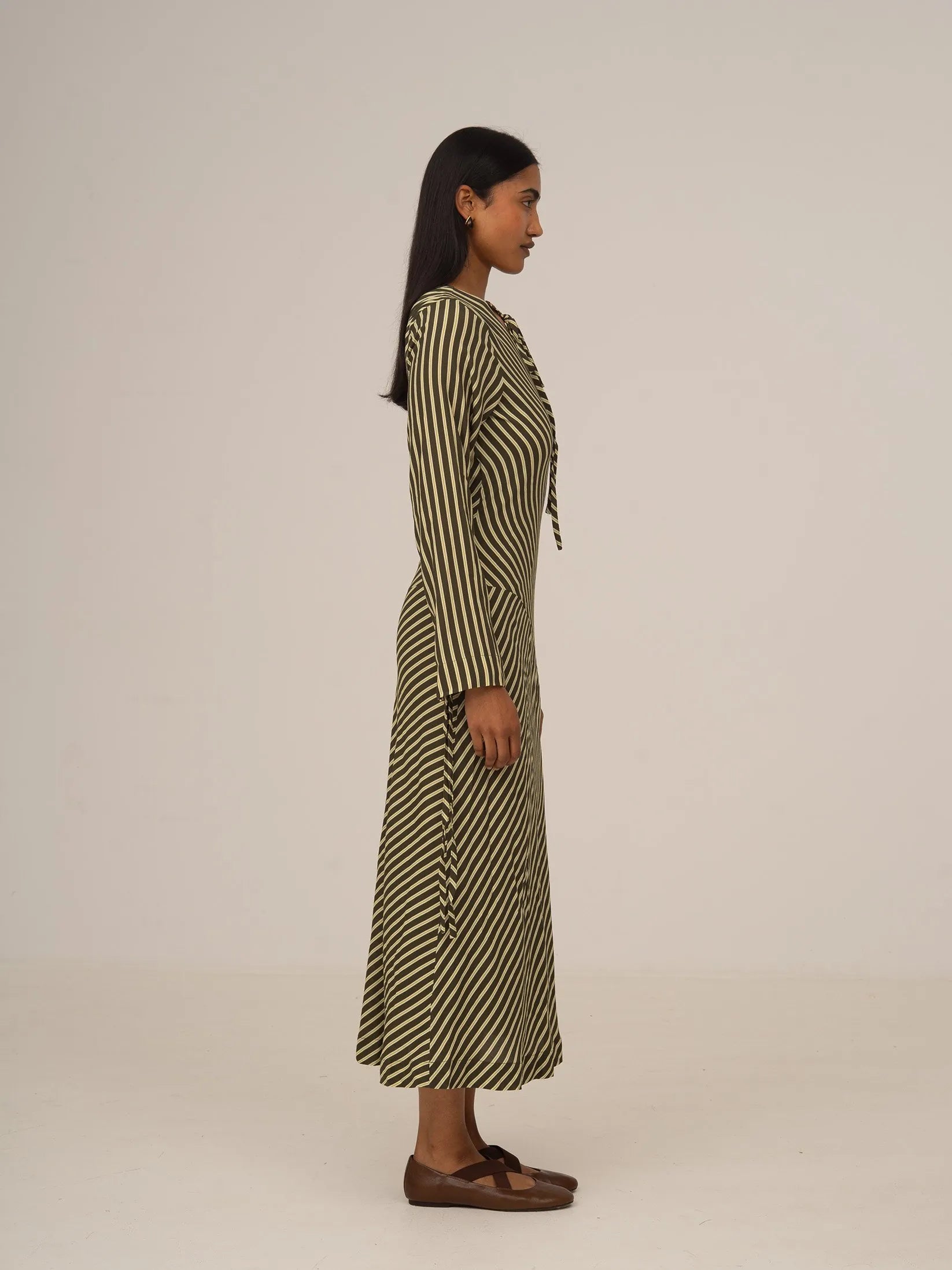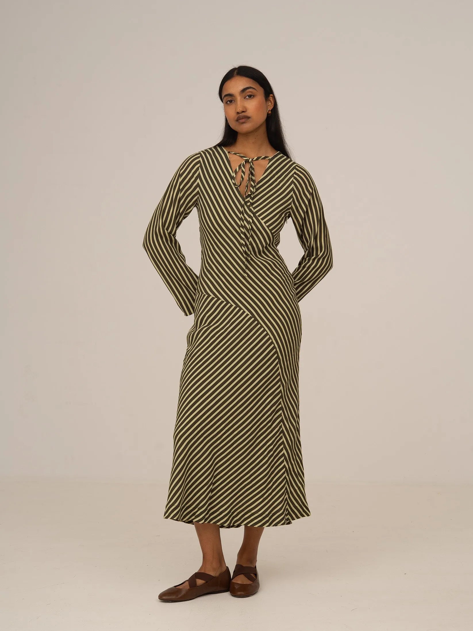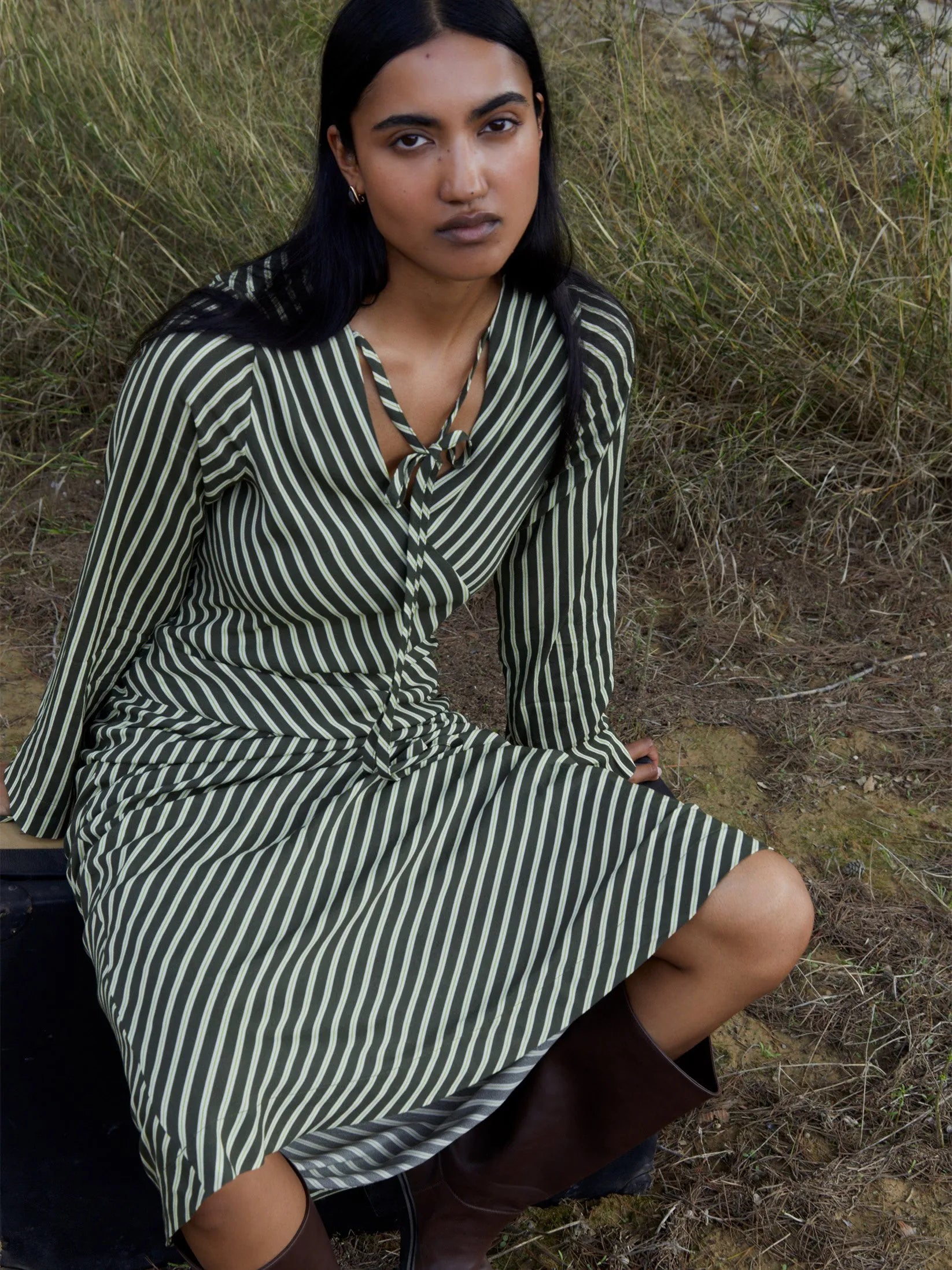 Green striped midi dress with V-neck and neck tie, elegant and feminine.