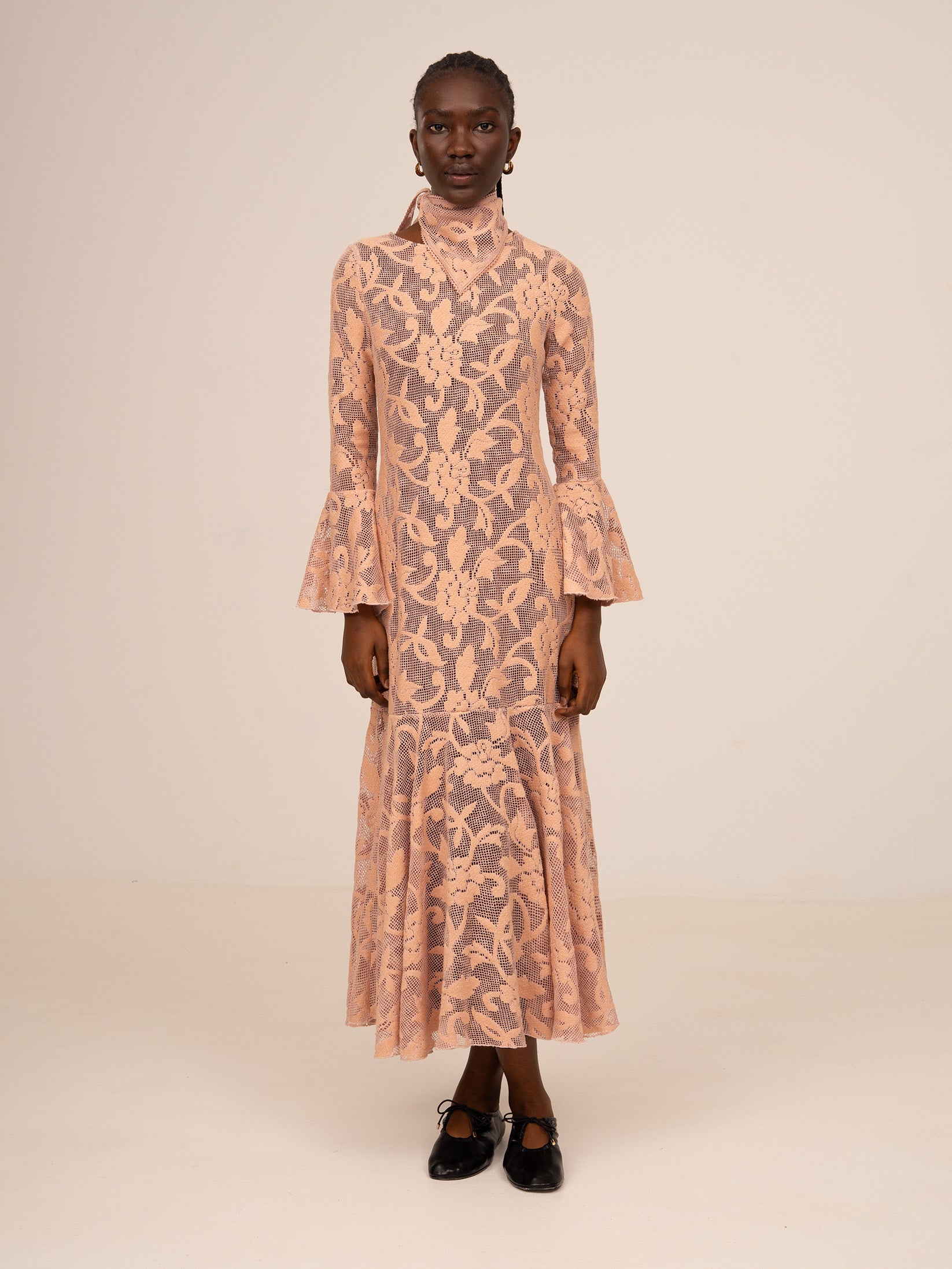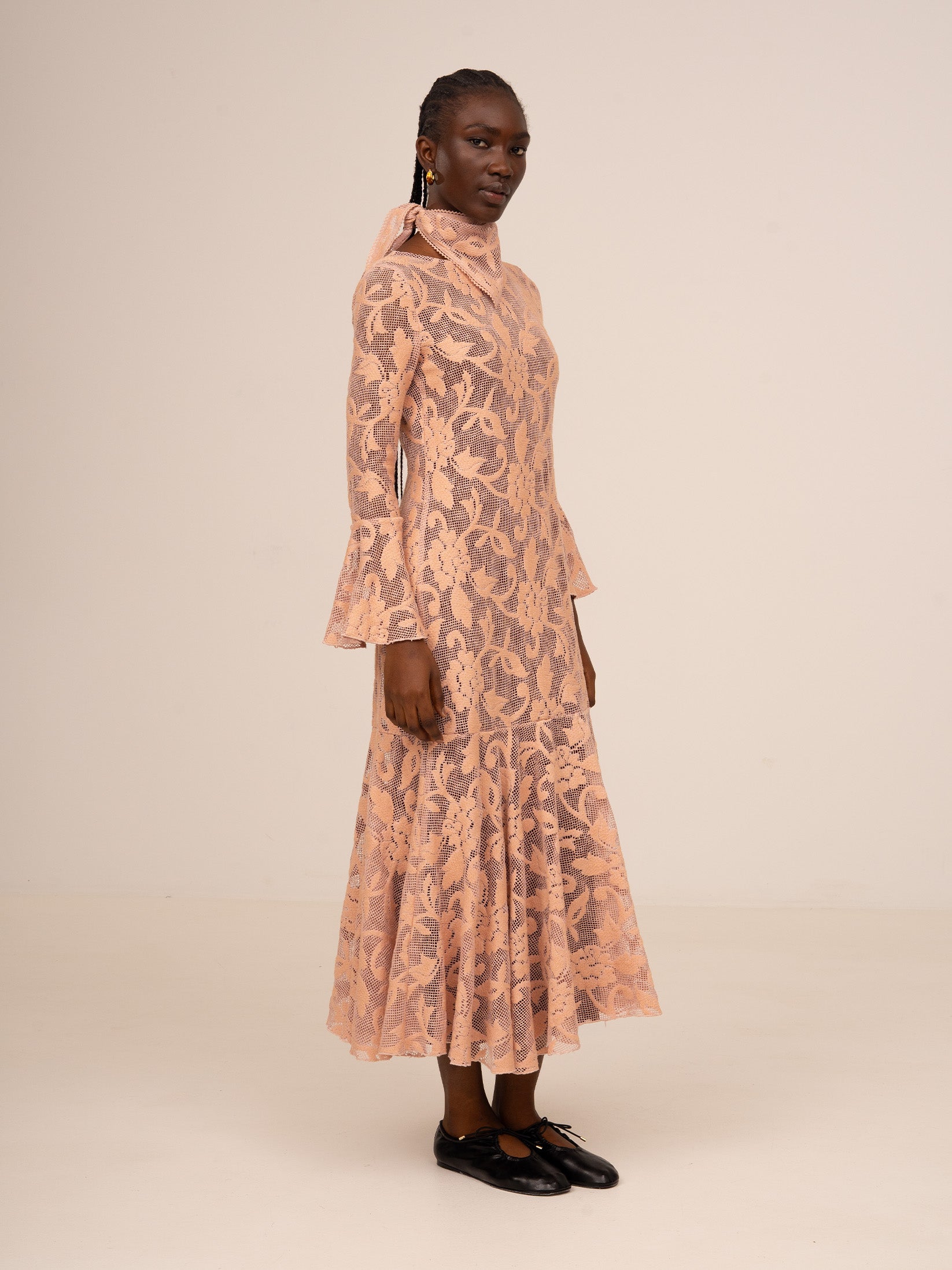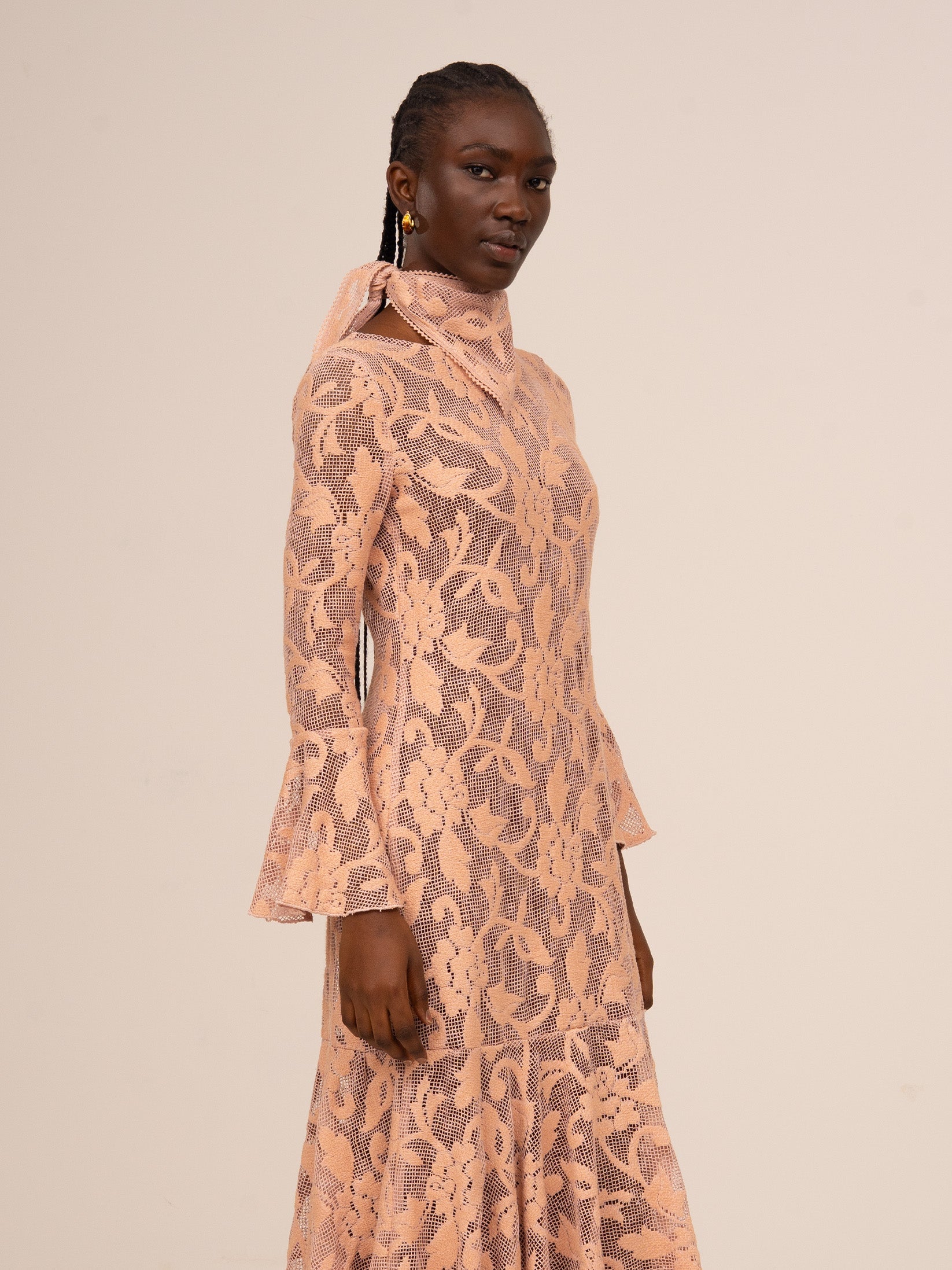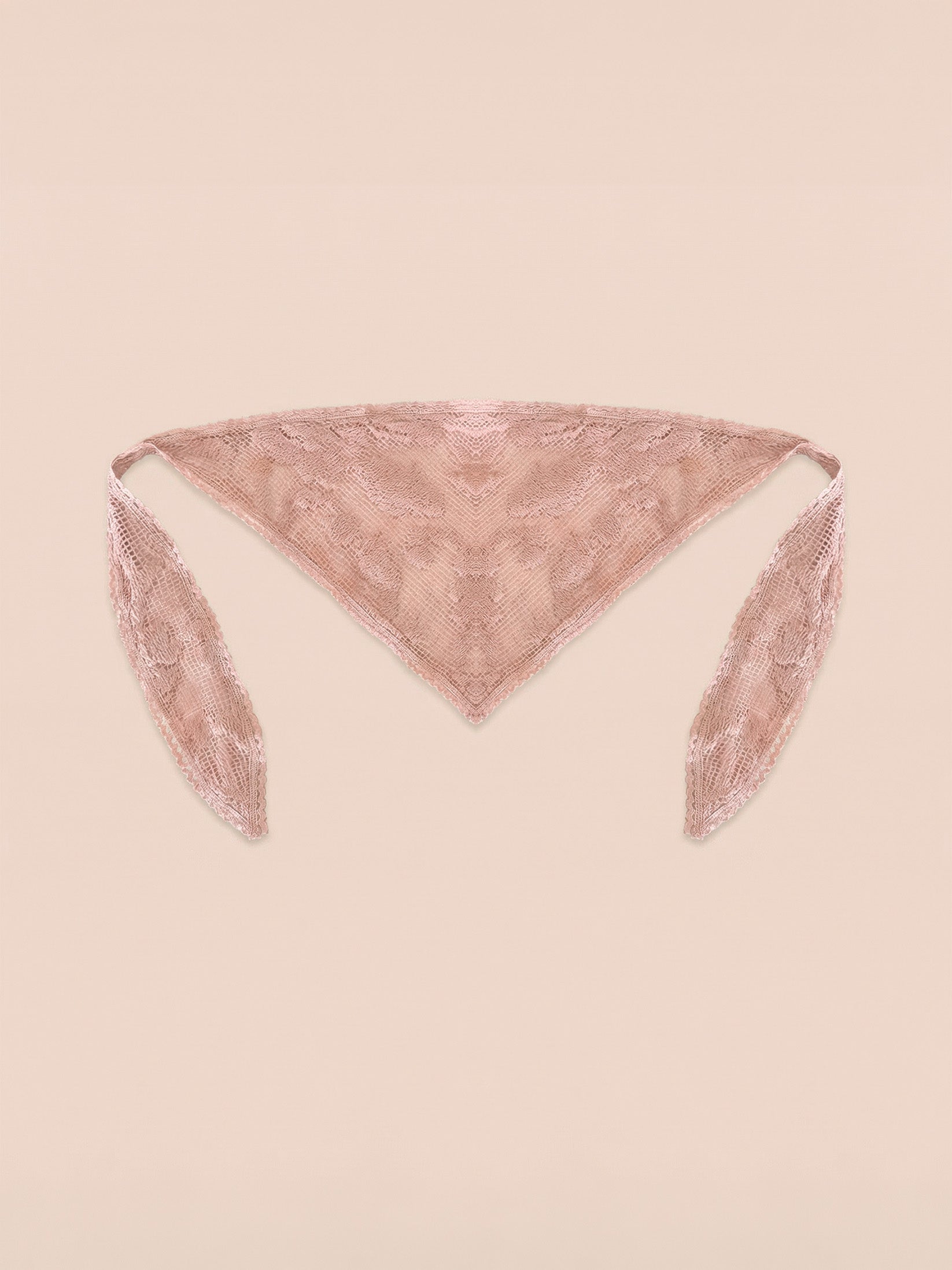 Pañuelo tipo bandana con forma triangular, diseñado para llevarse cubriendo la parte superior y posterior de la cabeza. En tejido bordado y tono rosa. Pulido con fornitura a tono.