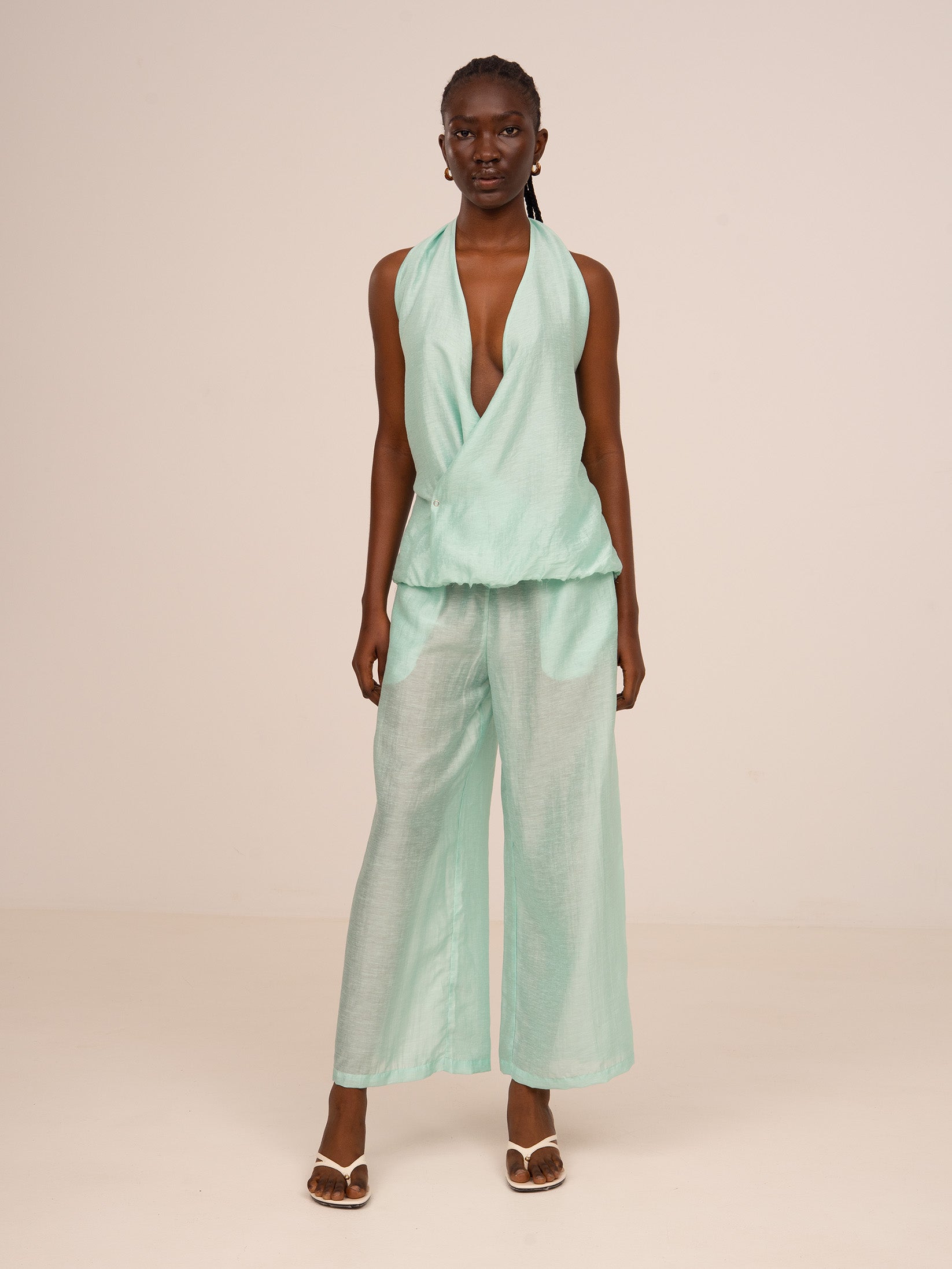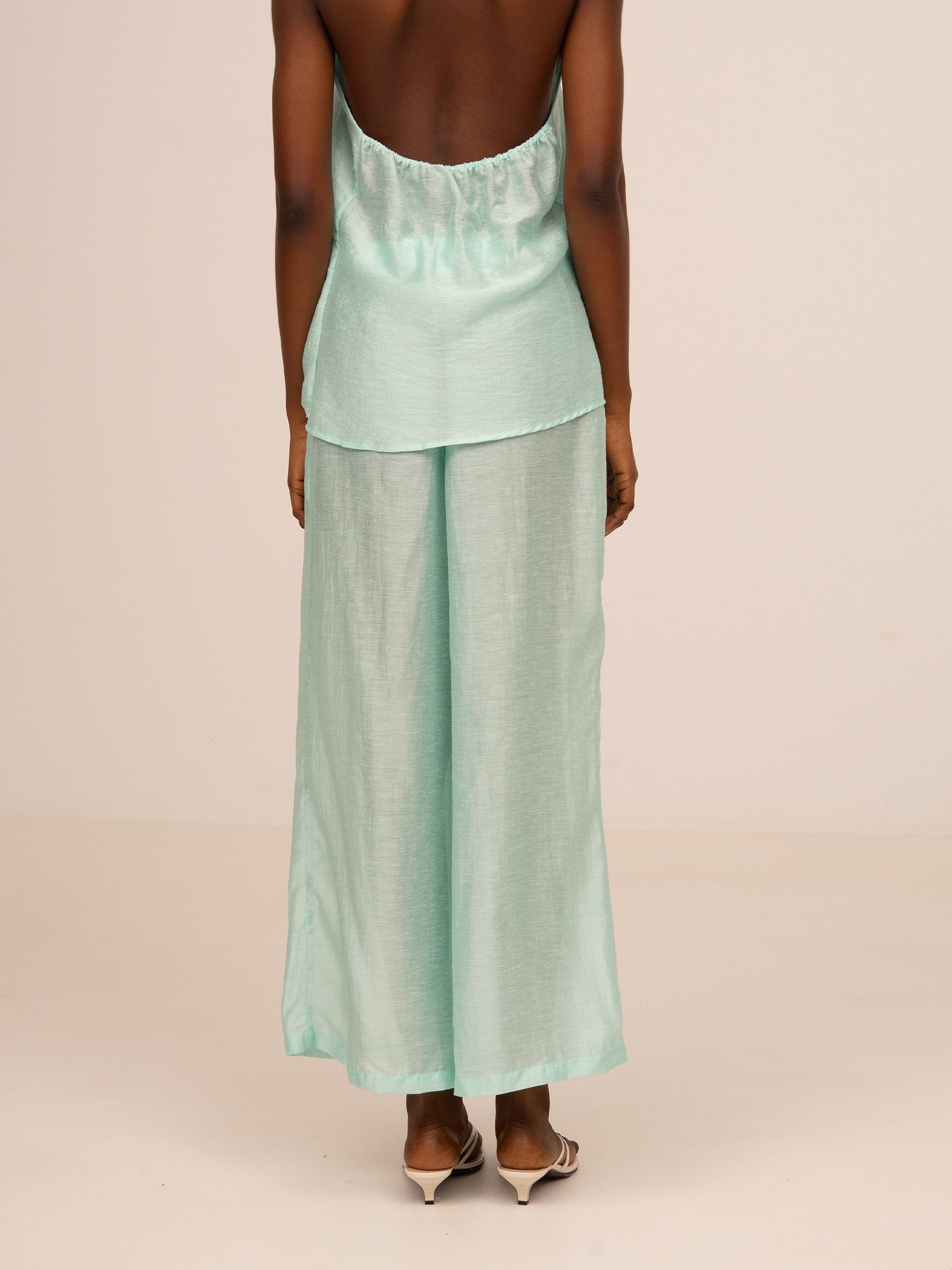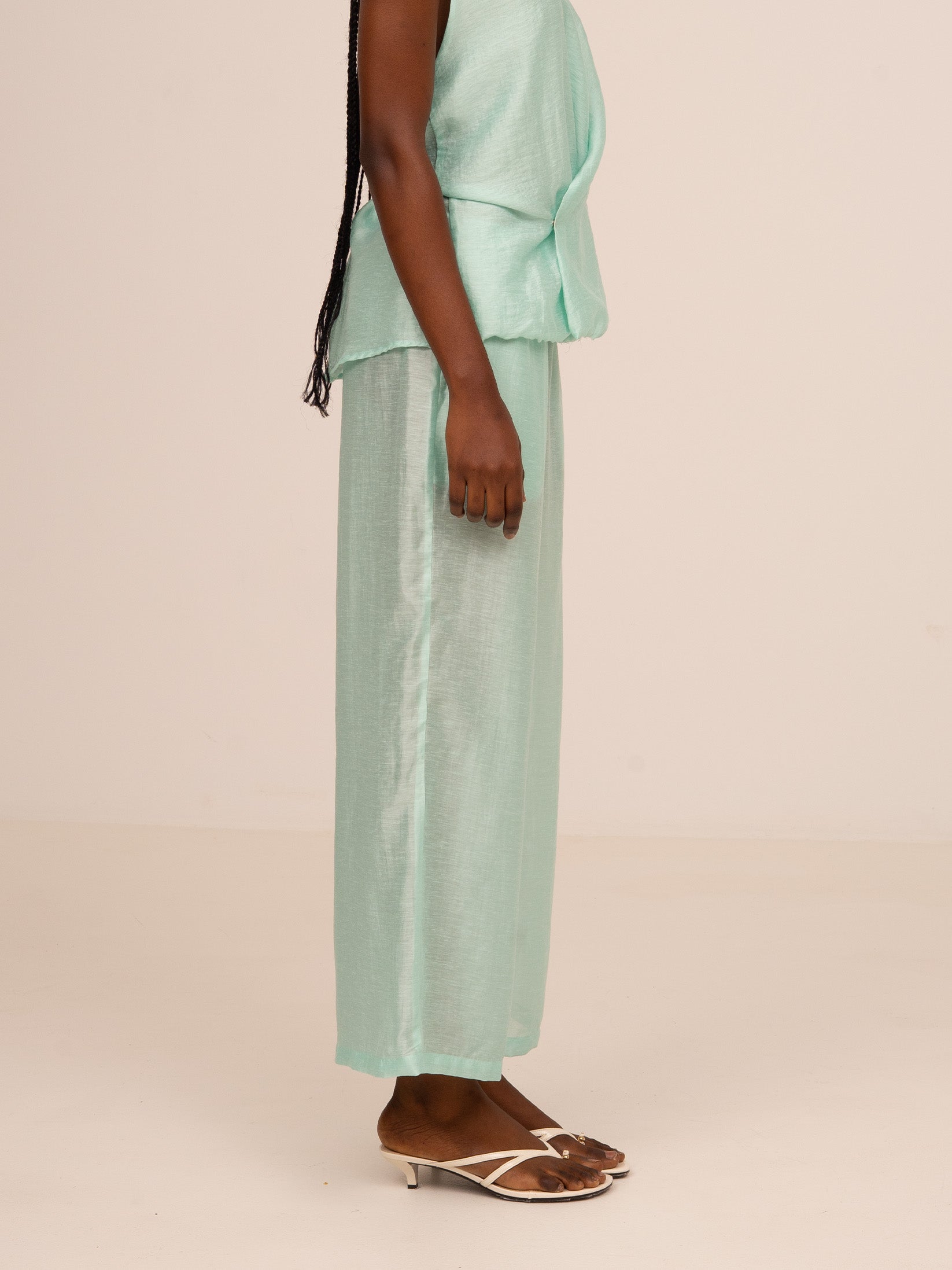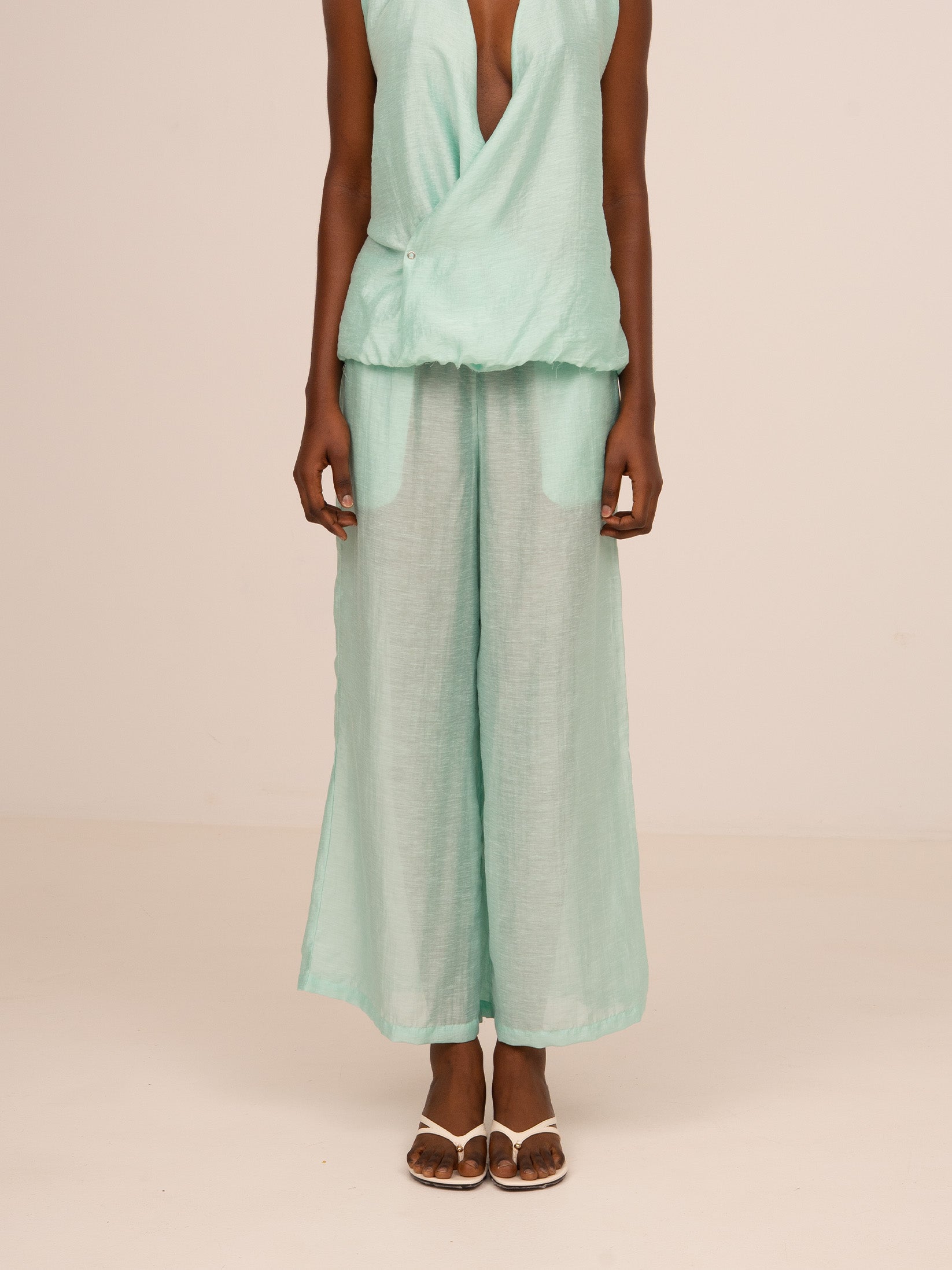 Pantalones fluidos en tono menta. Cinturilla elástica.