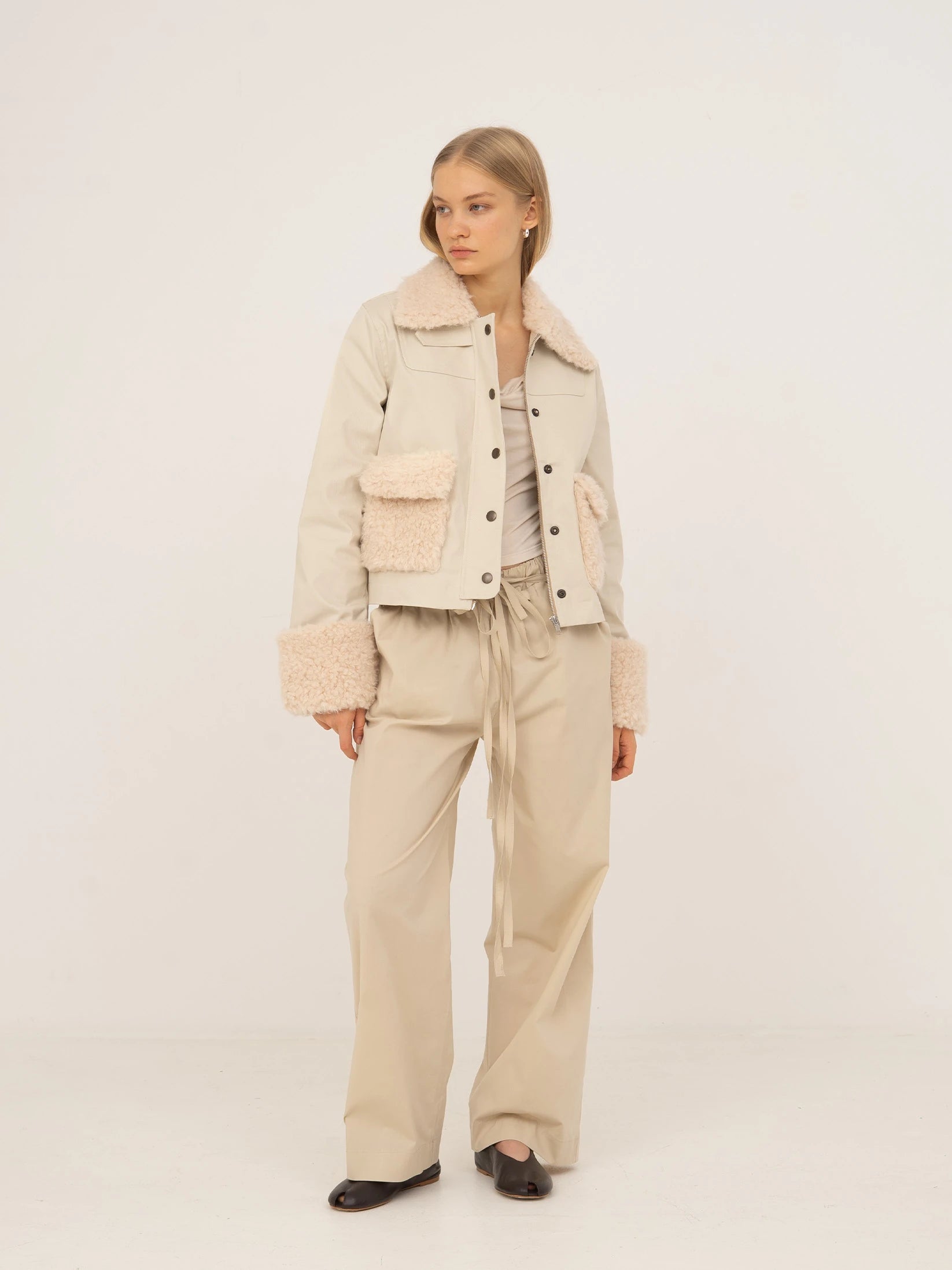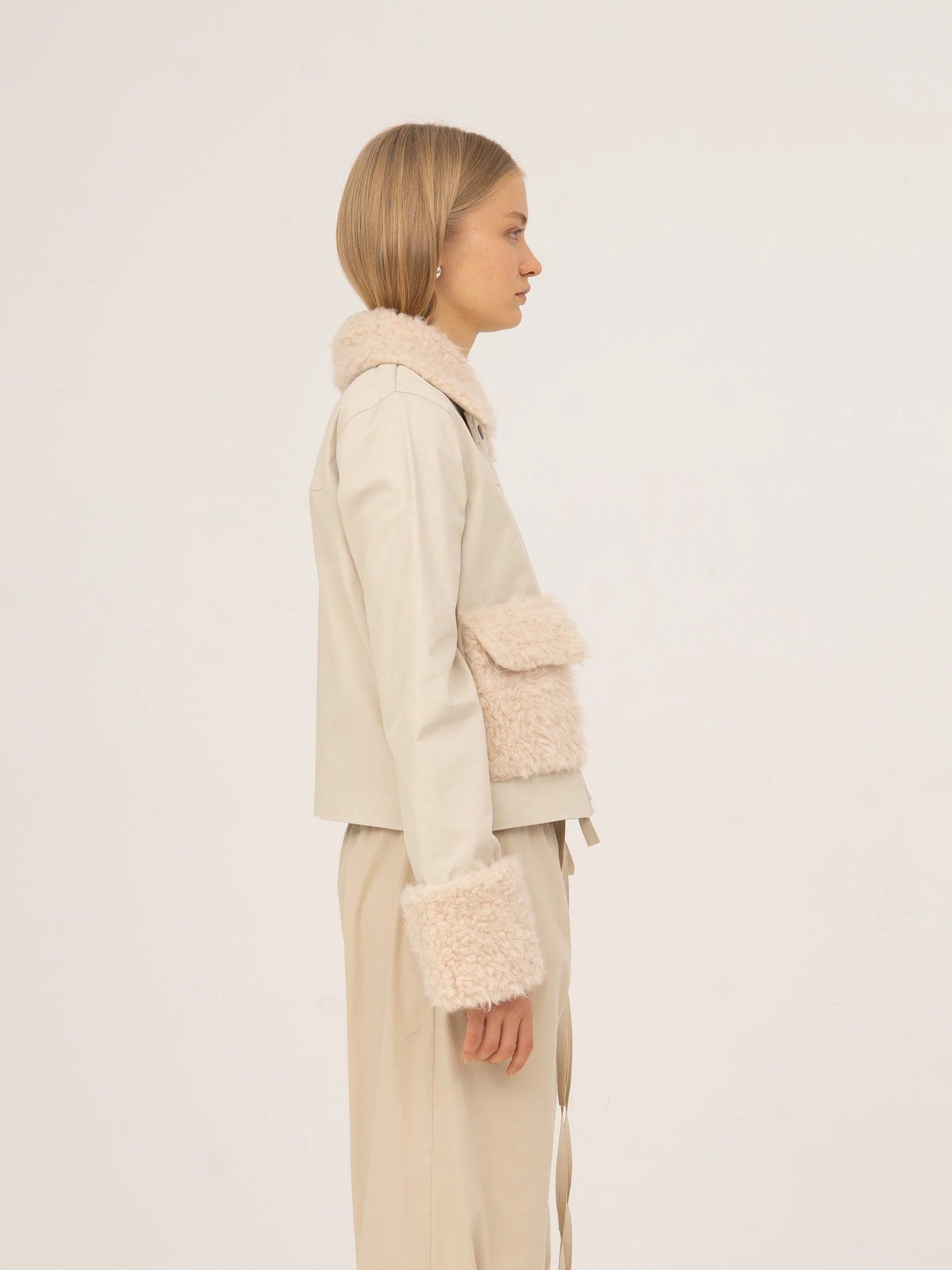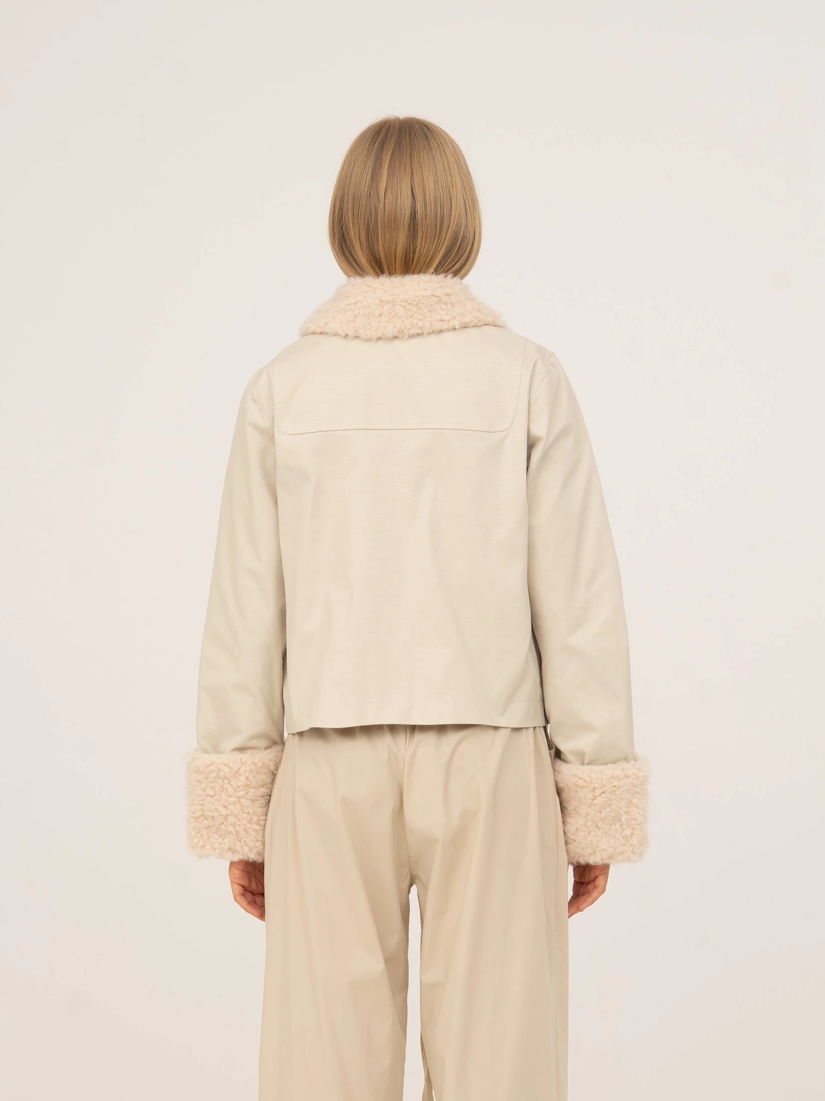 Short cream-colored jacket with collar and shearling details.