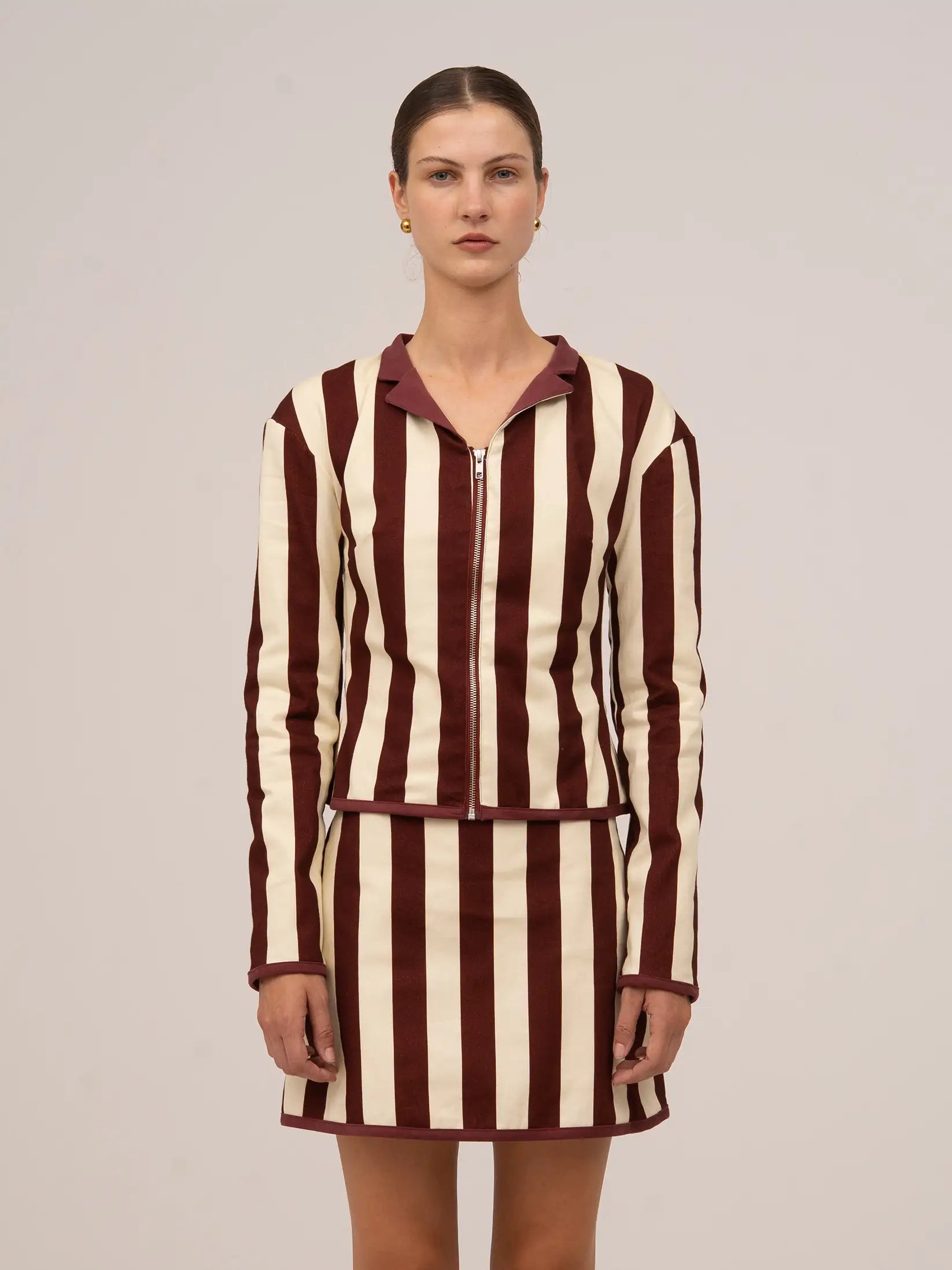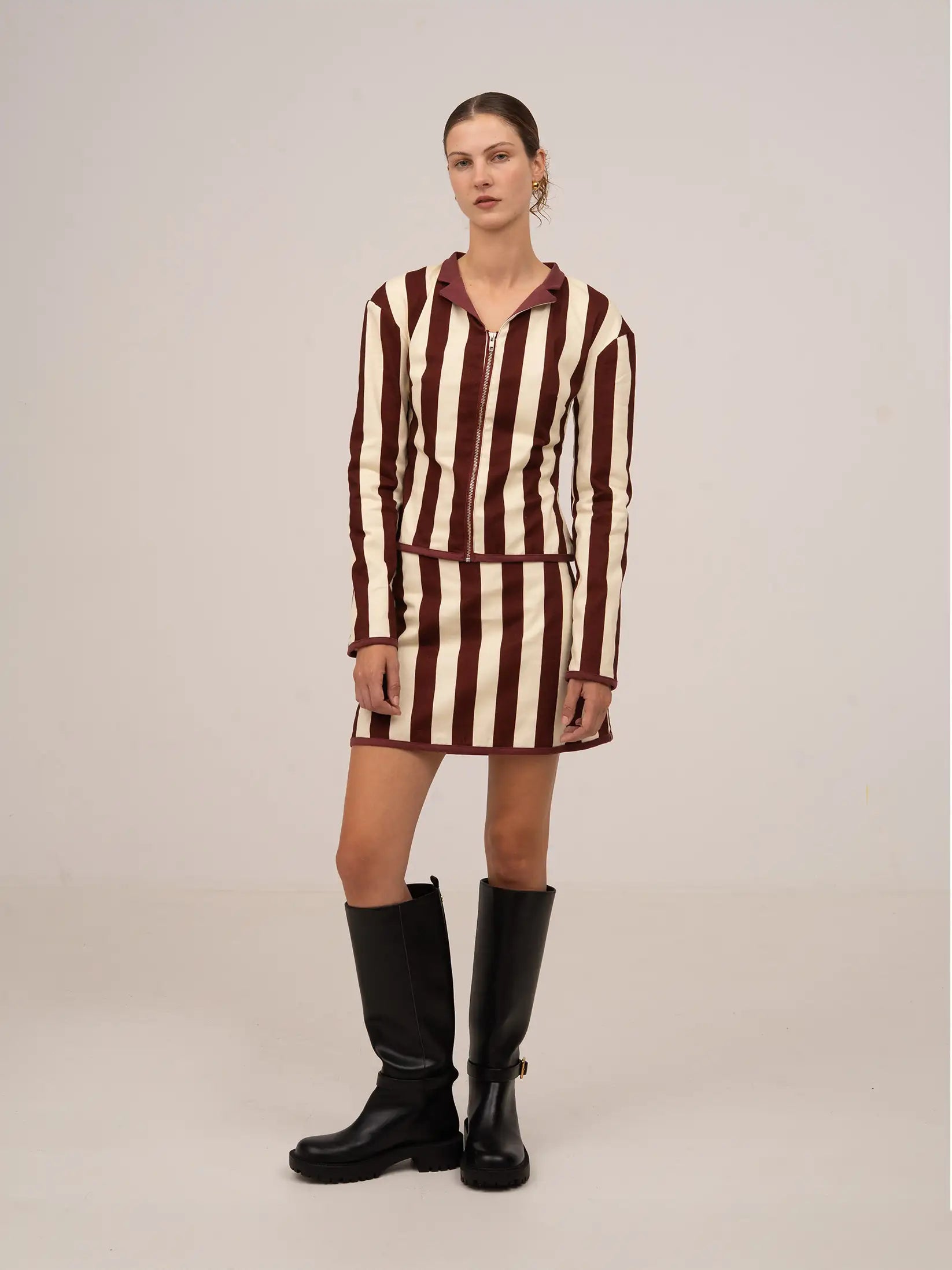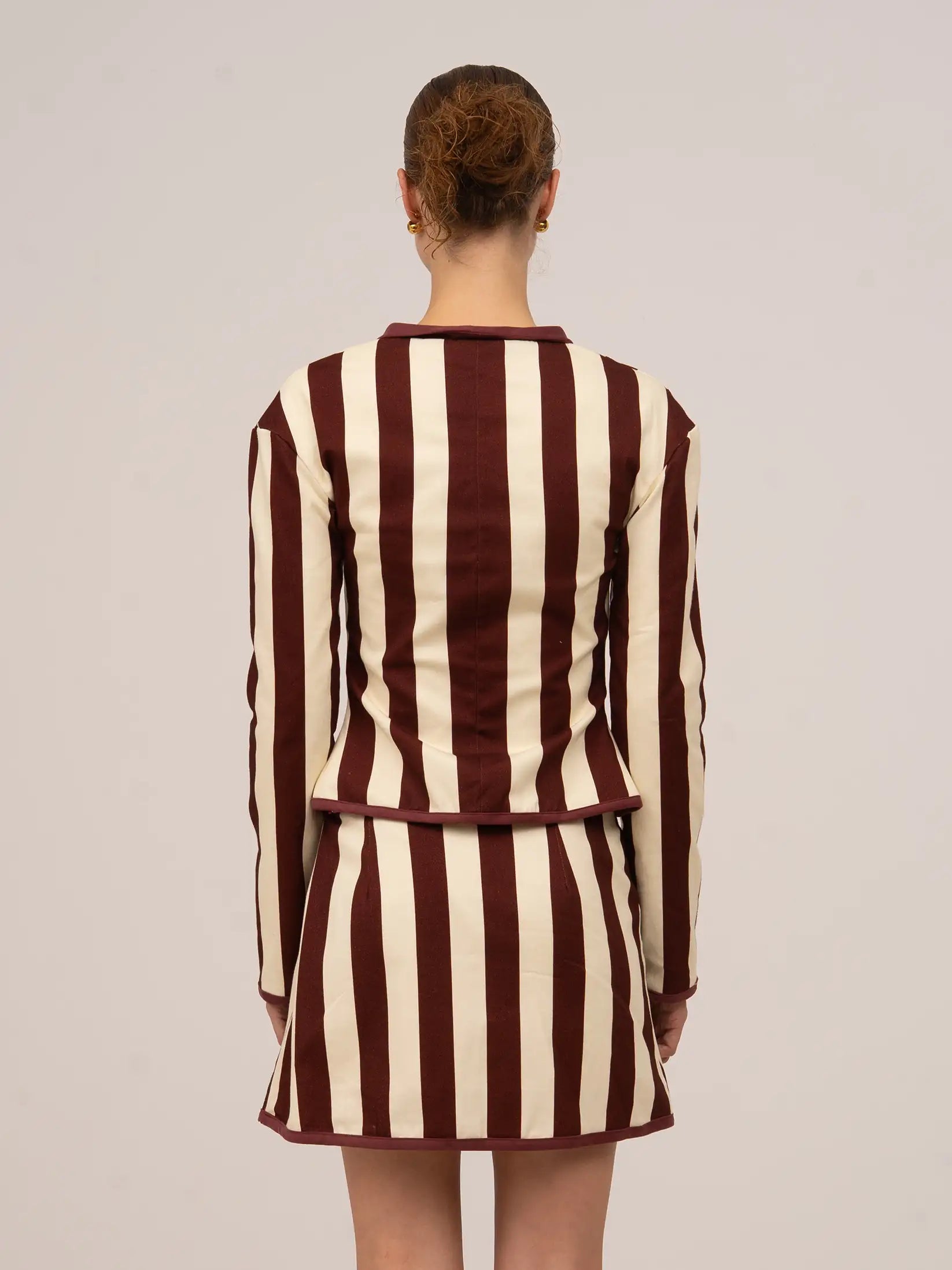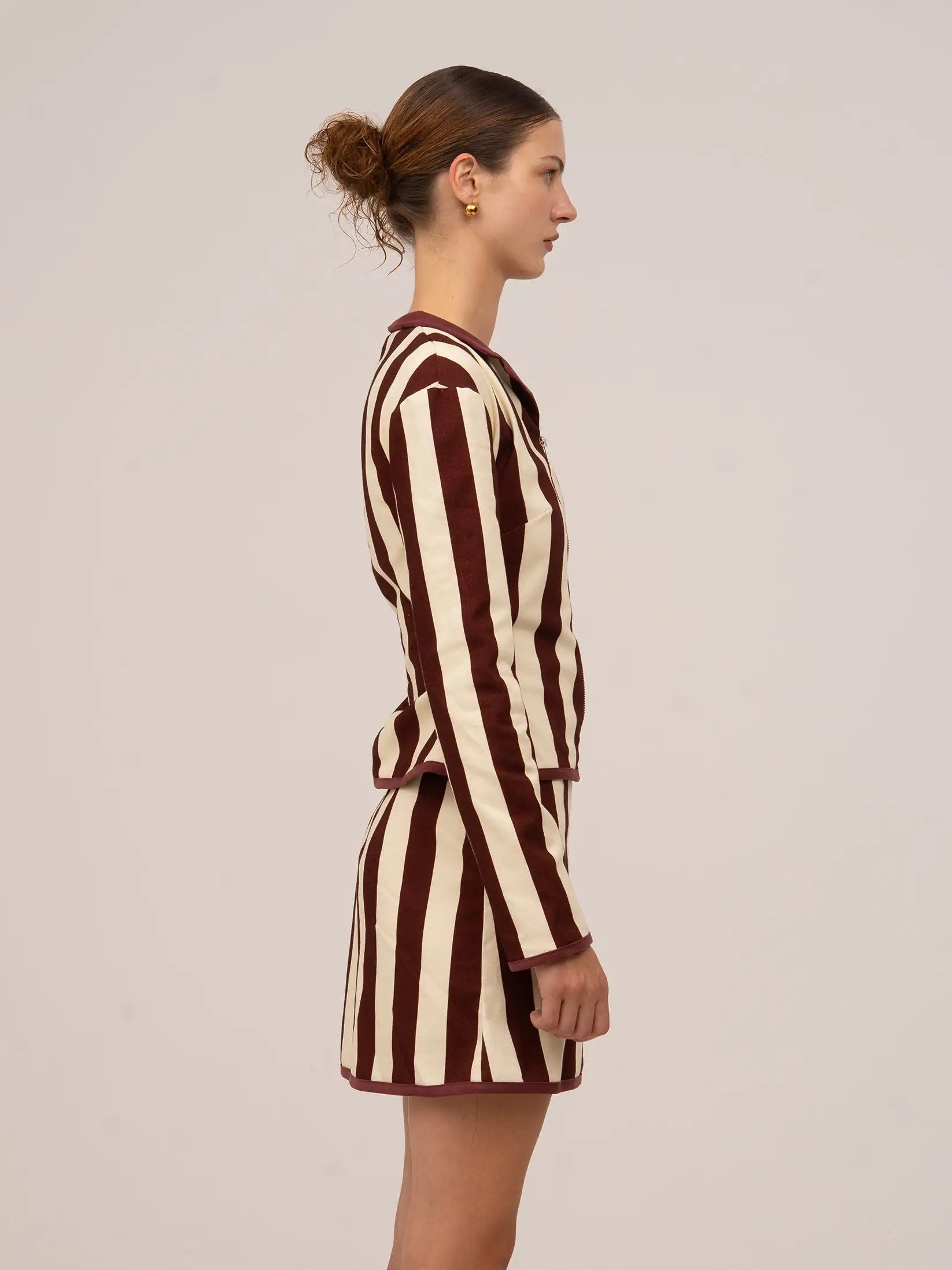 A fitted party jacket with a burgundy and cream striped print, a sophisticated garment that combines structure, style and modernity.