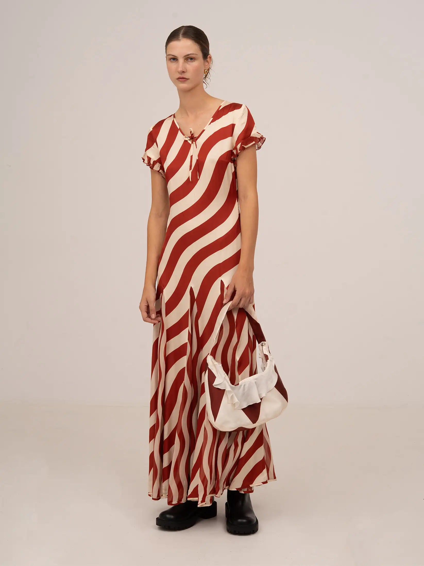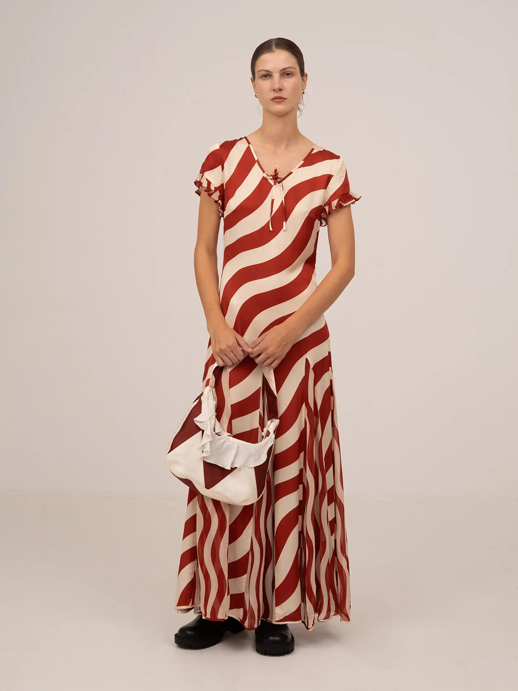 Bolso pequeño con estampado de rombos en tonos burdeos y crema, un diseño llamativo y sofisticado que aporta un toque distintivo a cualquier look. El delicado volante en la parte superior añade un aire femenino y juguetón, mientras que el cierre con cremallera metálica asegura funcionalidad y un acabado pulido. Ligero, versátil y con carácter propio, es el complemento perfecto para elevar estilismos diarios o acompañar conjuntos especiales con un punto elegante y contemporáneo.
