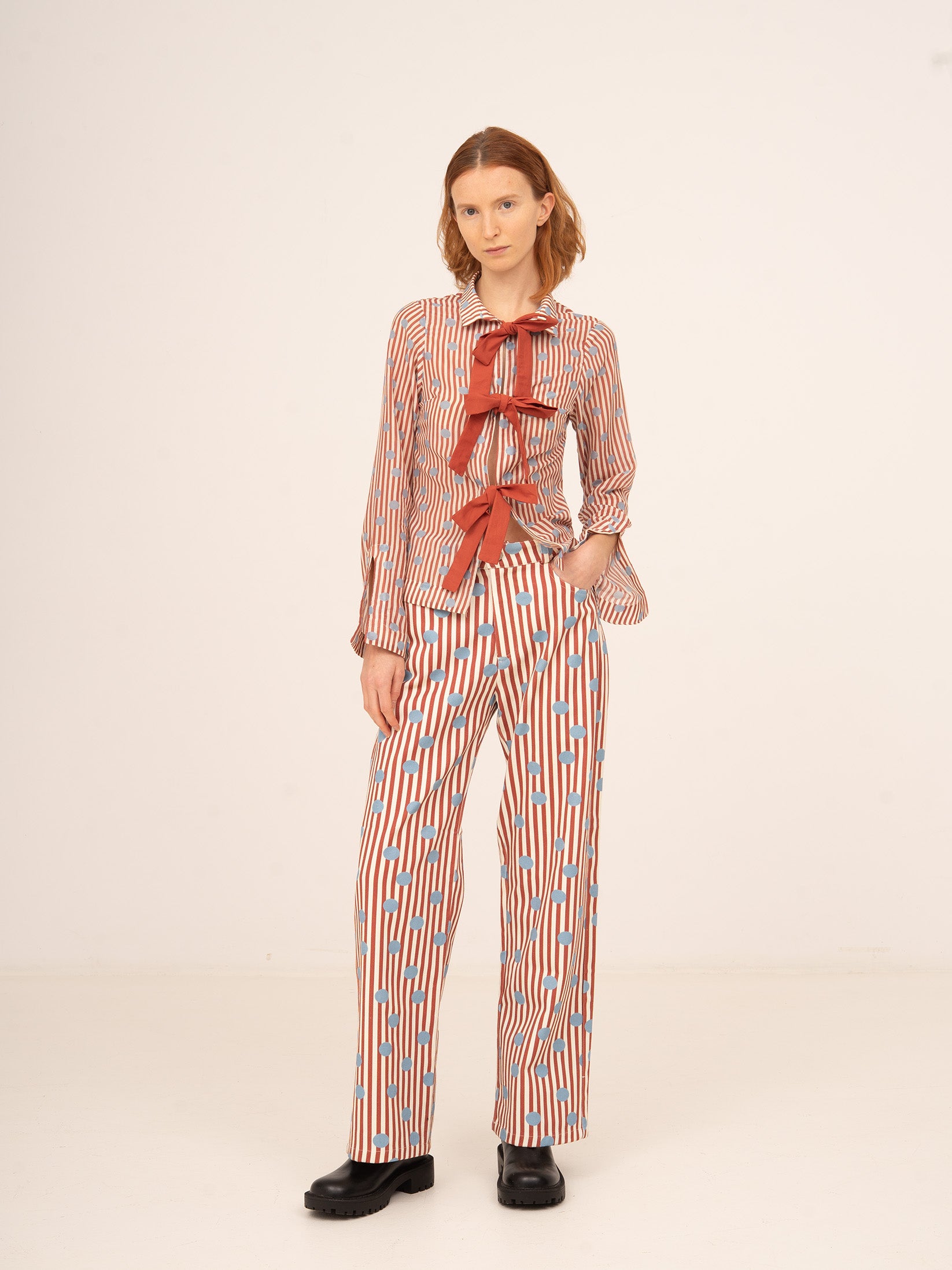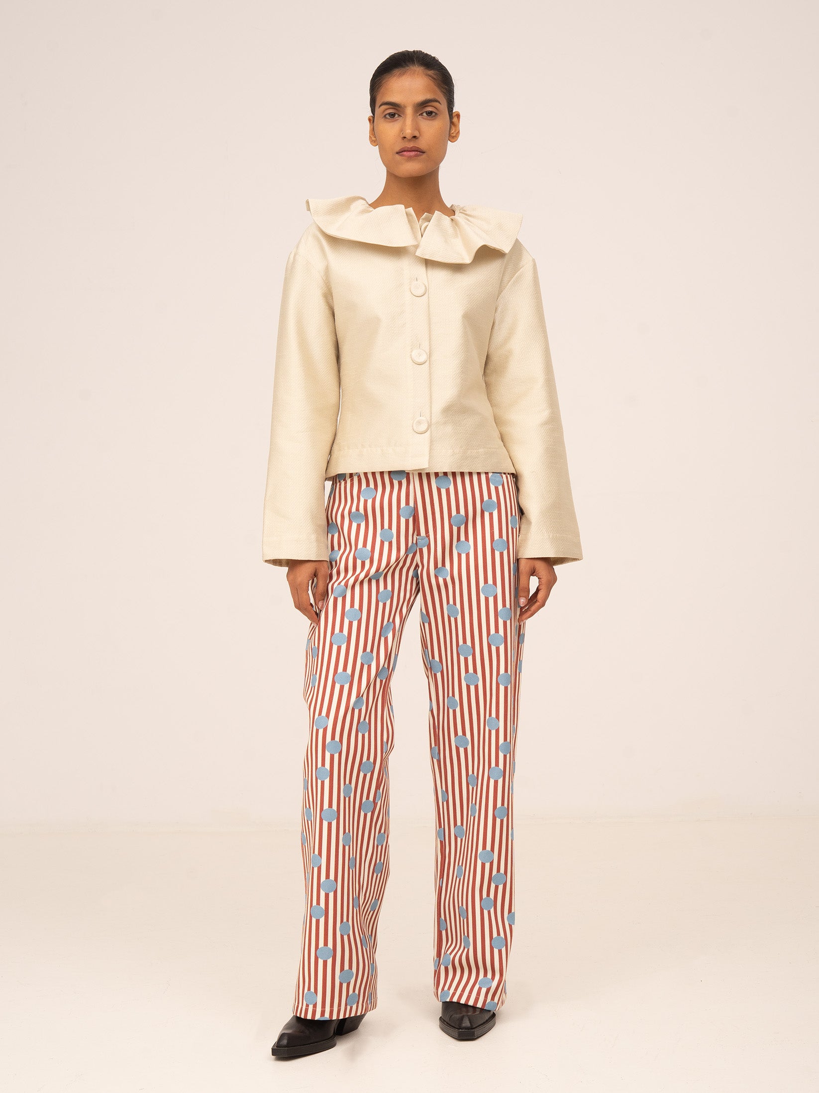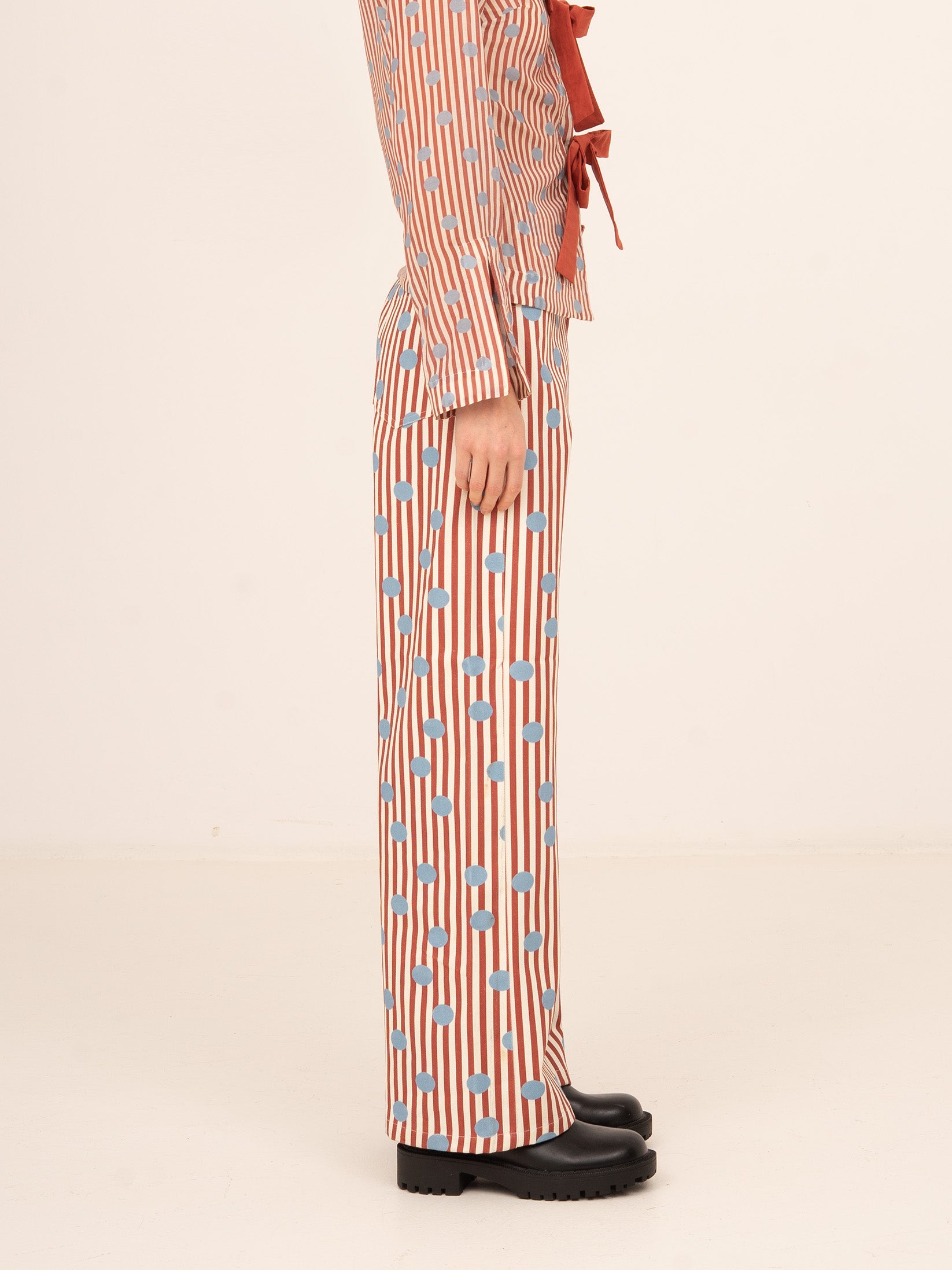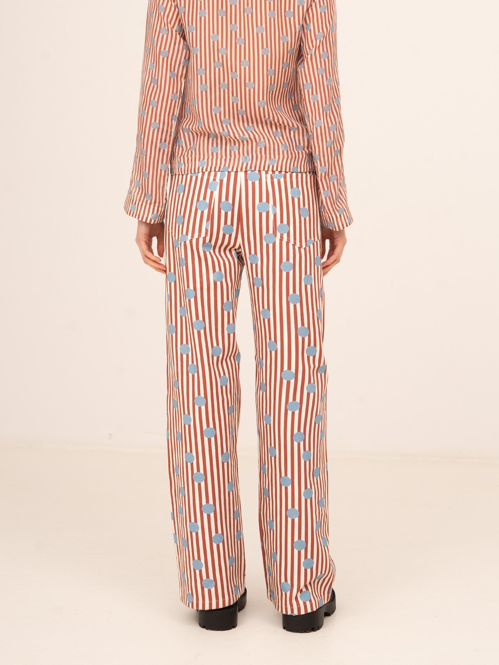 Vaqueros rectos con estampado geométrico de rayas diagonales y topos en tonos rojos y azules, una prenda llamativa que combina estilo, comodidad y un toque creativo.
