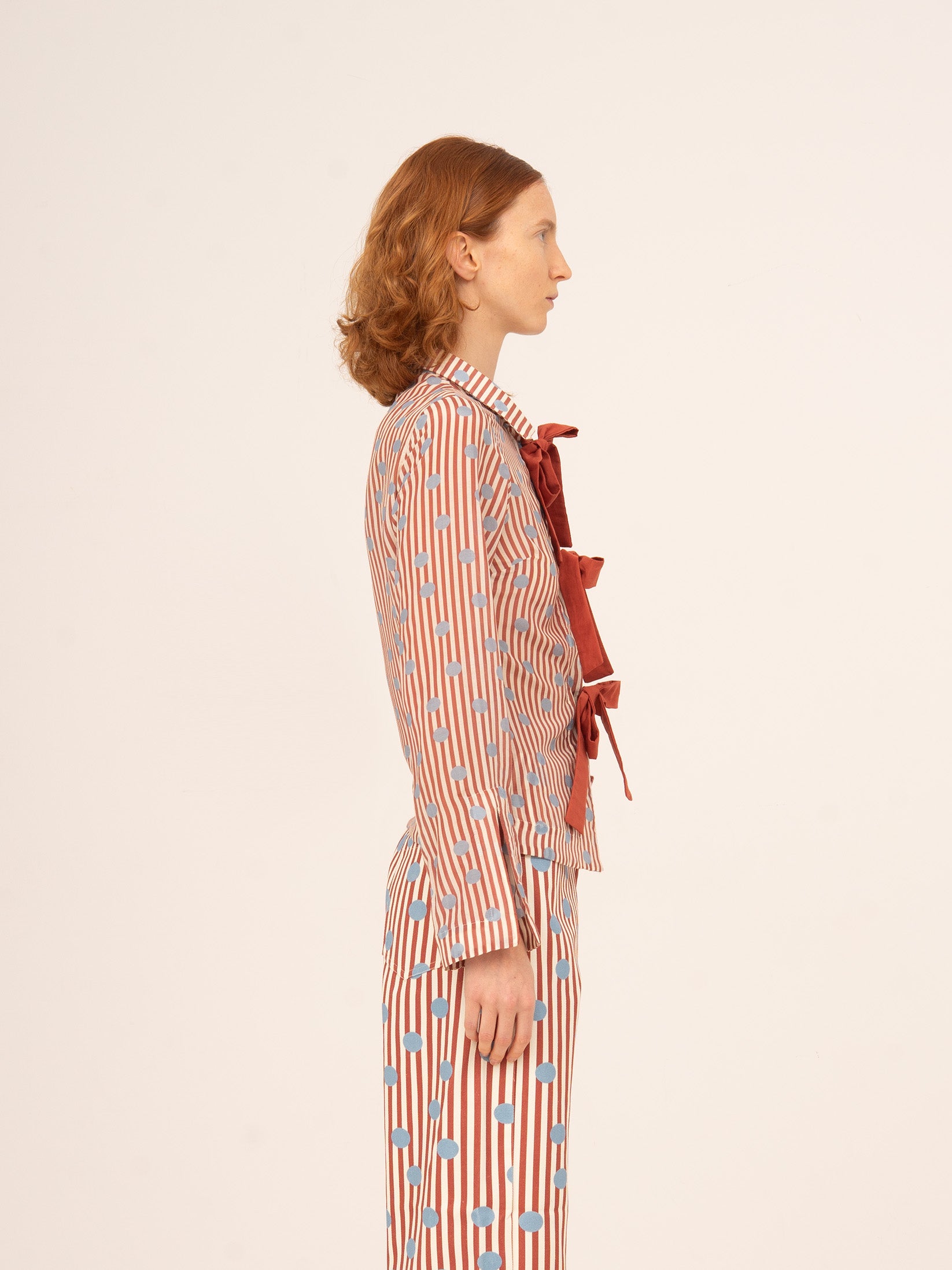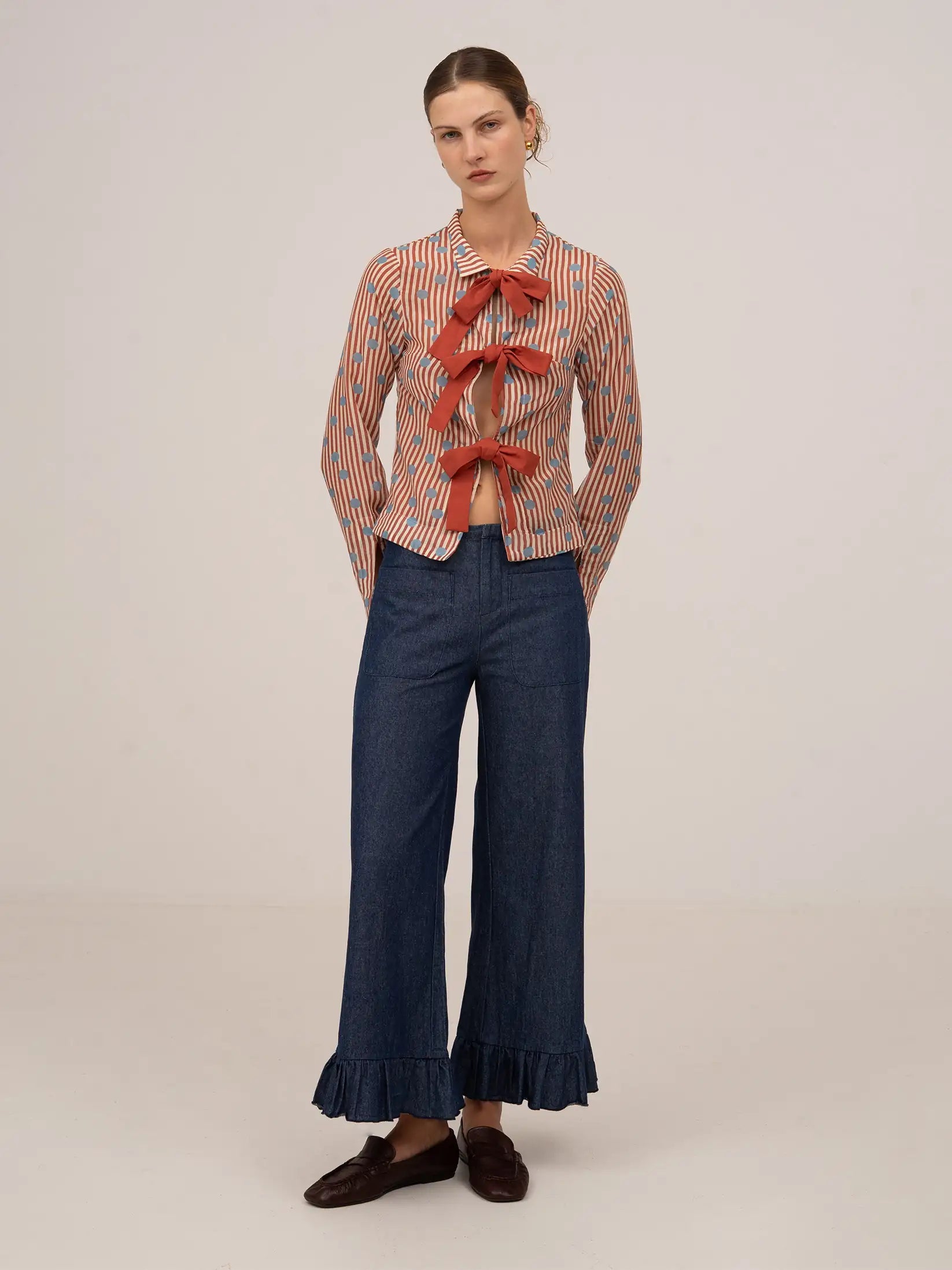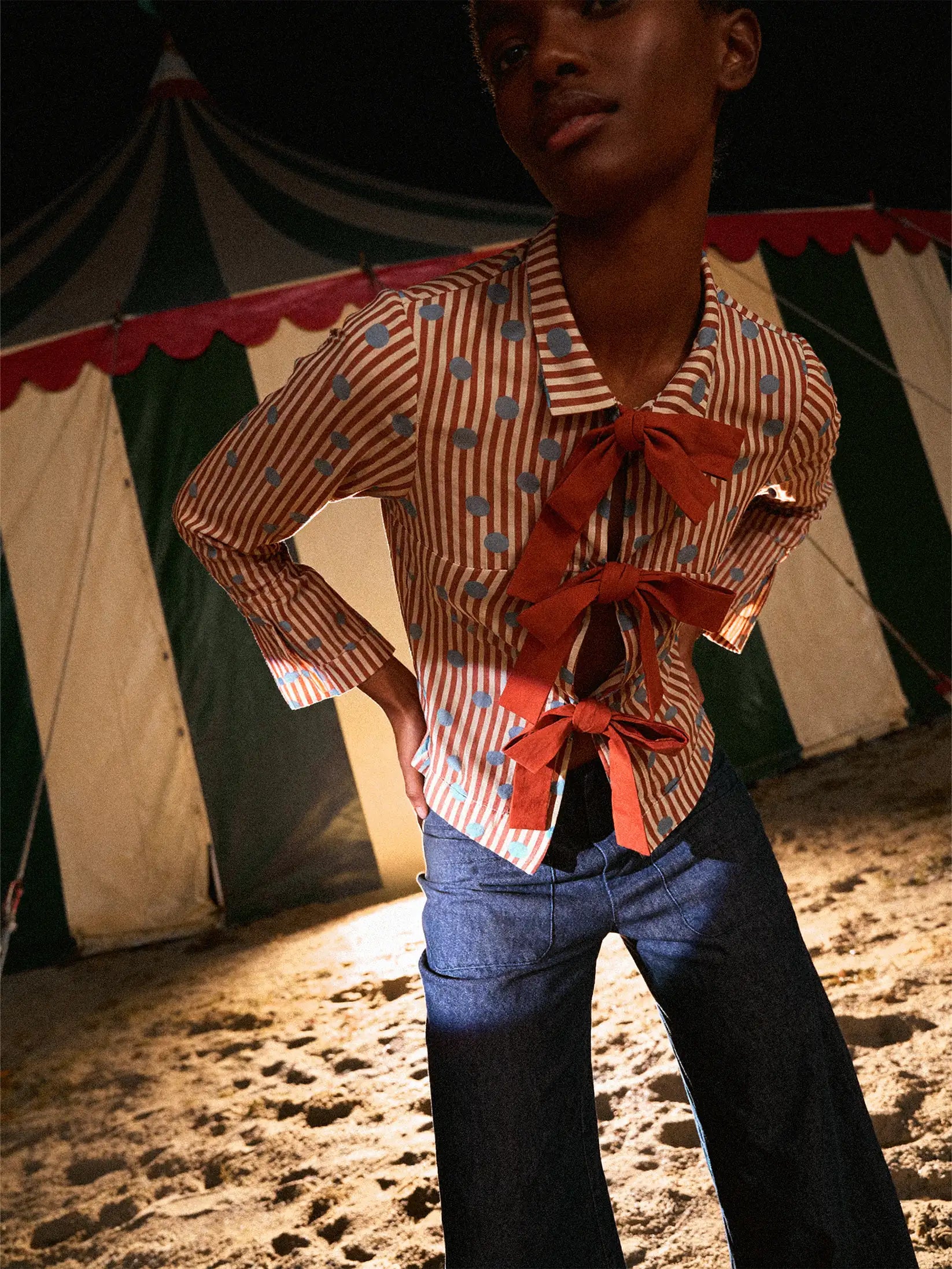 Blusa romántica de fiesta con lazos y estampado a rayas en rojo y azul, perfecta para looks sofisticados con un toque creativo.