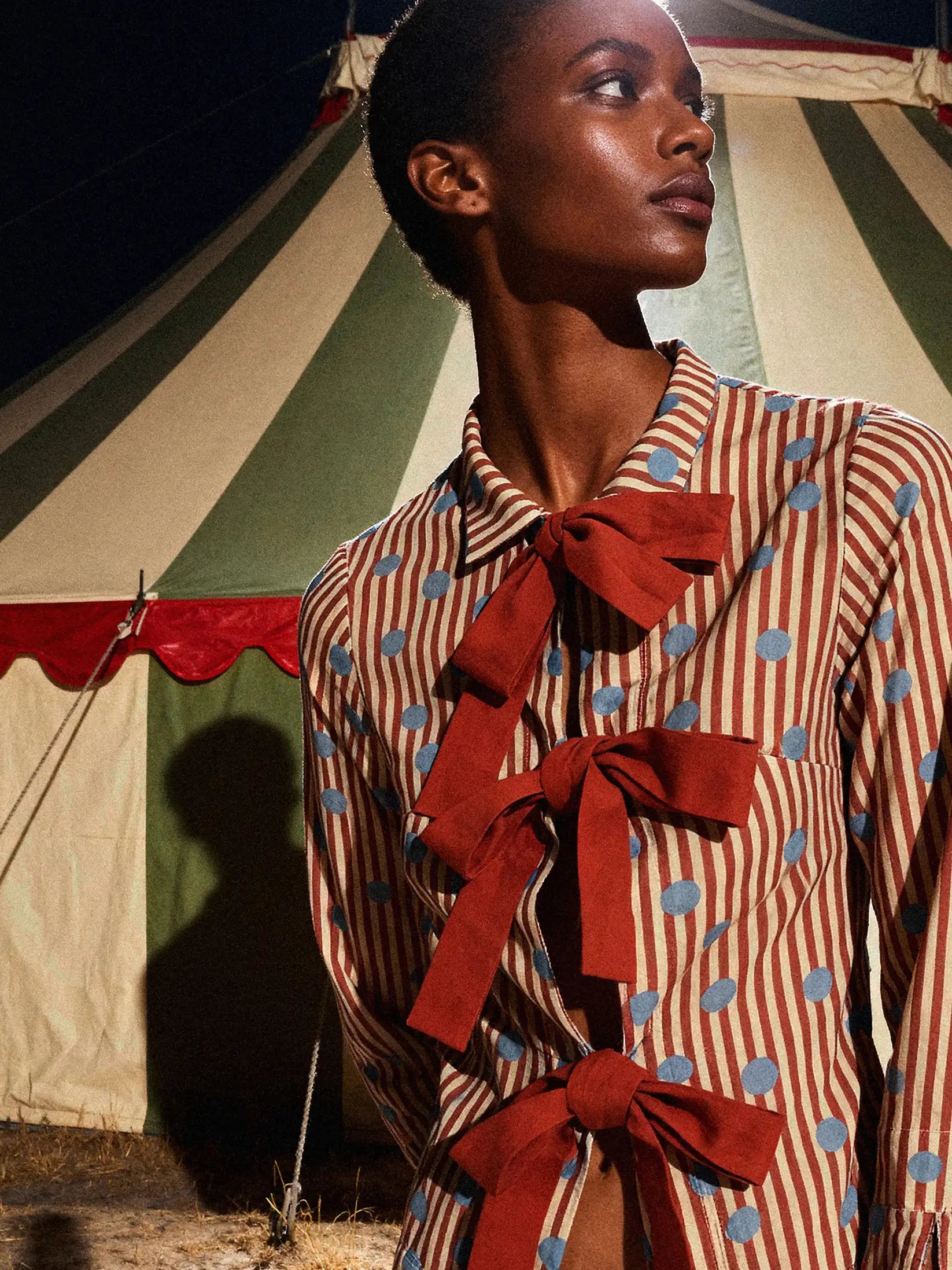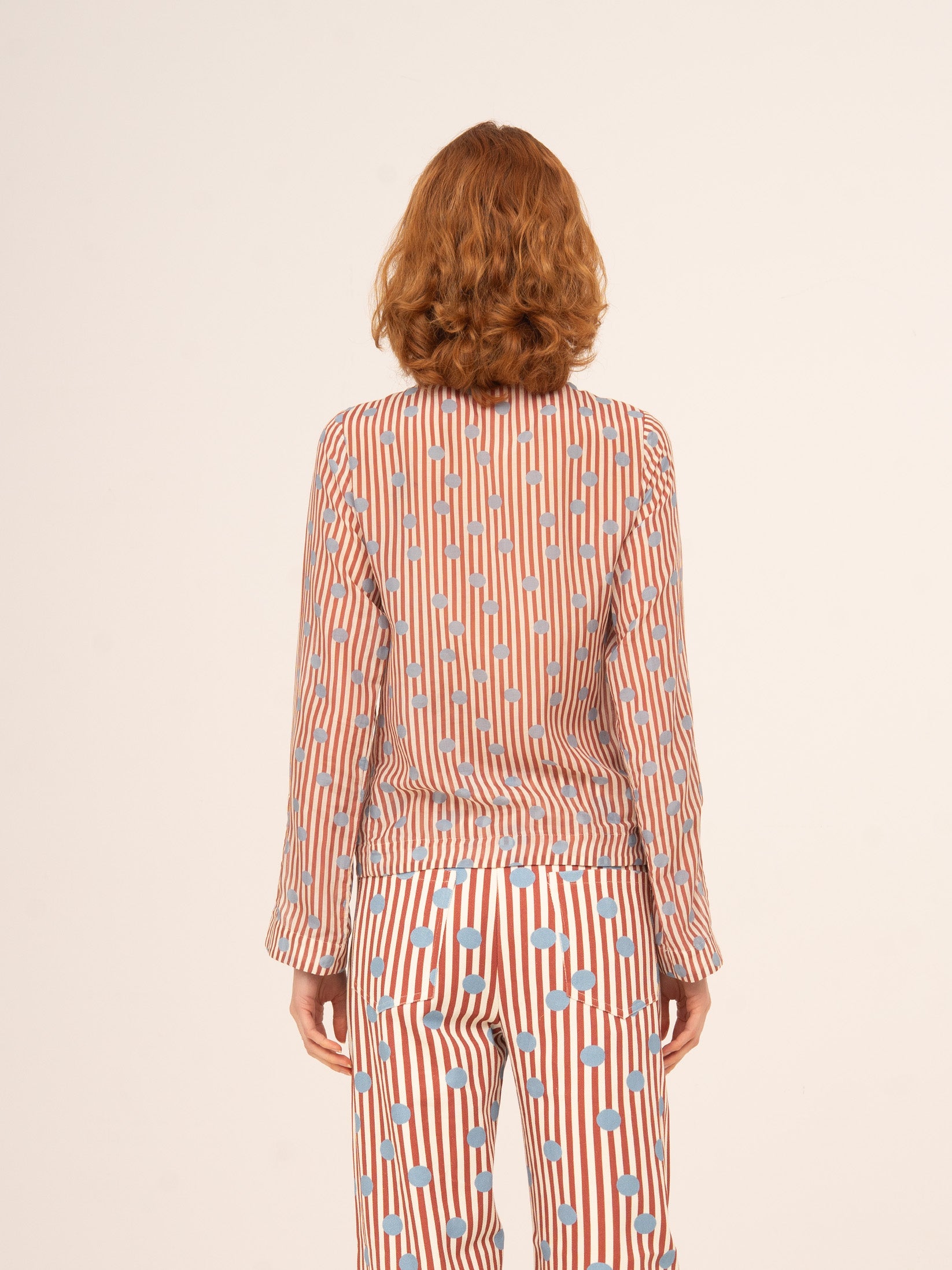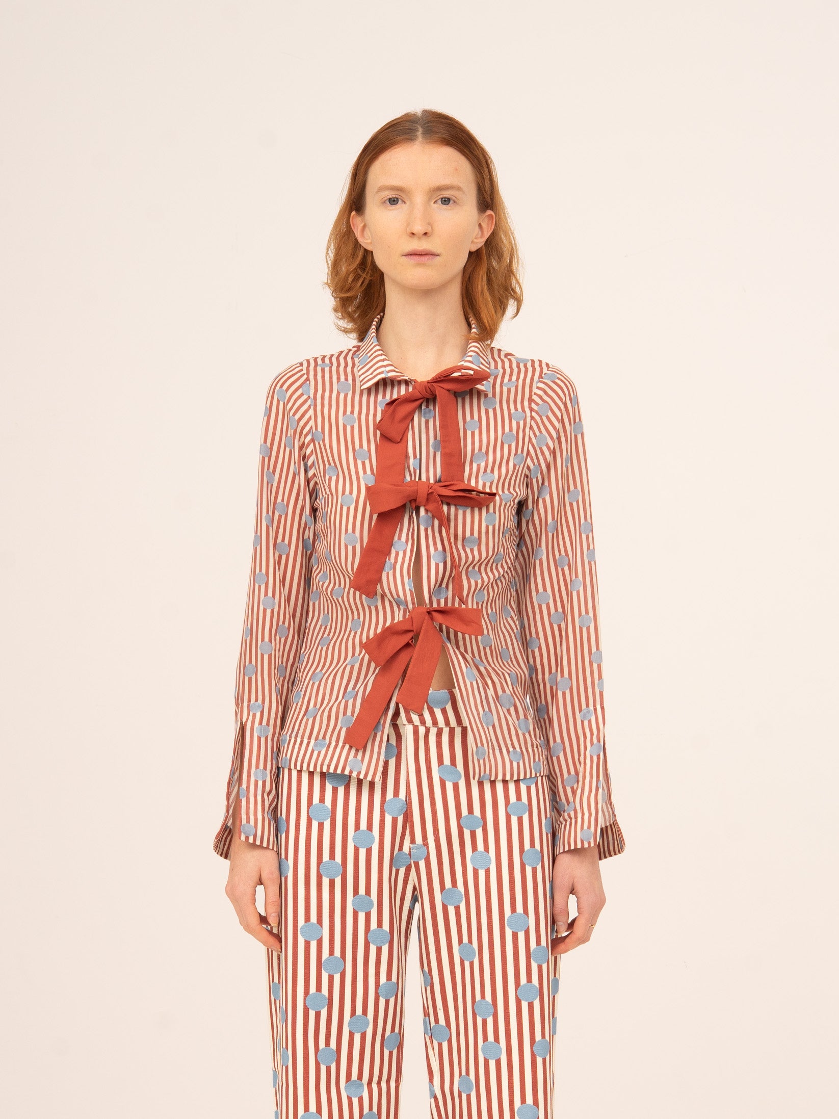 Esta blusa semitransparente combina un estampado de rayas rojas con delicados topos azulados, creando un contraste moderno y lleno de personalidad. Su diseño destaca por los lazos frontales en tono contraste, que aportan volumen, textura y un encanto artesanal único. El tejido ligero y vaporoso ofrece una sensación suave sobre la piel, con una caída fluida que realza la silueta sin perder comodidad.