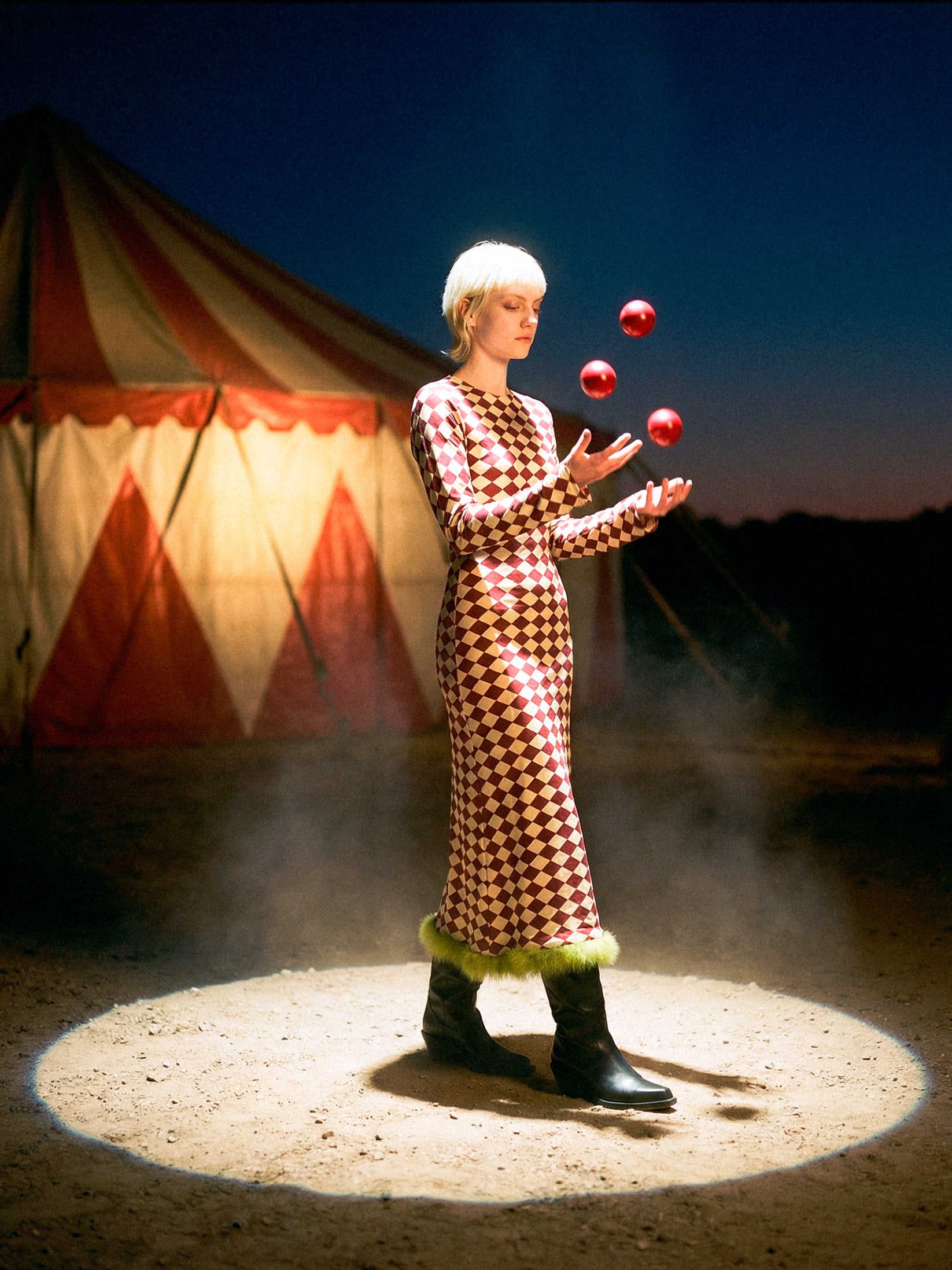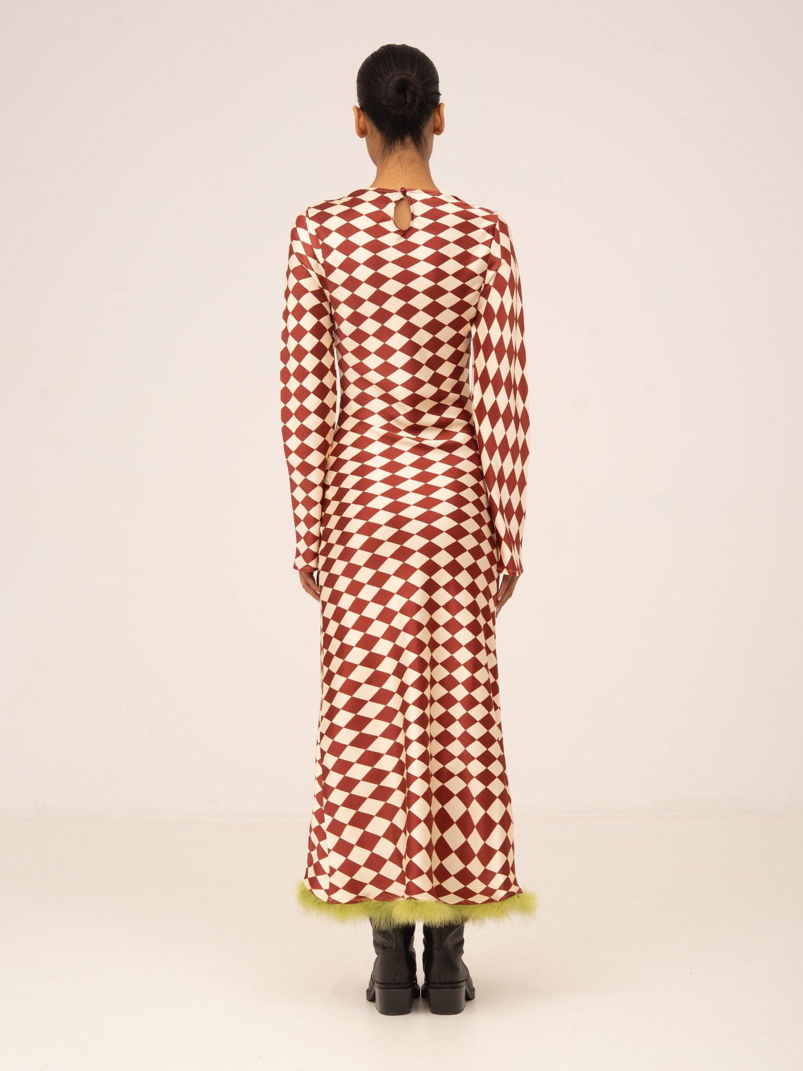 Vestido midi con estampado de rombos en rojo y blanco, una pieza llamativa y sofisticada que aporta dinamismo y personalidad.