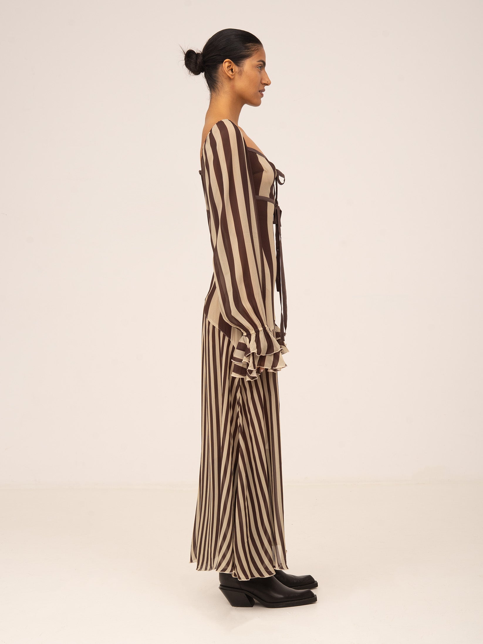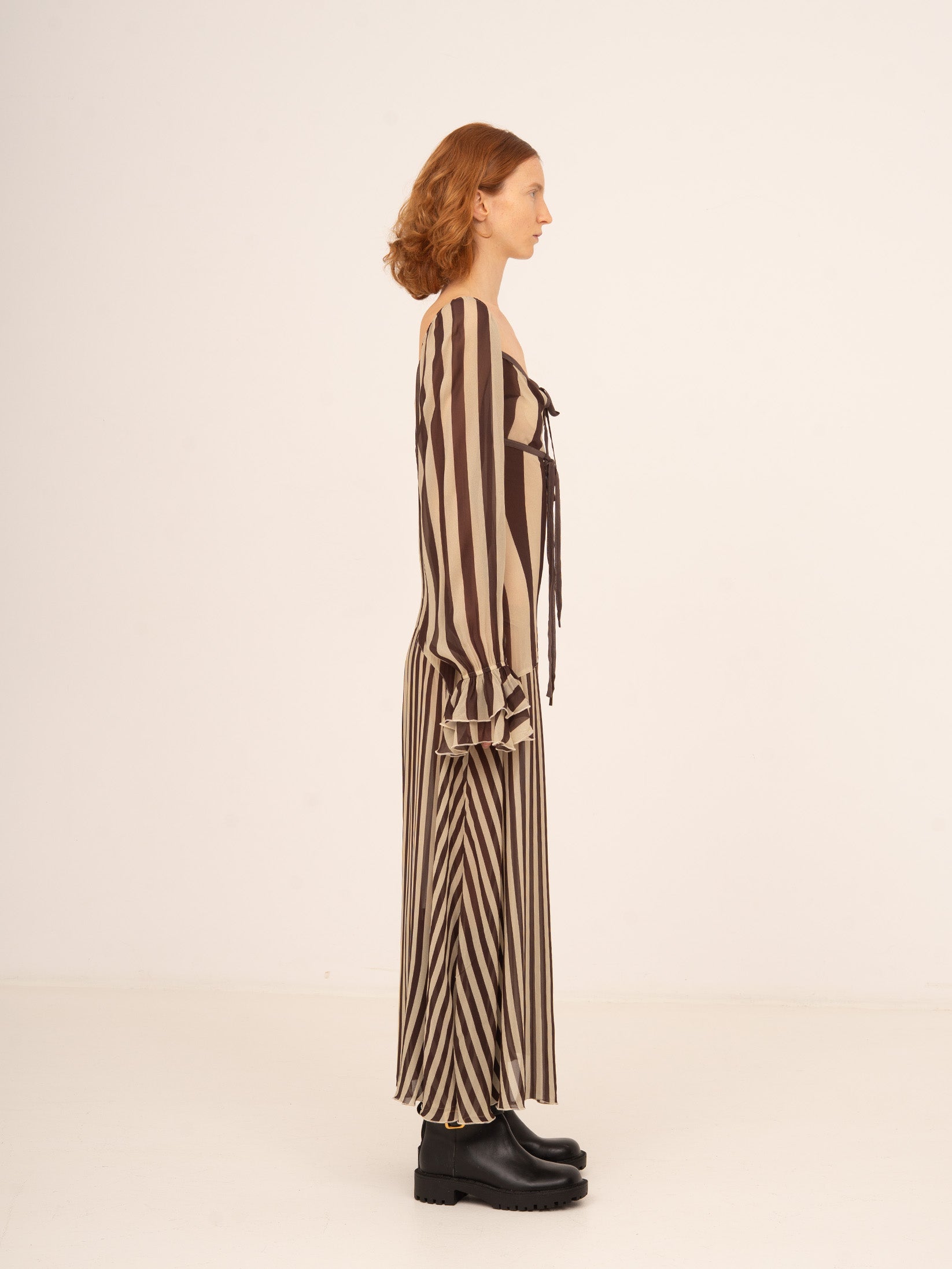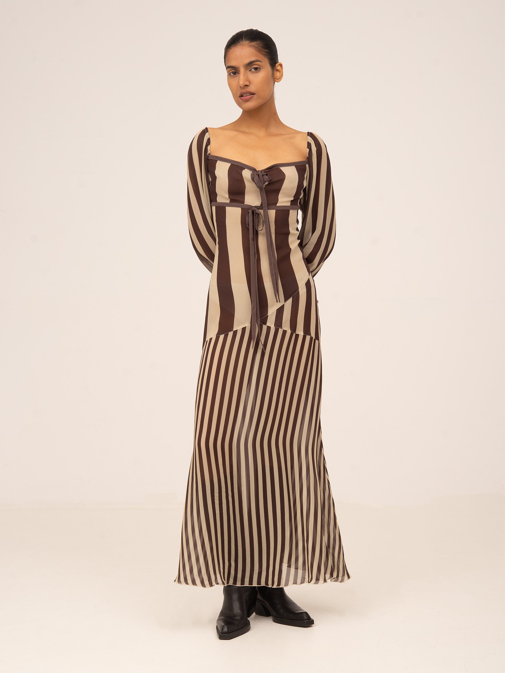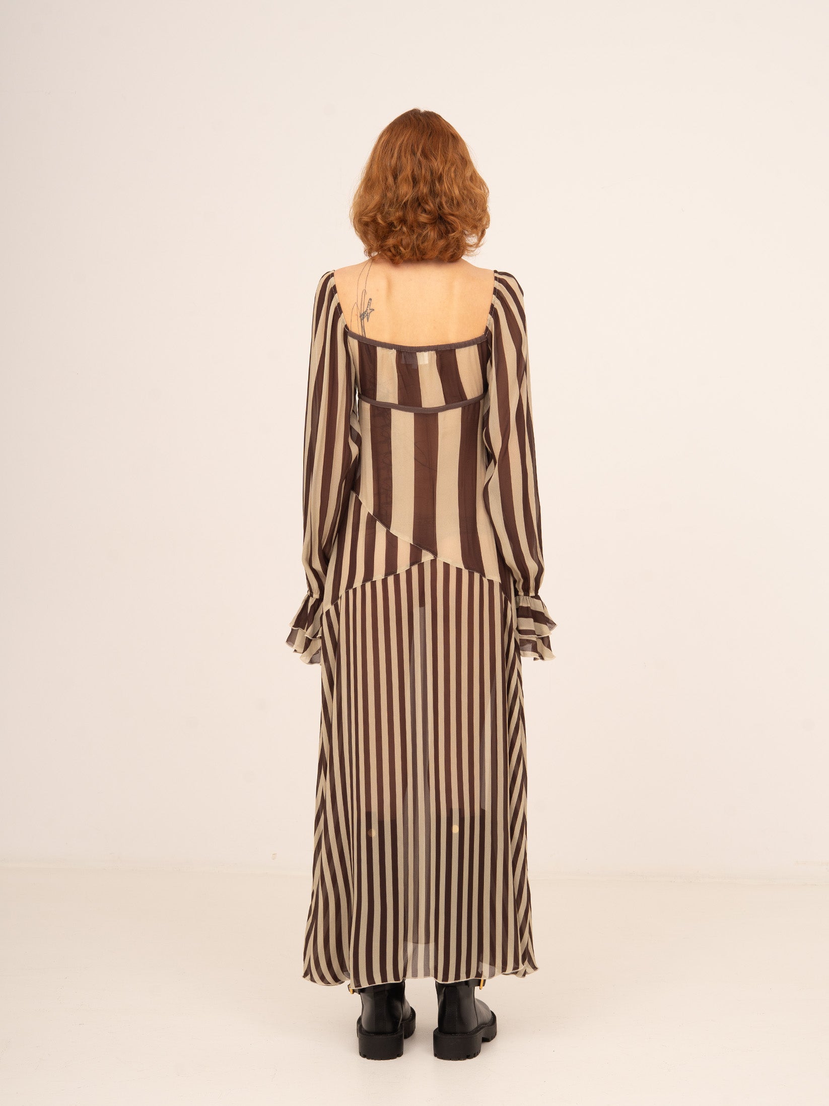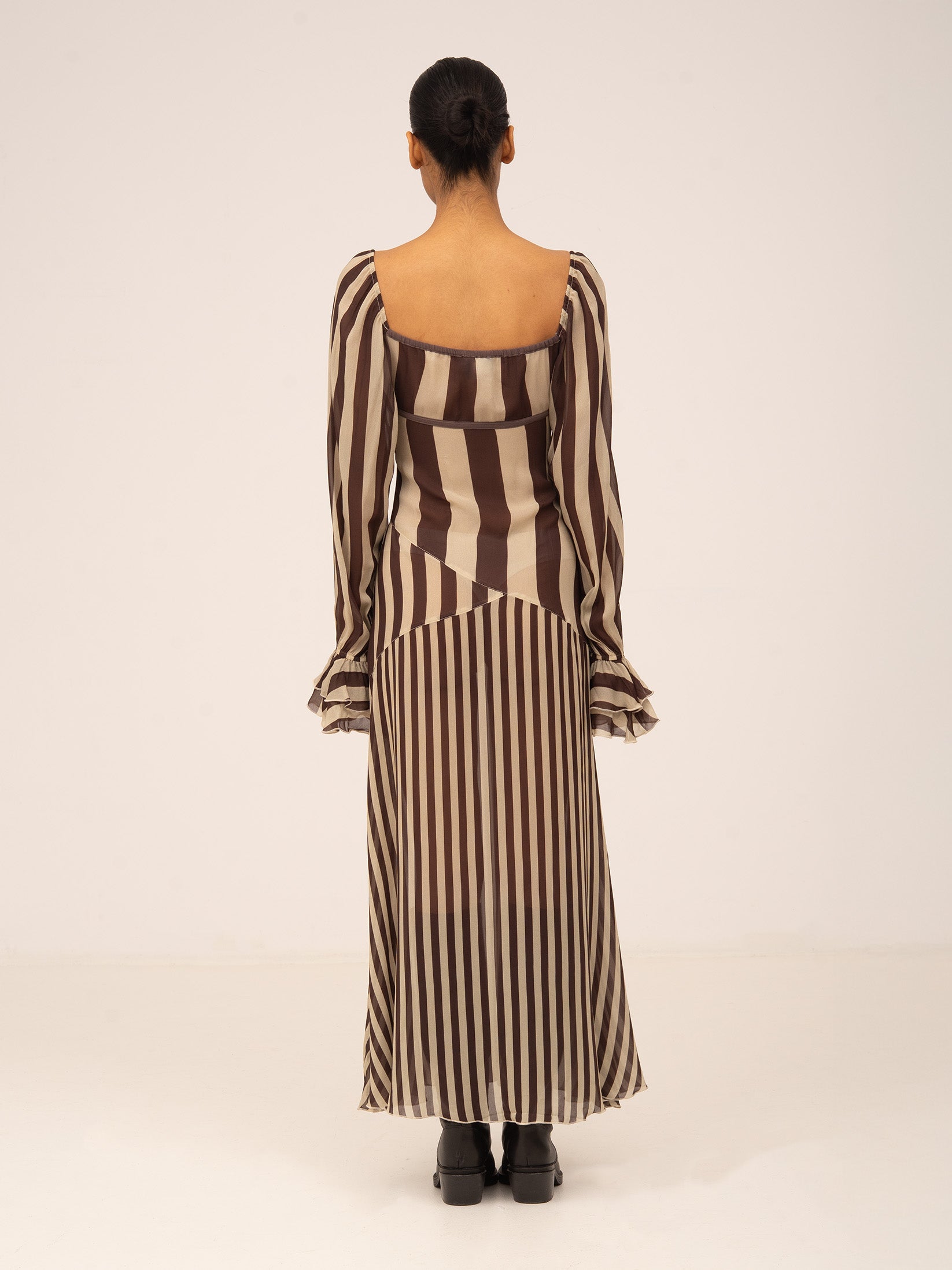 Vestido largo con estampado geométrico de rayas multidireccionales en tonos crema y marrón, una pieza elegante y con mucho carácter. El escote cuadrado con lazadas aporta un toque femenino y estructurado, mientras que las mangas acabadas en volantes añaden movimiento y delicadeza al diseño. Confeccionado en un tejido ligero con buena caída, se adapta al cuerpo con comodidad y estilo. La cremallera invisible lateral asegura un cierre pulido y discreto.