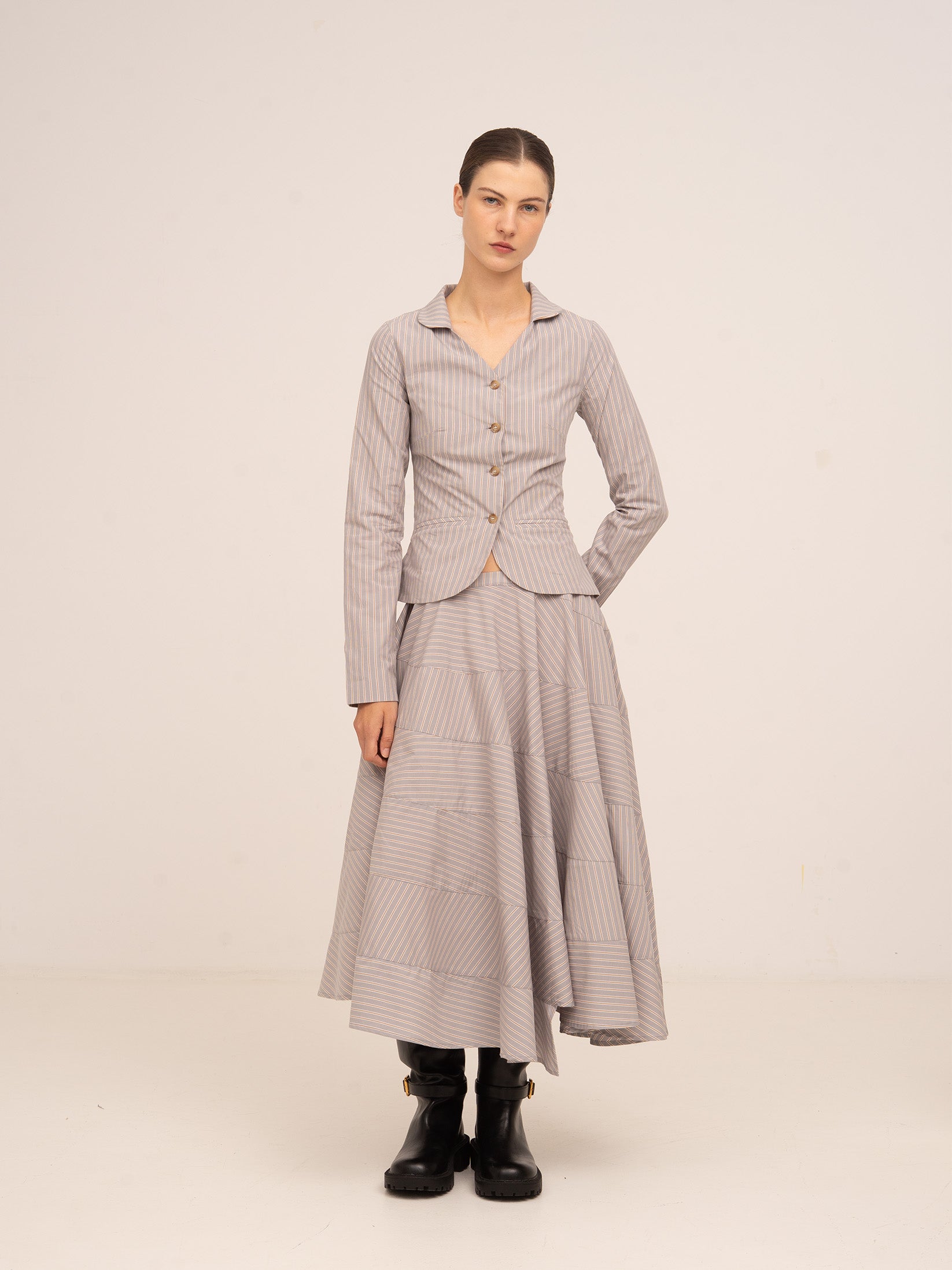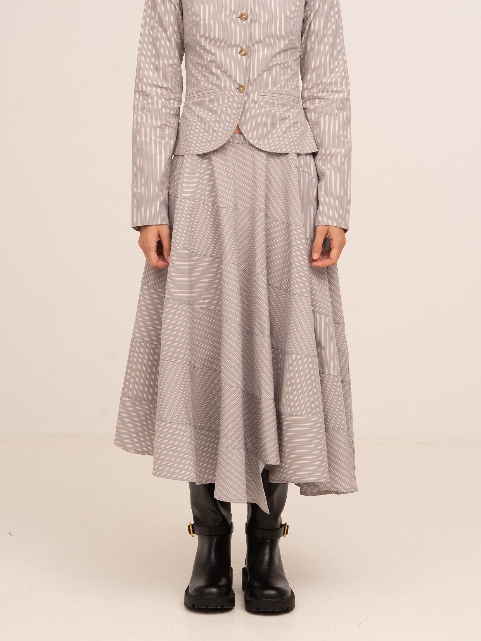 Esta falda midi acampanada combina un corte fluido y asimétrico con un tejido ligero de sutiles rayas que aporta movimiento y sofisticación a cada paso. Su diseño por capas crea un volumen delicado que estiliza la silueta sin perder comodidad, mientras que la cremallera invisible lateral asegura un ajuste impecable.