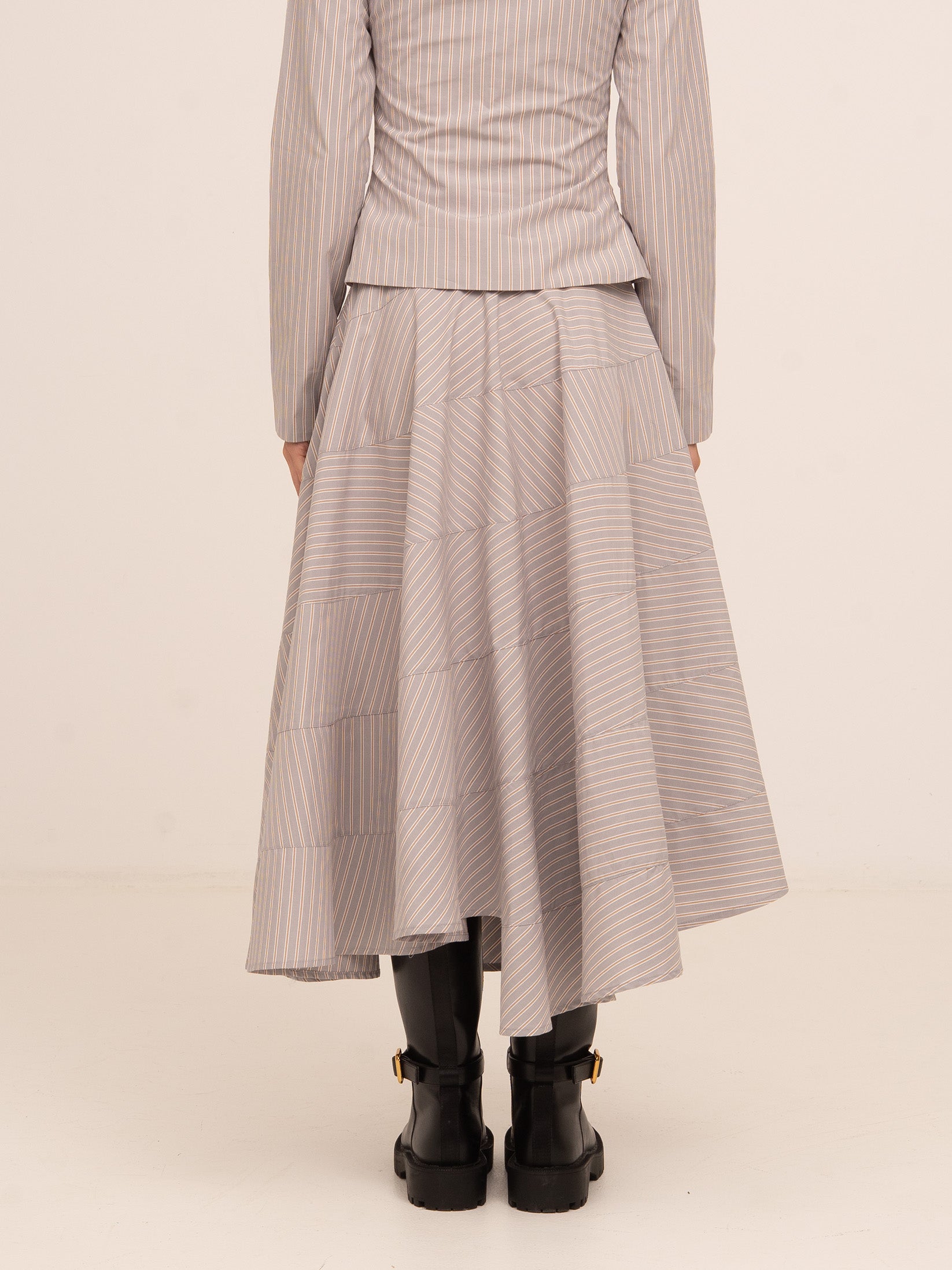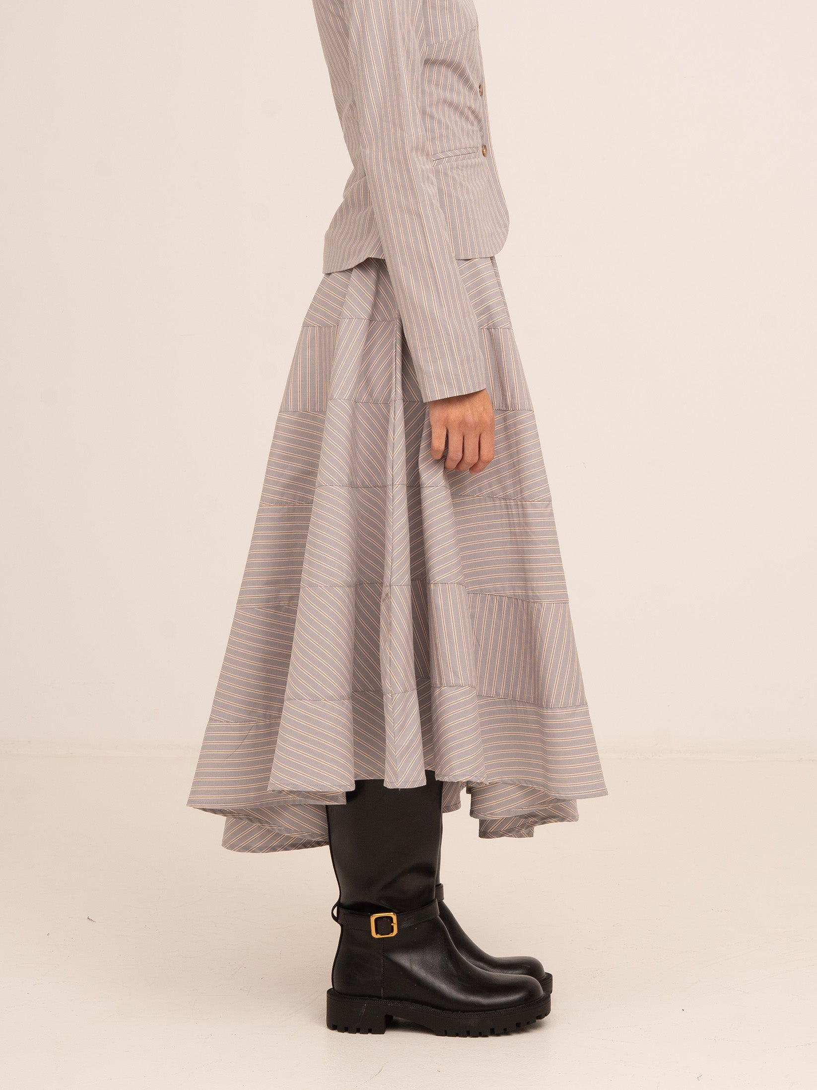 Falda midi de fiesta en gris con vuelo elegante y tejido de rayas.