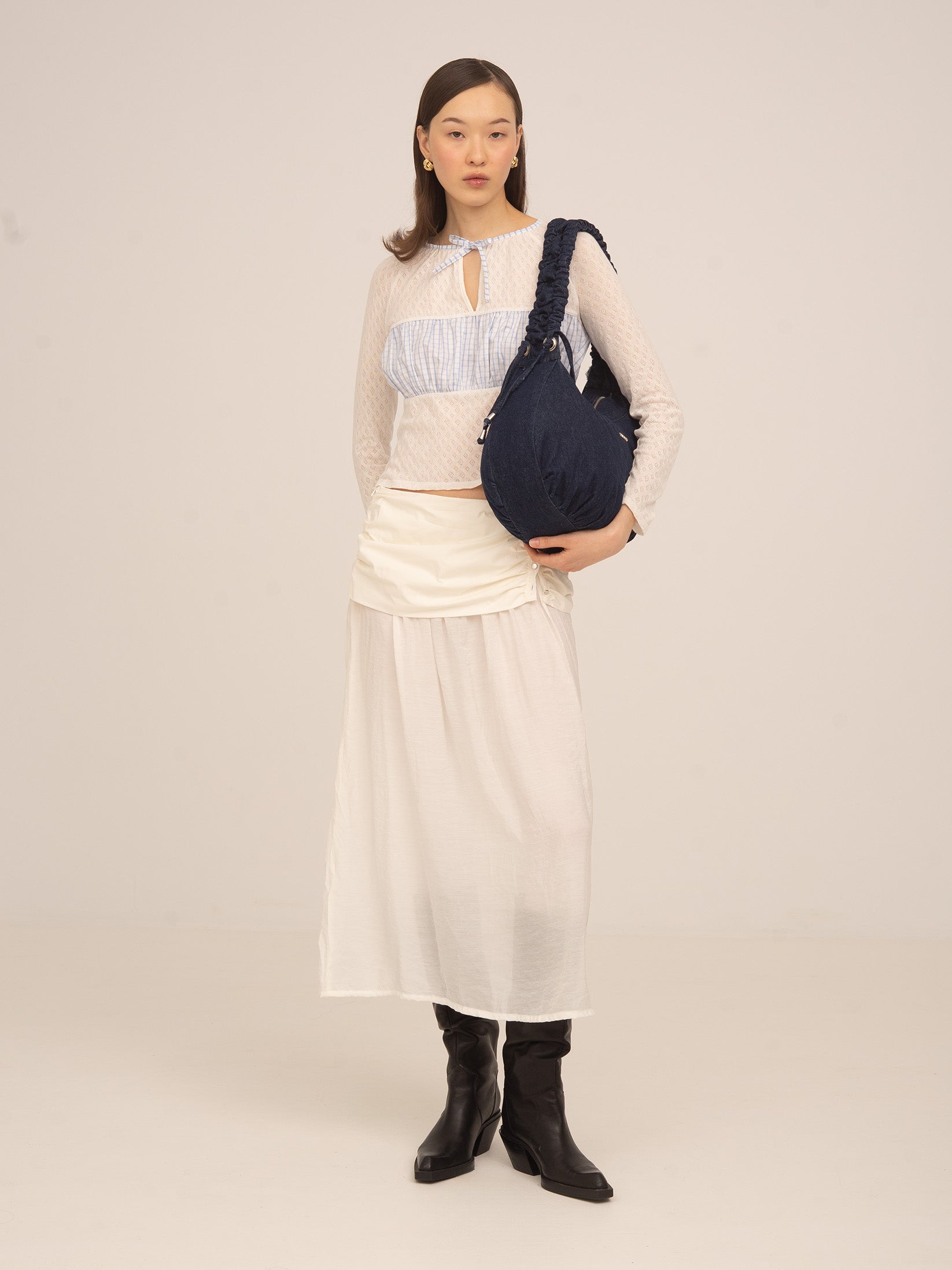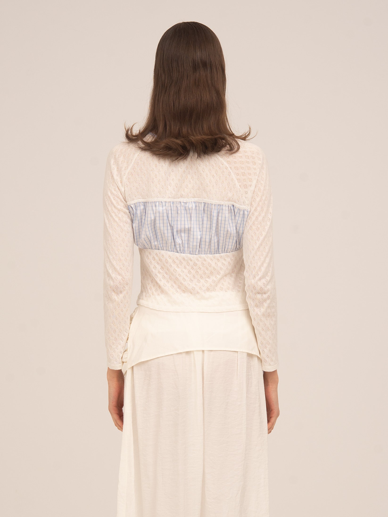 Este top destaca por su escote anudado, que aporta un punto sutilmente sensual, y por el detalle de cambio de tejido con fruncido en el pecho, creando volumen y textura de forma elegante. Las mangas largas de caída suave equilibran el diseño y aportan fluidez, mientras que el tejido jersey elástico garantiza comodidad y un ajuste favorecedor durante todo el día.