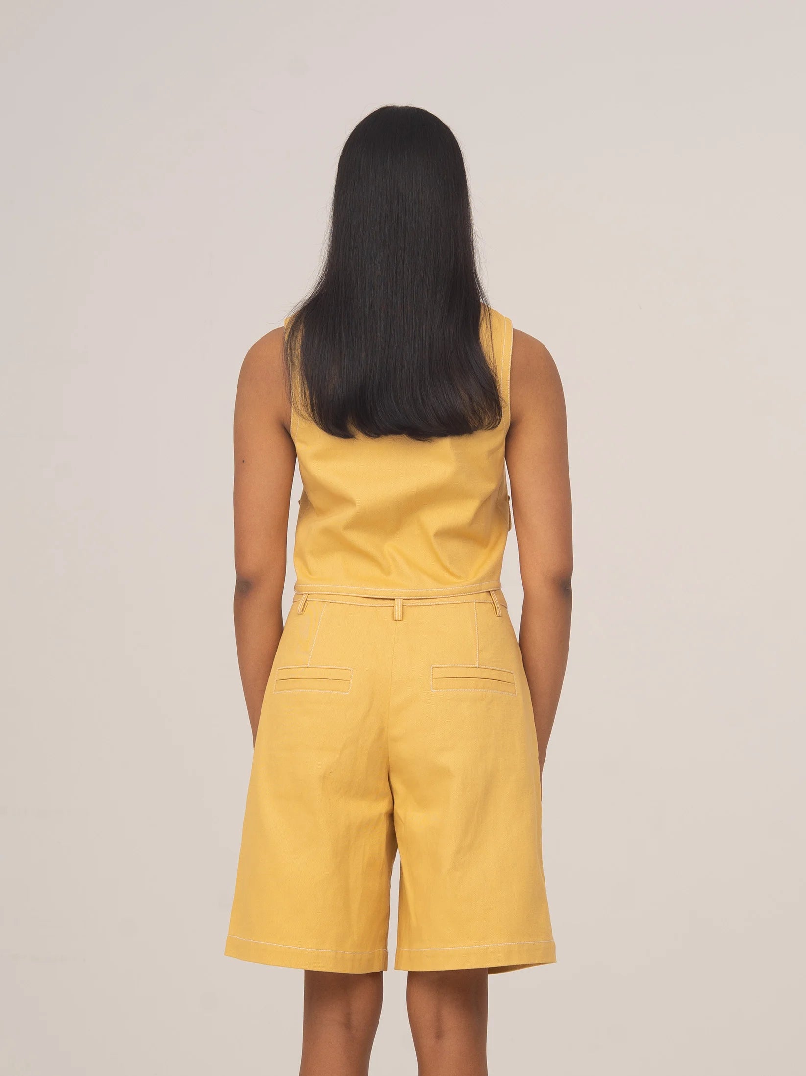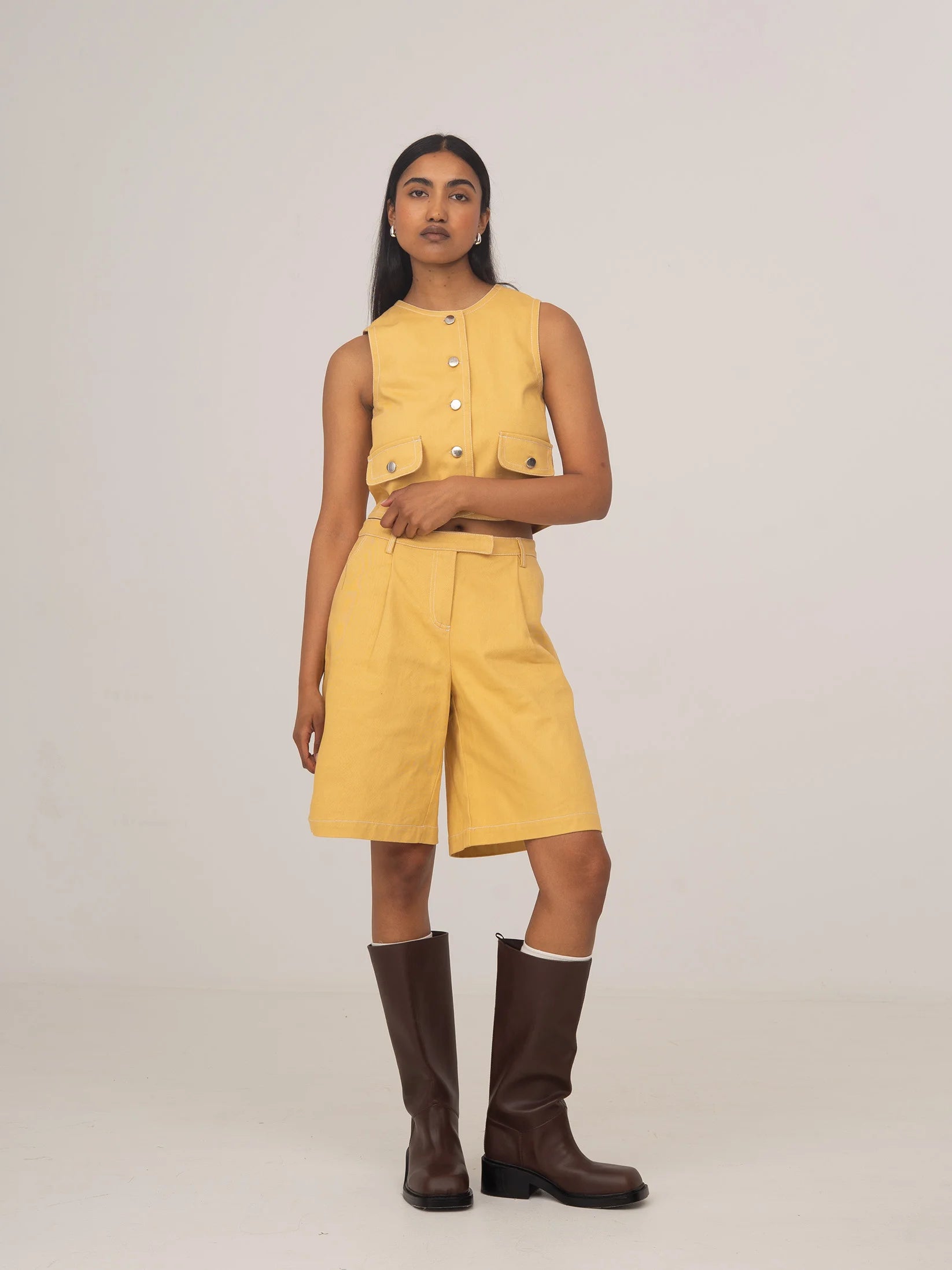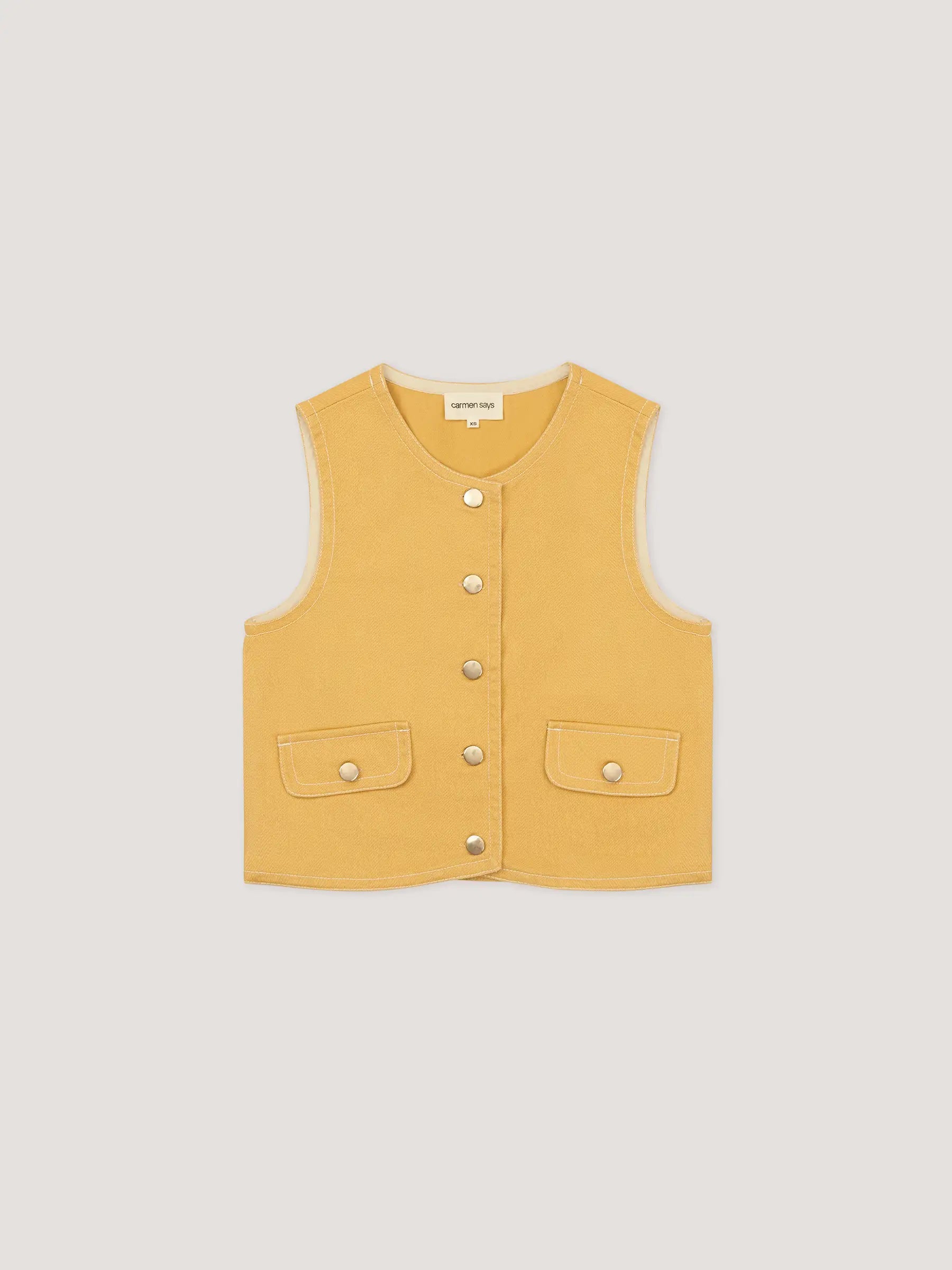 Perfecto para llevar sobre camisas, vestidos o tops ligeros, este chaleco amarillo de denim es una prenda clave para crear conjuntos casuales con un punto sofisticado, ideal para el día a día o para looks urbanos con estilo.