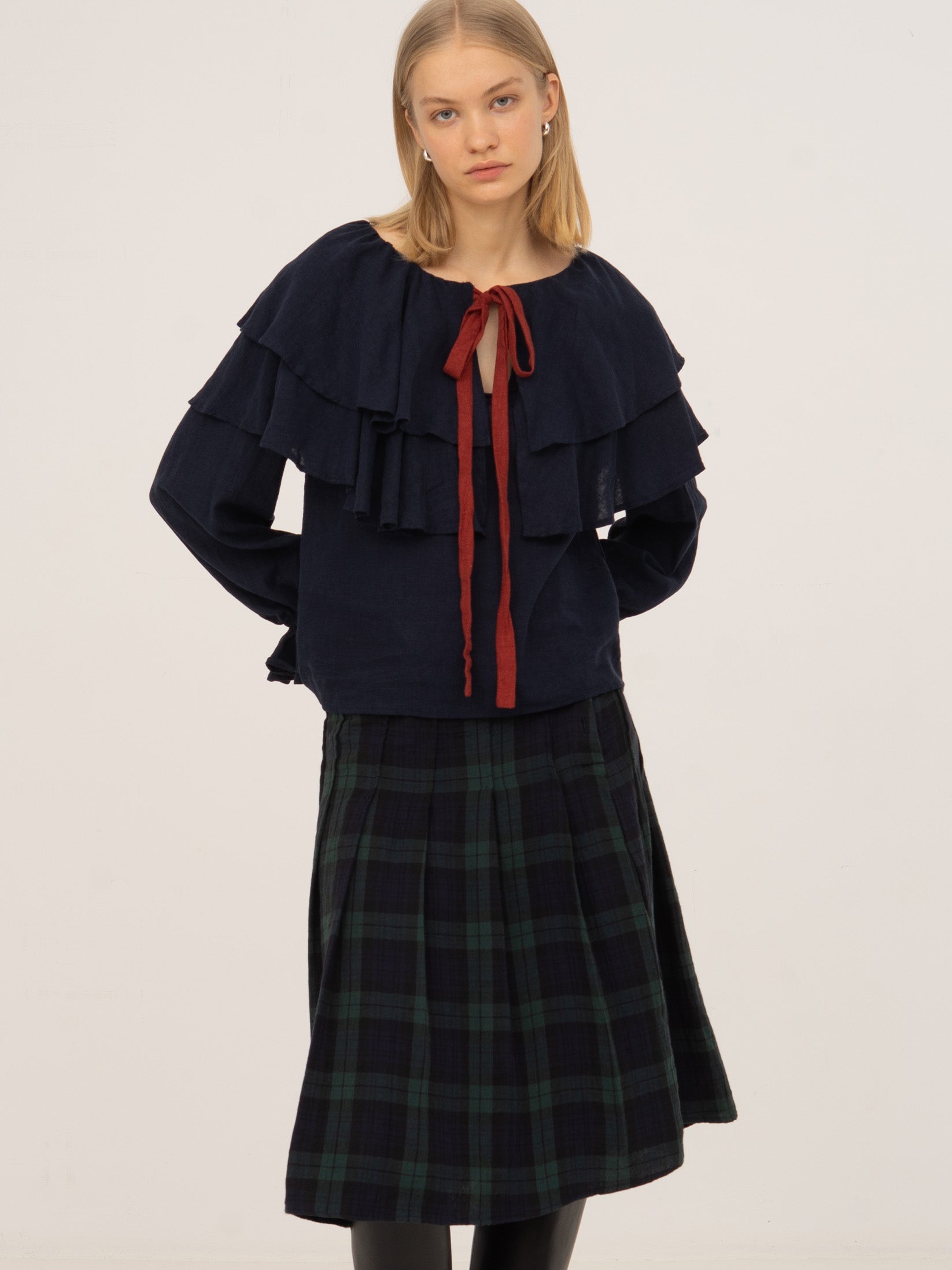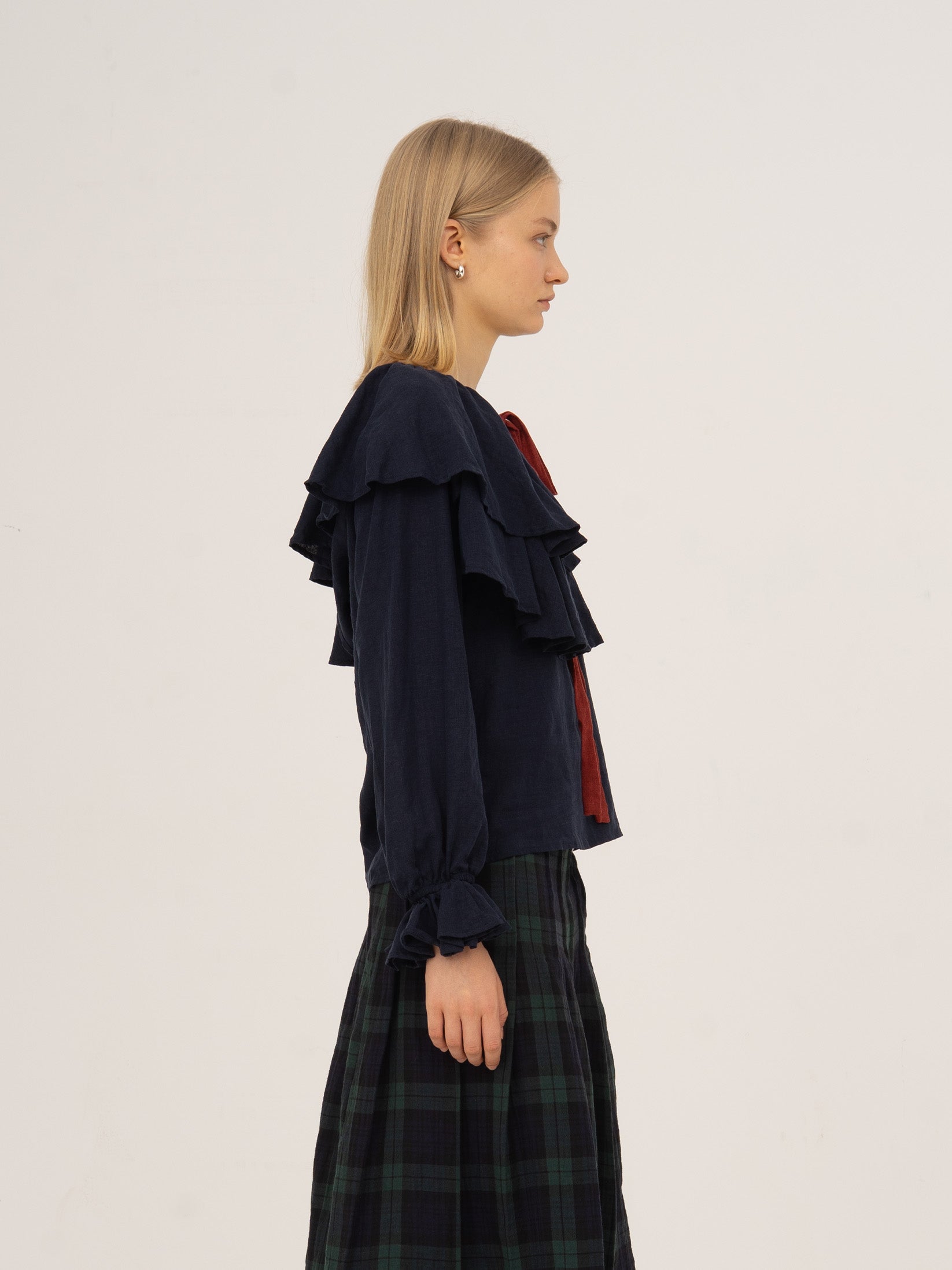 La blusa Evermore combina delicadeza y presencia en un diseño que destaca por su tono azul profundo y los volantes que enmarcan el escote con suavidad. Su cierre delantero mediante lazo en rojo añade un contraste vibrante y femenino, convirtiéndola en una prenda con carácter propio. Las mangas ligeramente abullonadas aportan volumen y una silueta actual, manteniendo la comodidad y fluidez en cada movimiento.