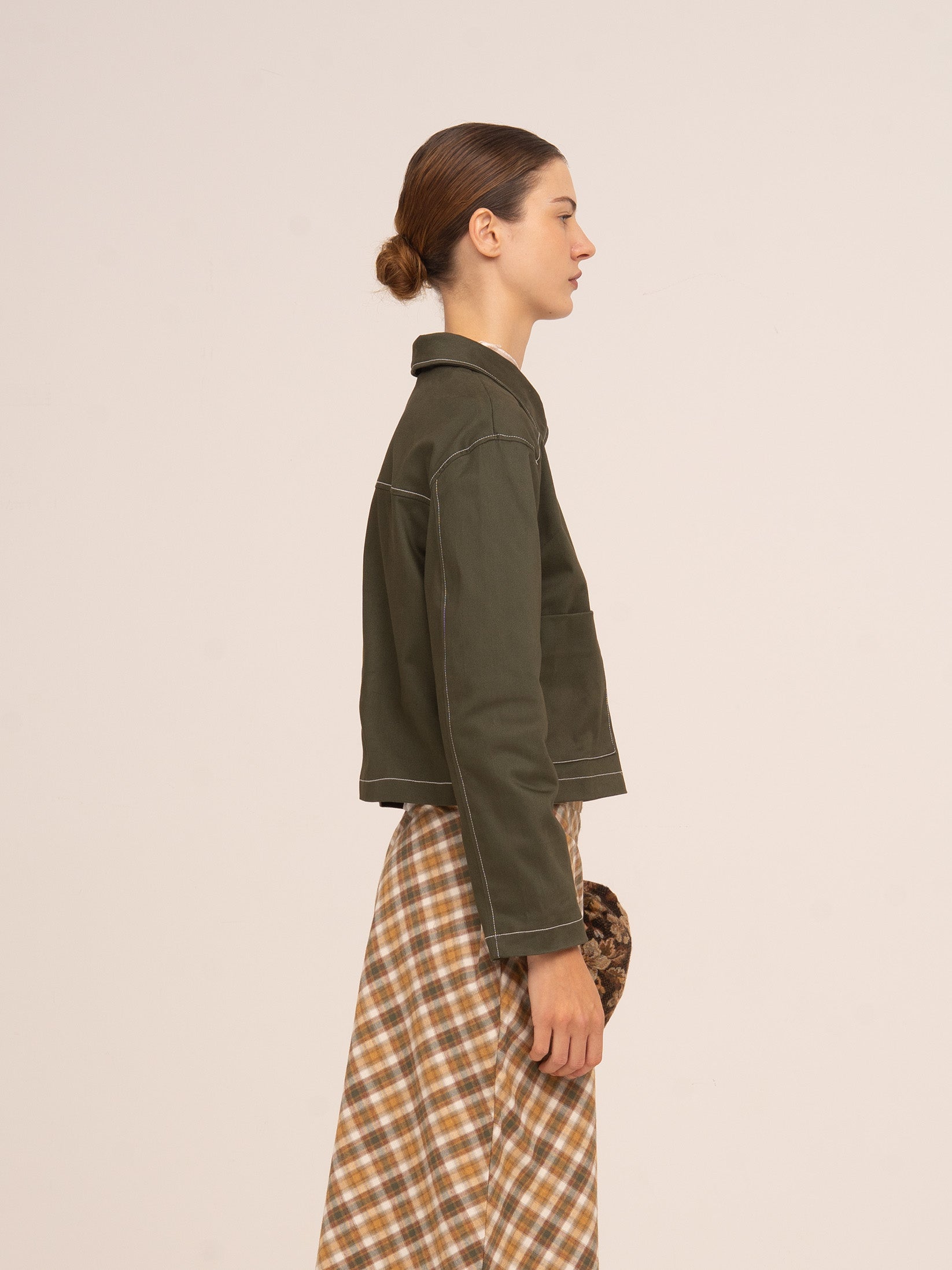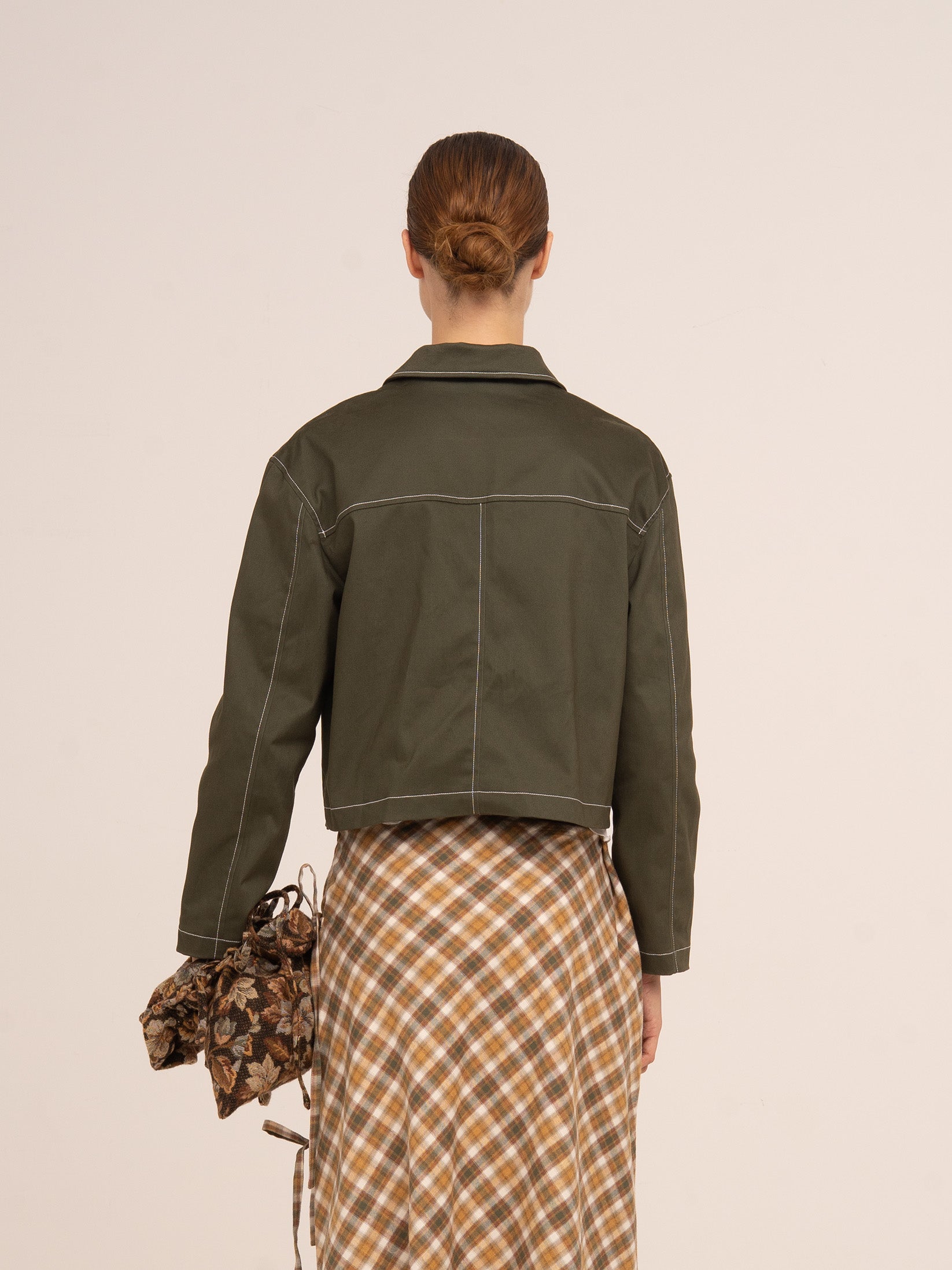 Chaqueta en tono verde. De manga larga. Detalle de bolsillos en el delantero. Cierre mediante botonadura central.