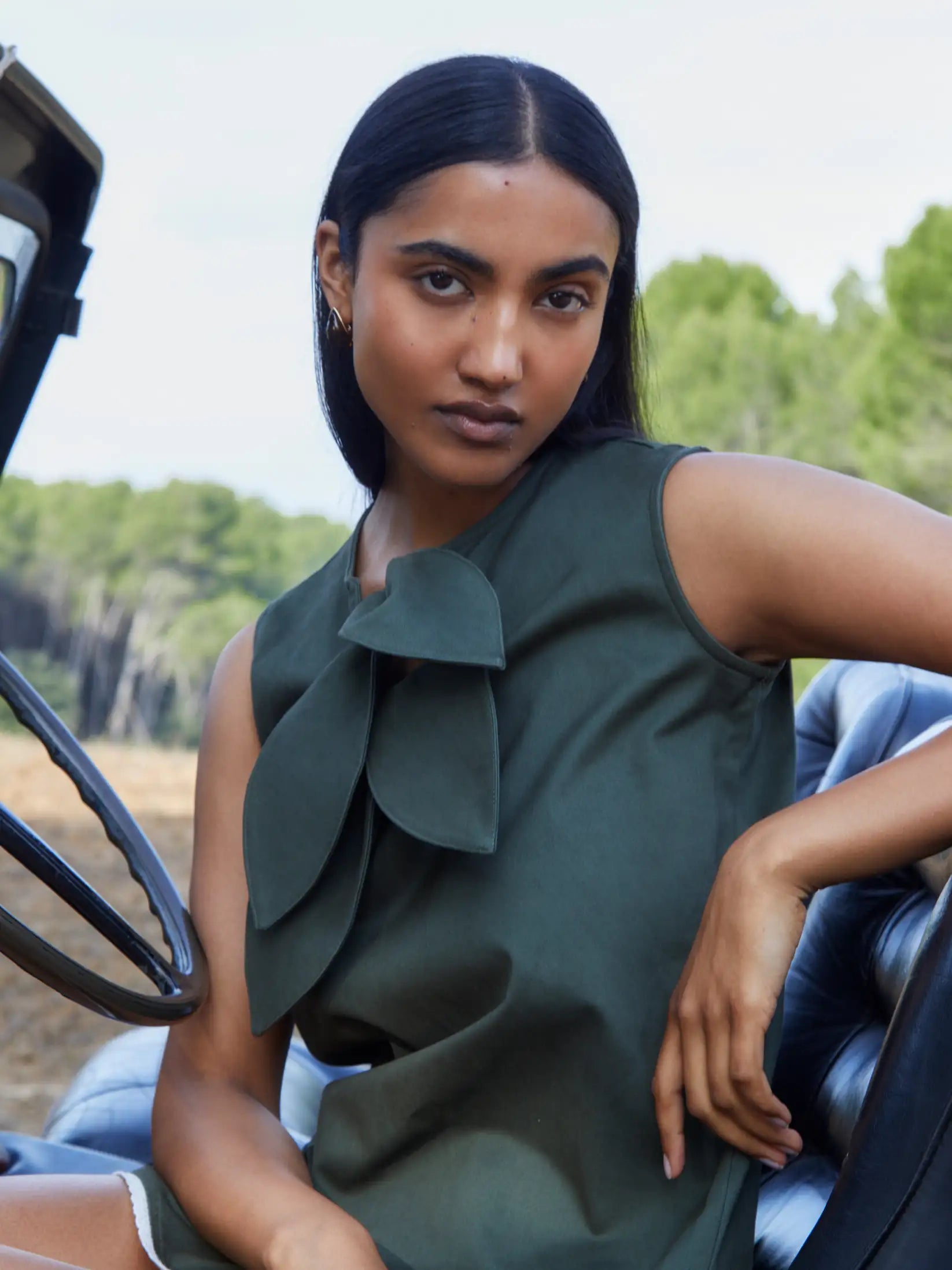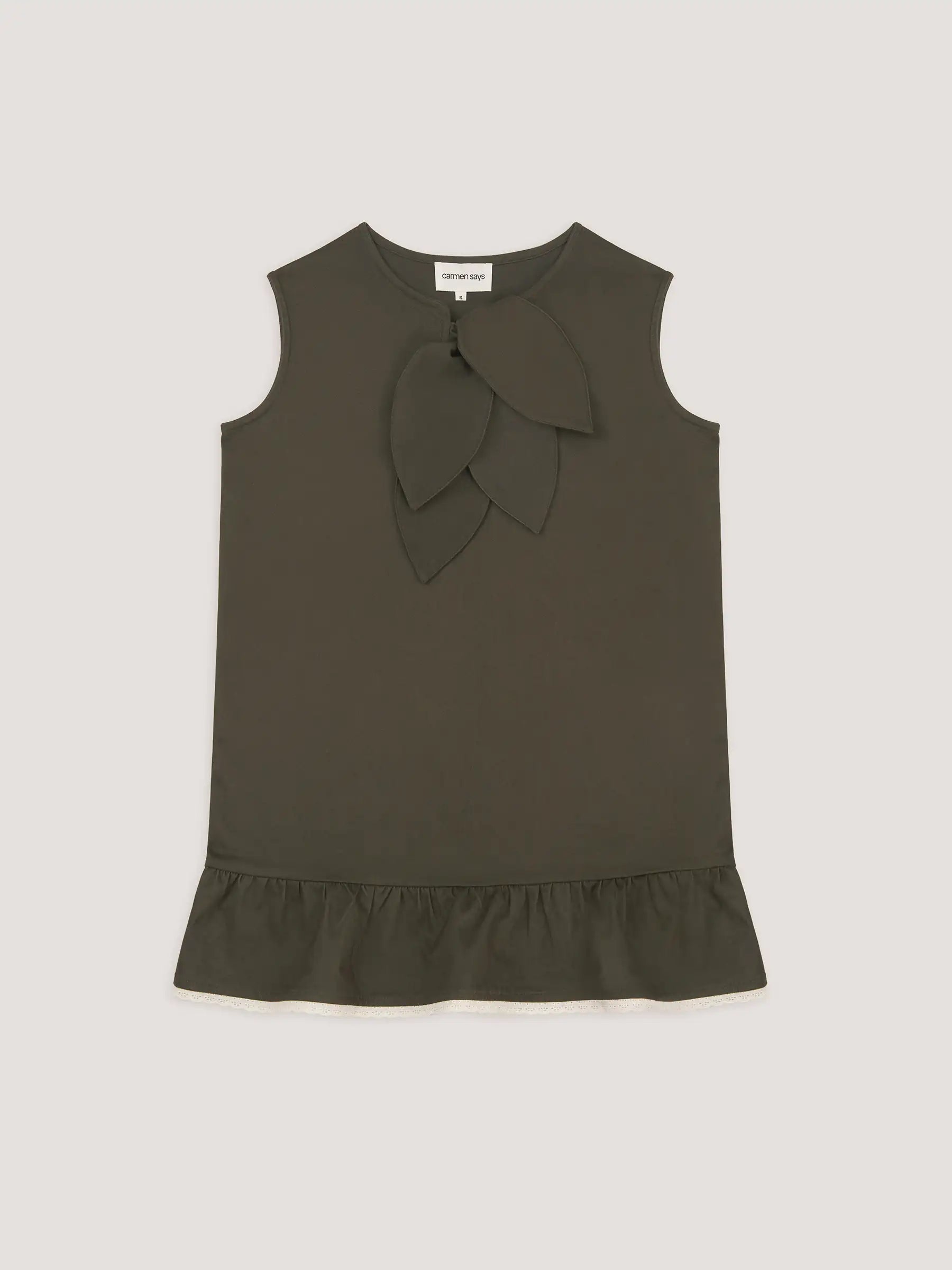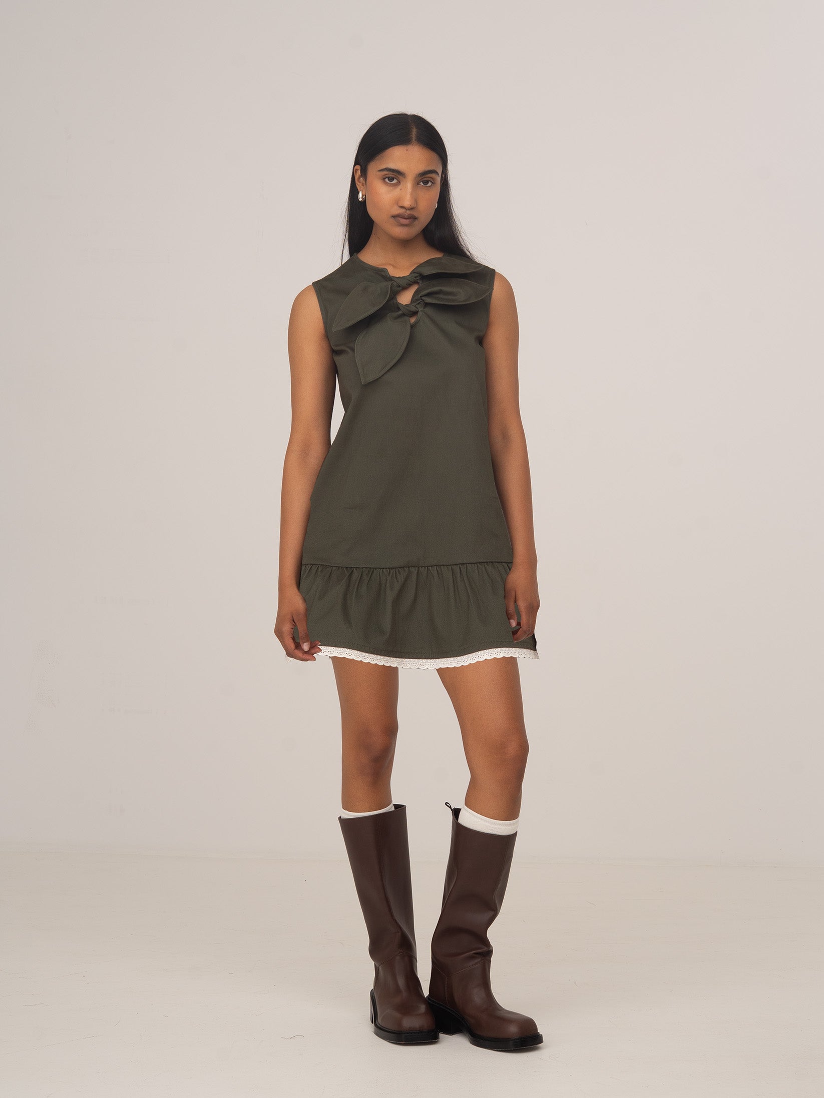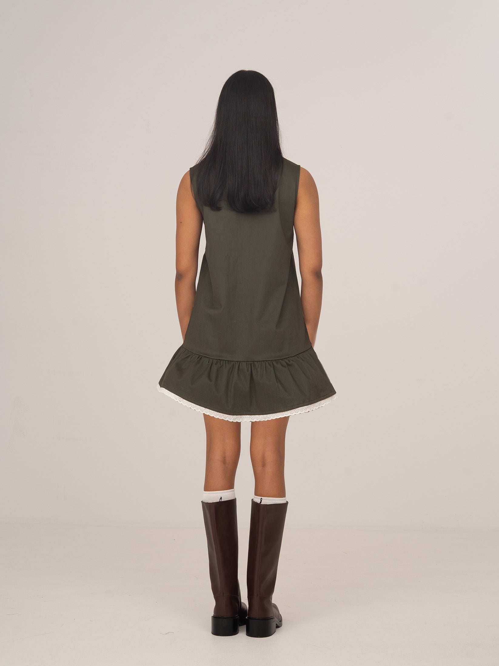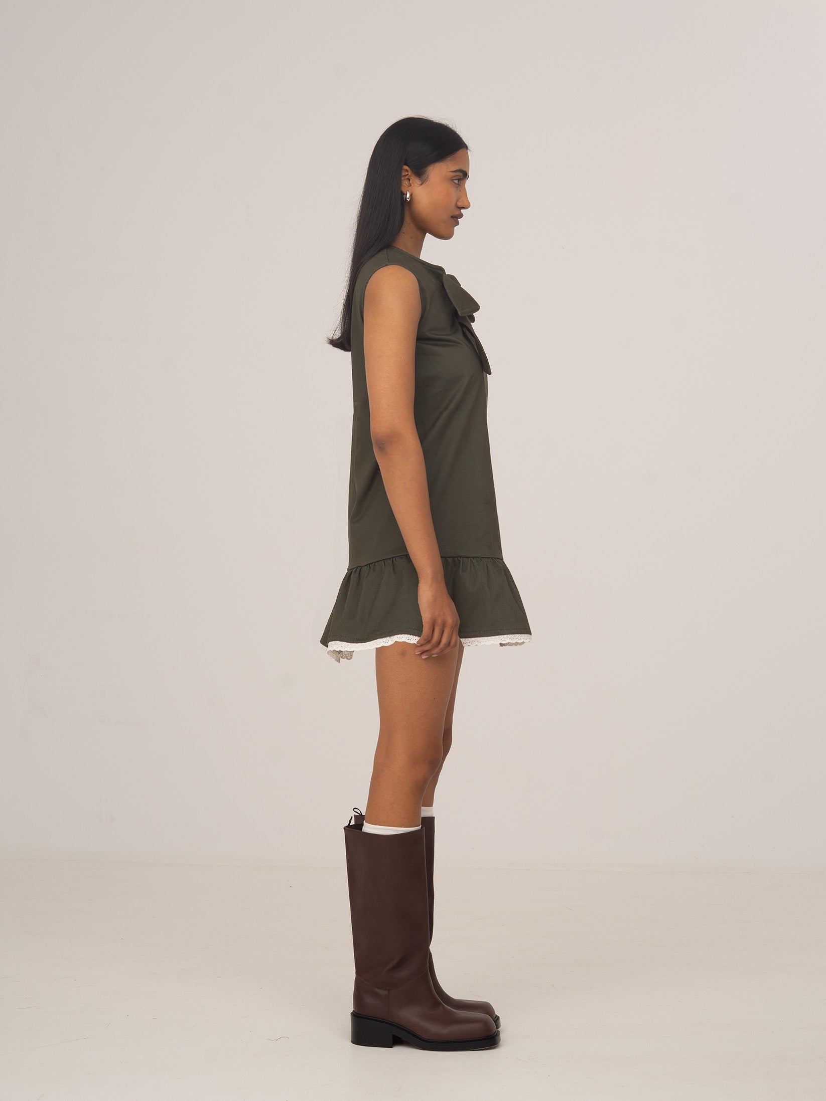 El vestido mini verde sin mangas está confeccionado en un tono verde elegante y atemporal, con escote lágrima adornado con lazos en forma de hoja que aportan un aire delicado y coqueto. Su bajo se completa con un mini volante decorado con puntilla blanca, que añade dinamismo y feminidad al diseño. Ideal para combinar con botas altas para un look urbano o con sandalias para un estilo más relajado, este vestido mini se convierte en una prenda clave de temporada.