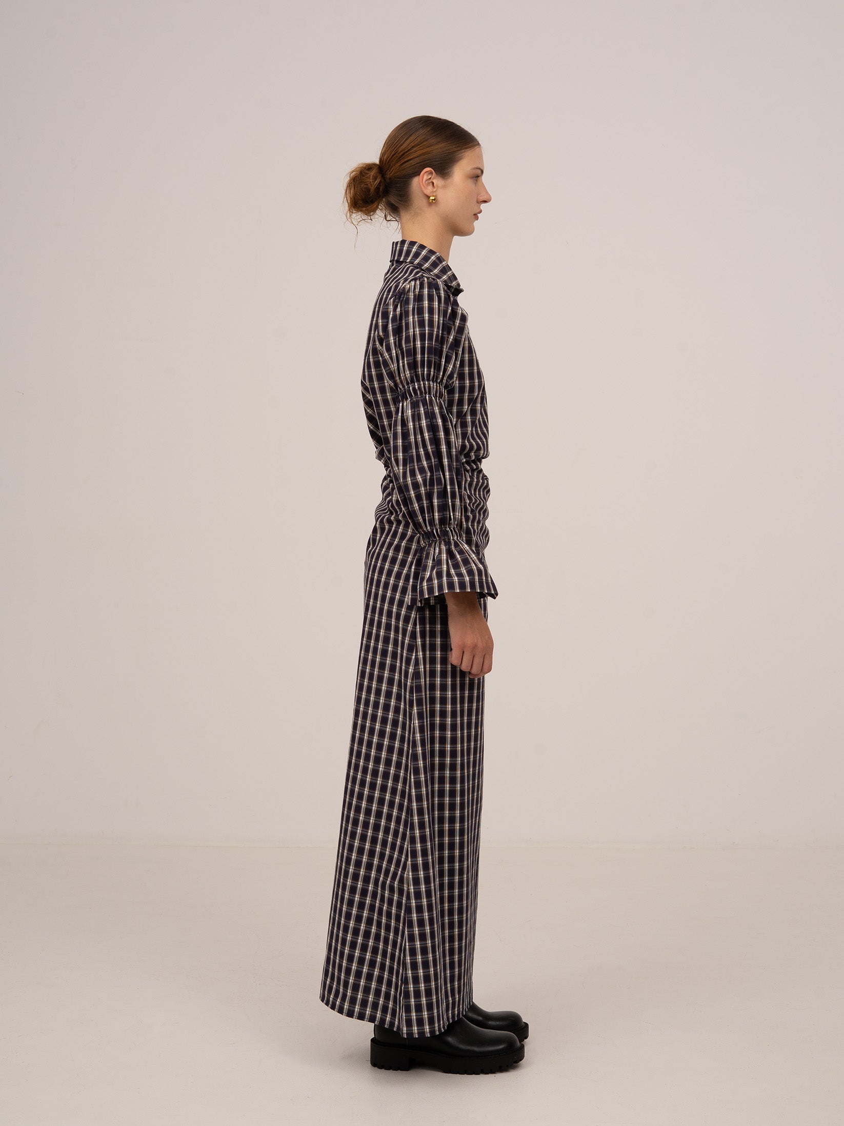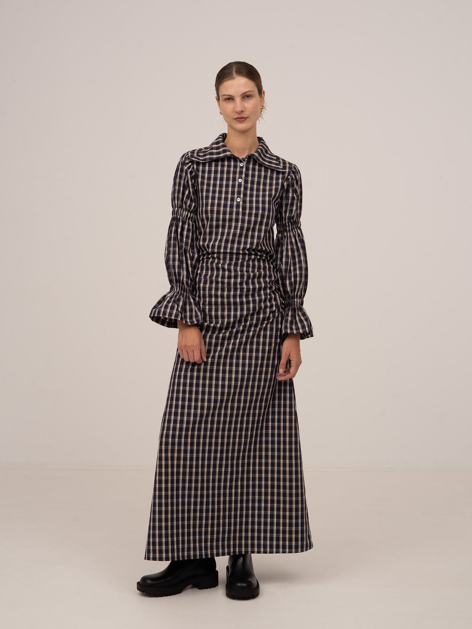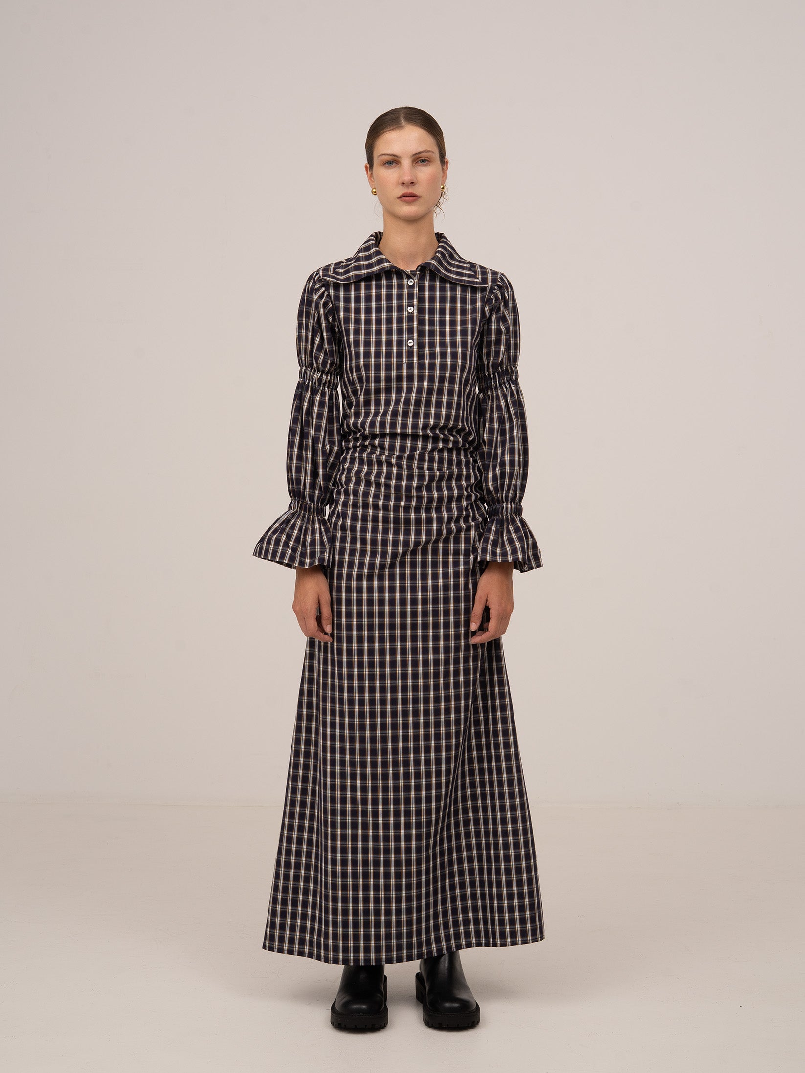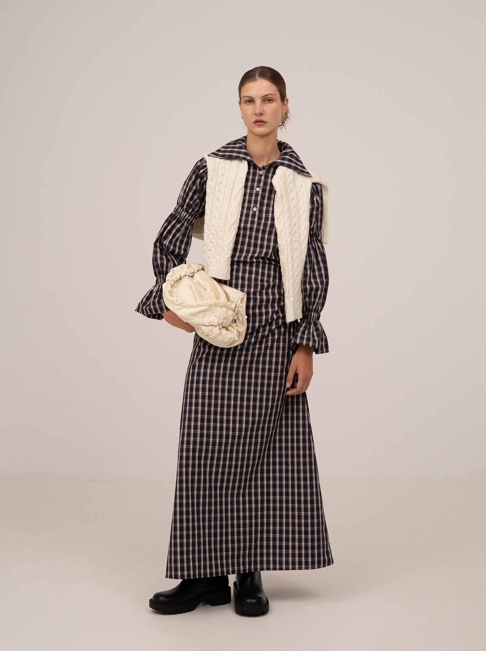 Vestido maxi de cuadros en tonos azules con un elegante cuello contrastado que aporta un toque distintivo y sofisticado.