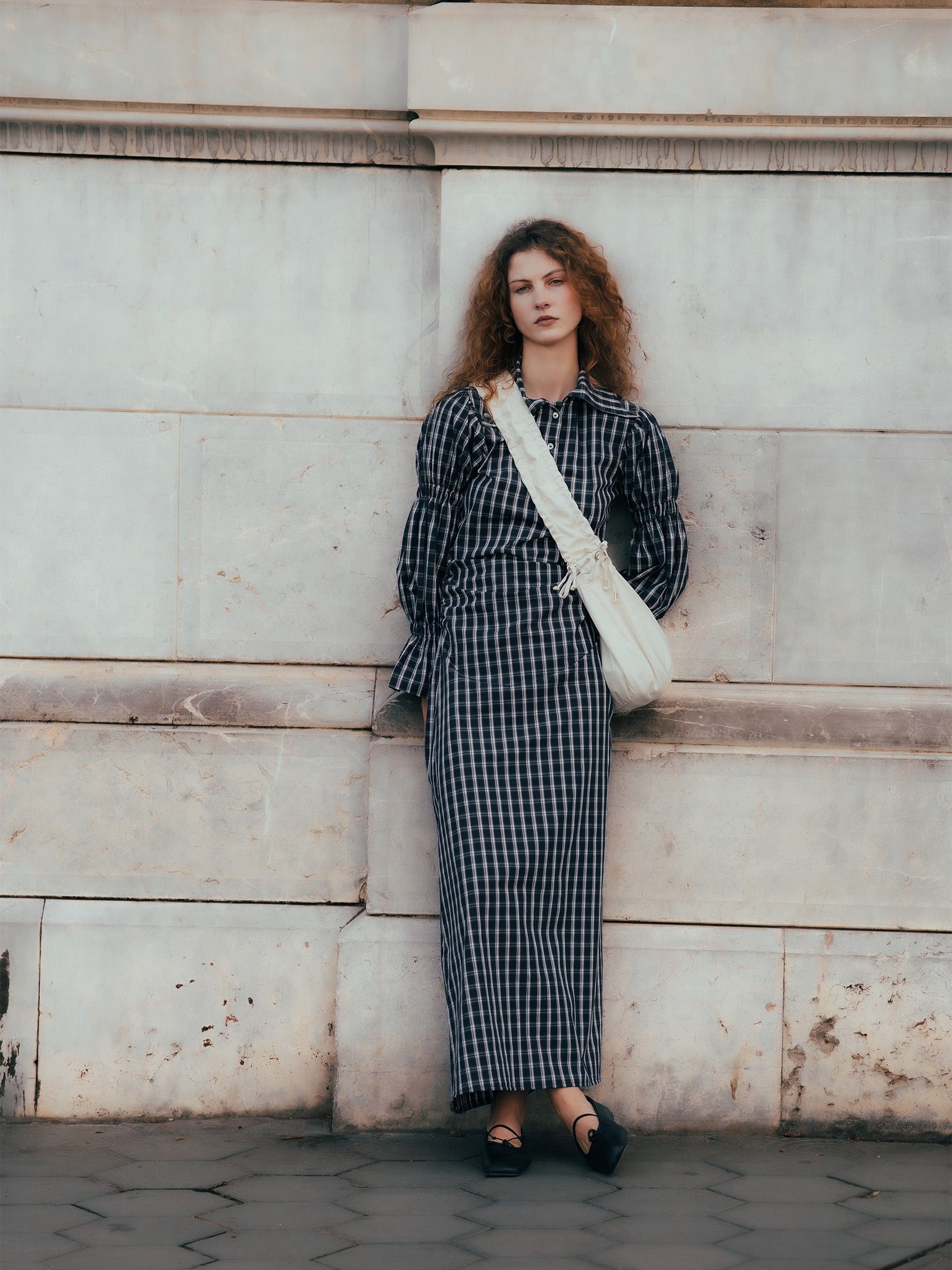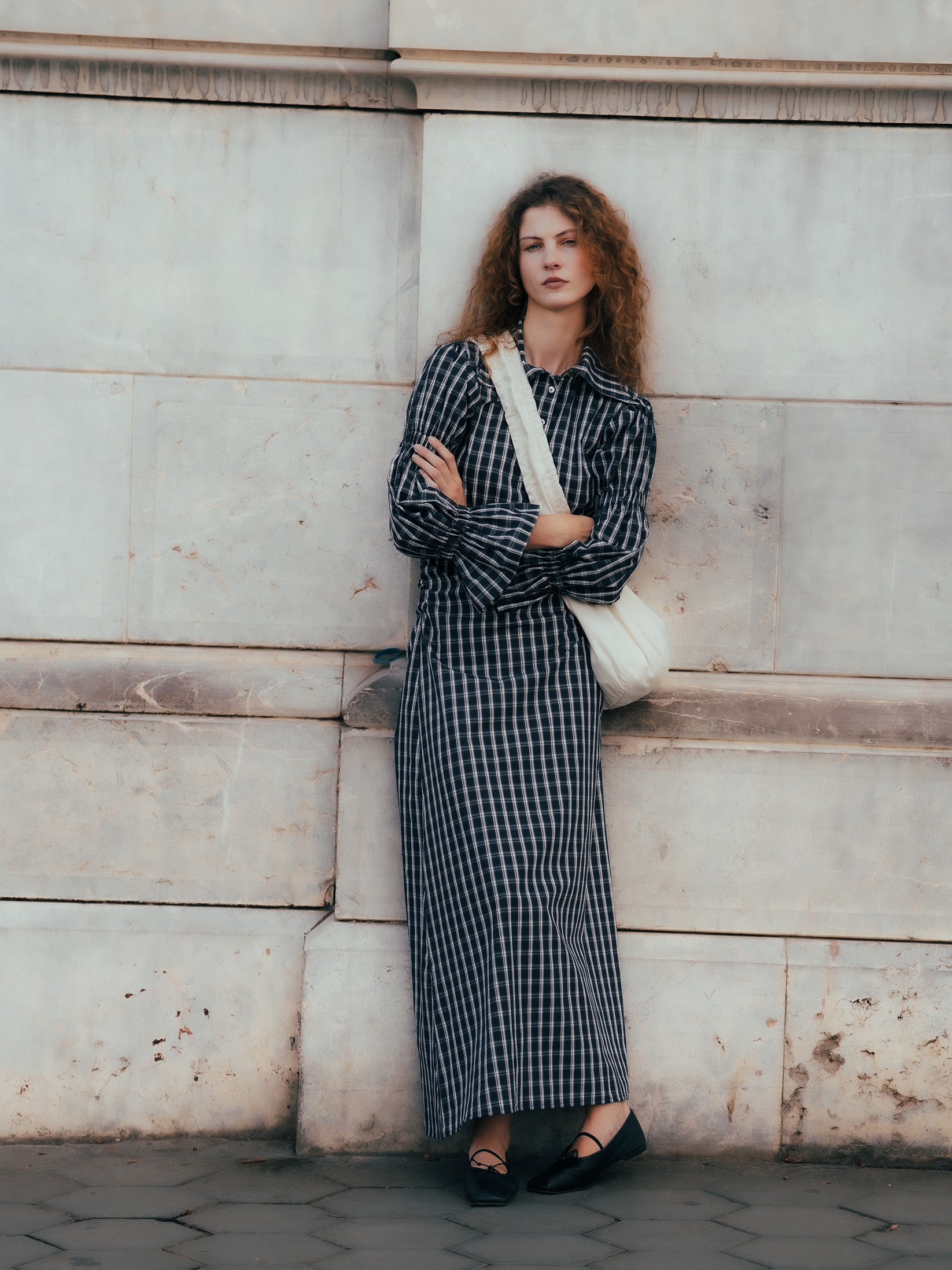 Su silueta larga y fluida se equilibra con unas mangas abullonadas de aire romántico, creando un diseño lleno de carácter y presencia. Confeccionado en un tejido con cuerpo y caída suave, este vestido maxi de cuadros resulta cómodo y muy favorecedor, ideal para eventos de día, encuentros especiales o estilismos urbanos donde quieras destacar con un look refinado y actual. La cremallera invisible asegura un acabado impecable y una puesta fácil y pulida.