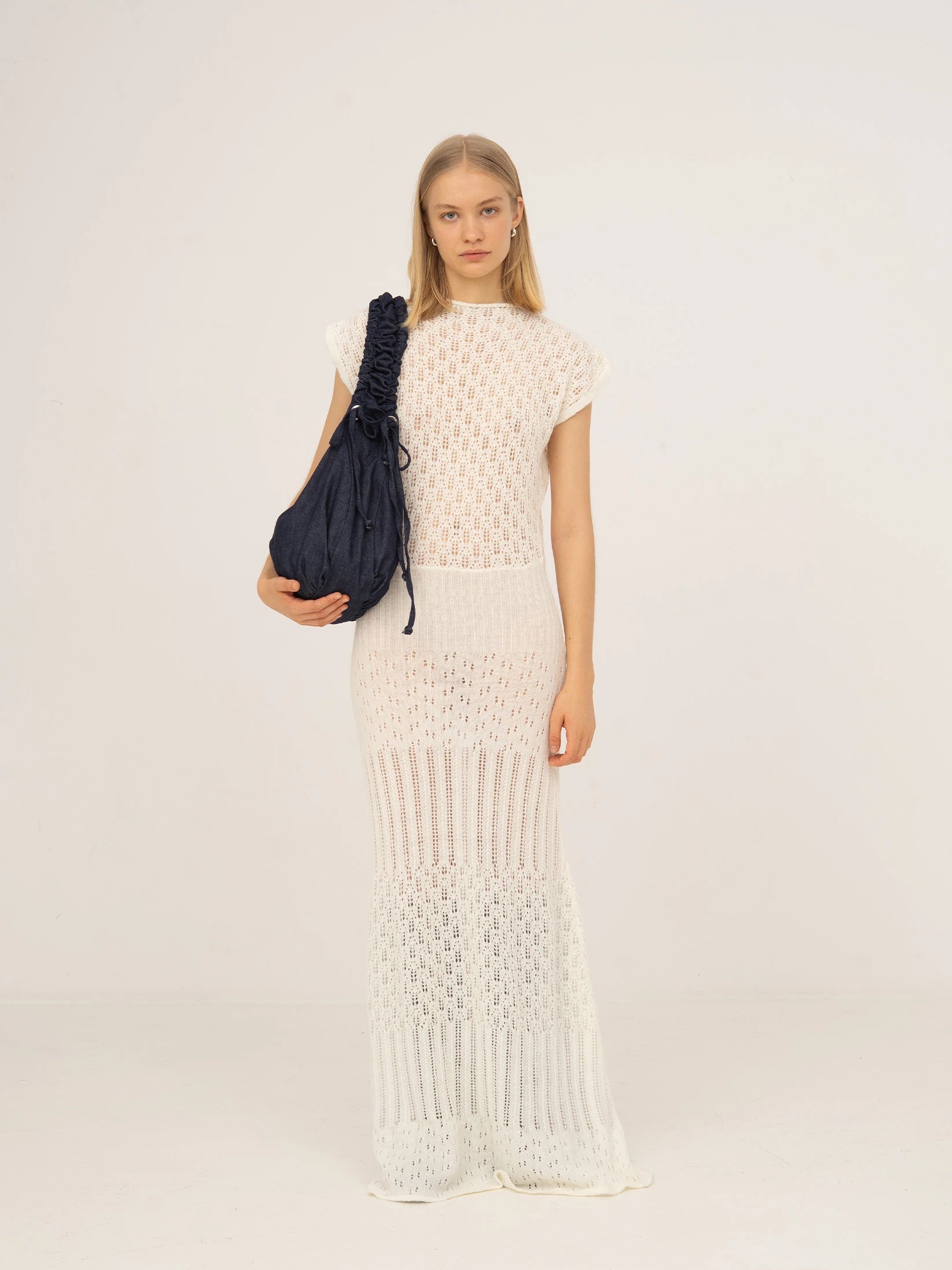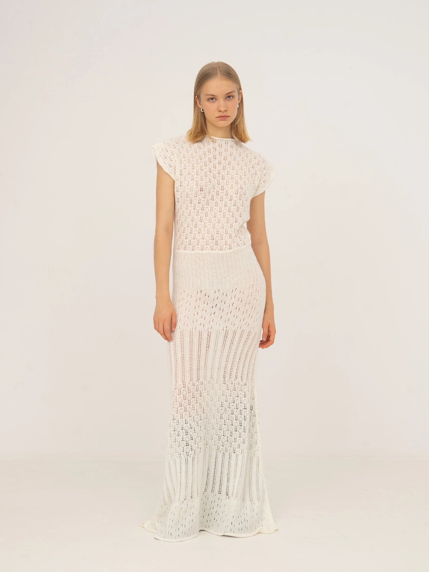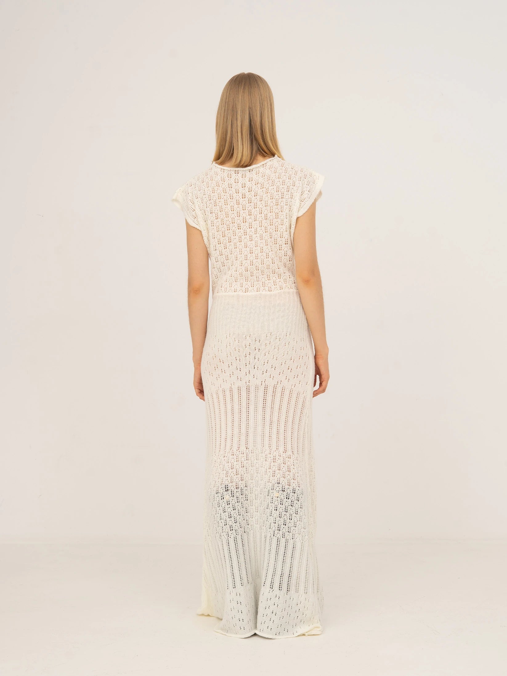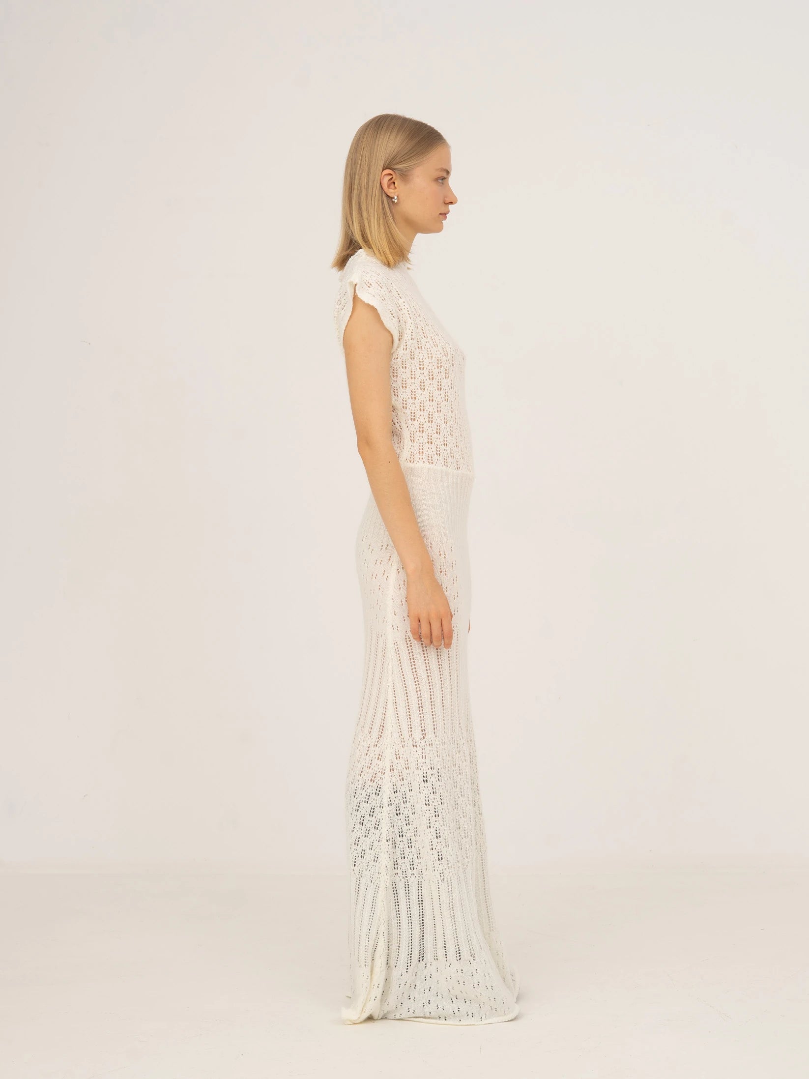 Vestido largo de punto en tono blanco con cintura ajustada y manga corta.