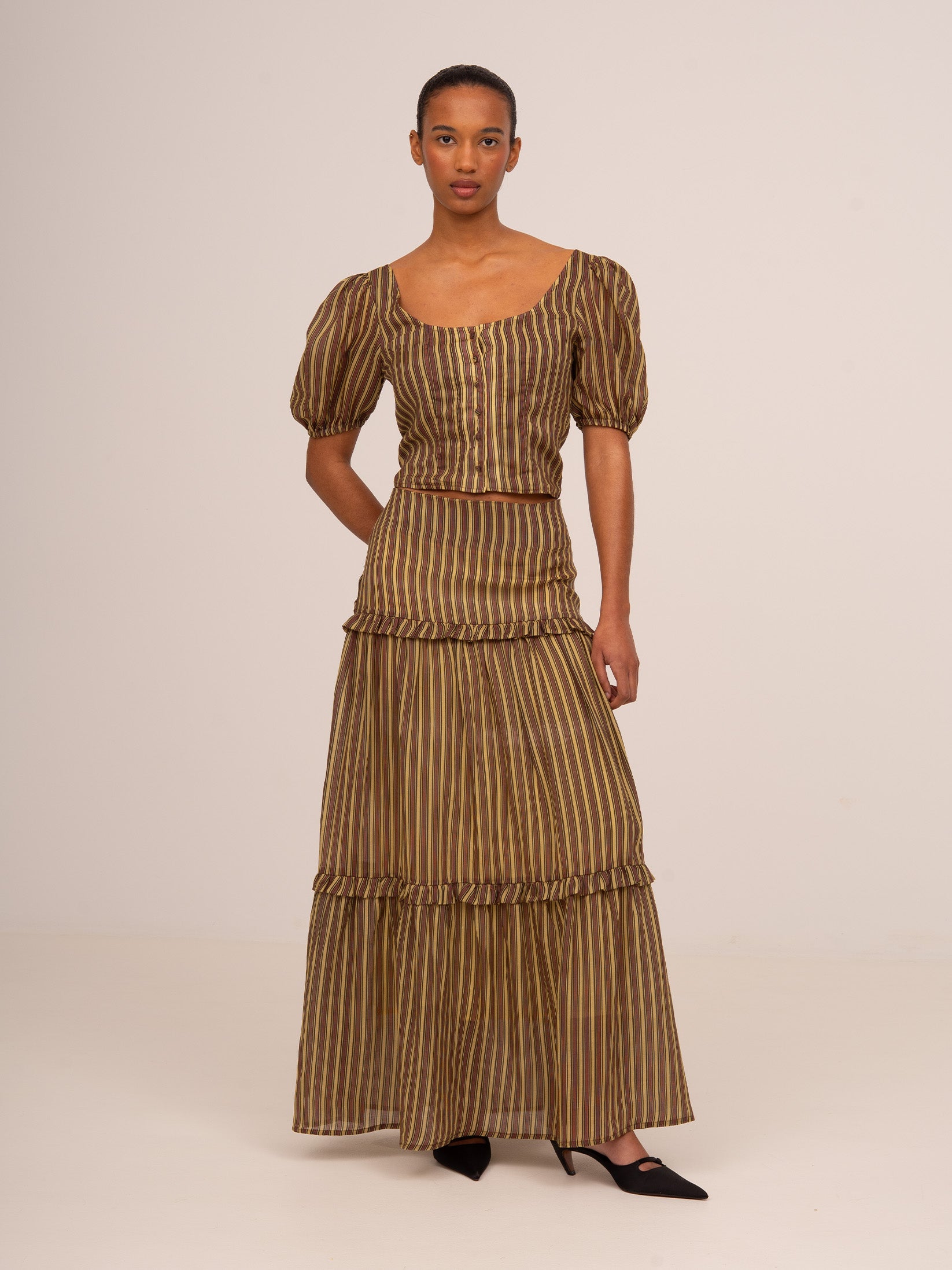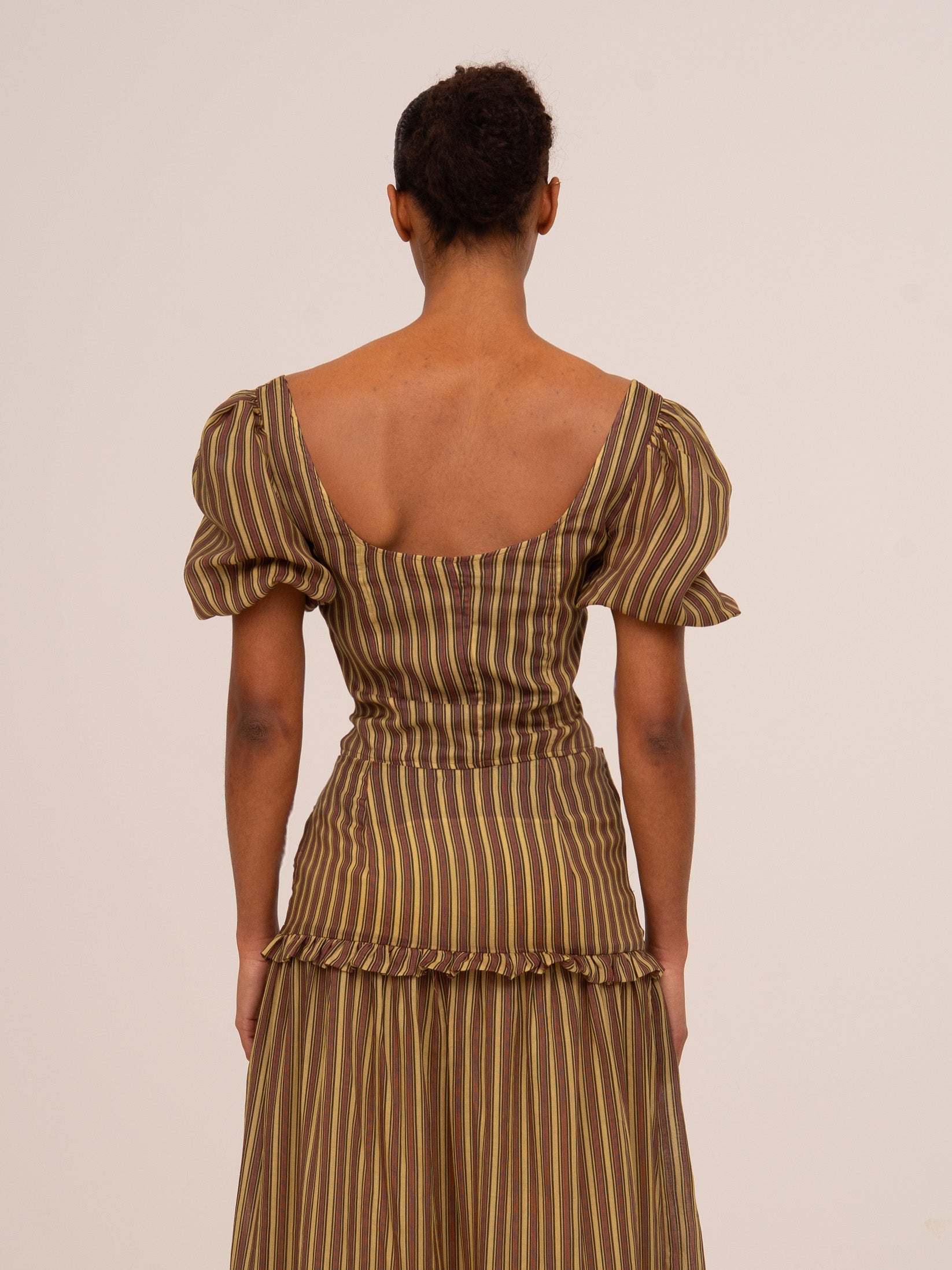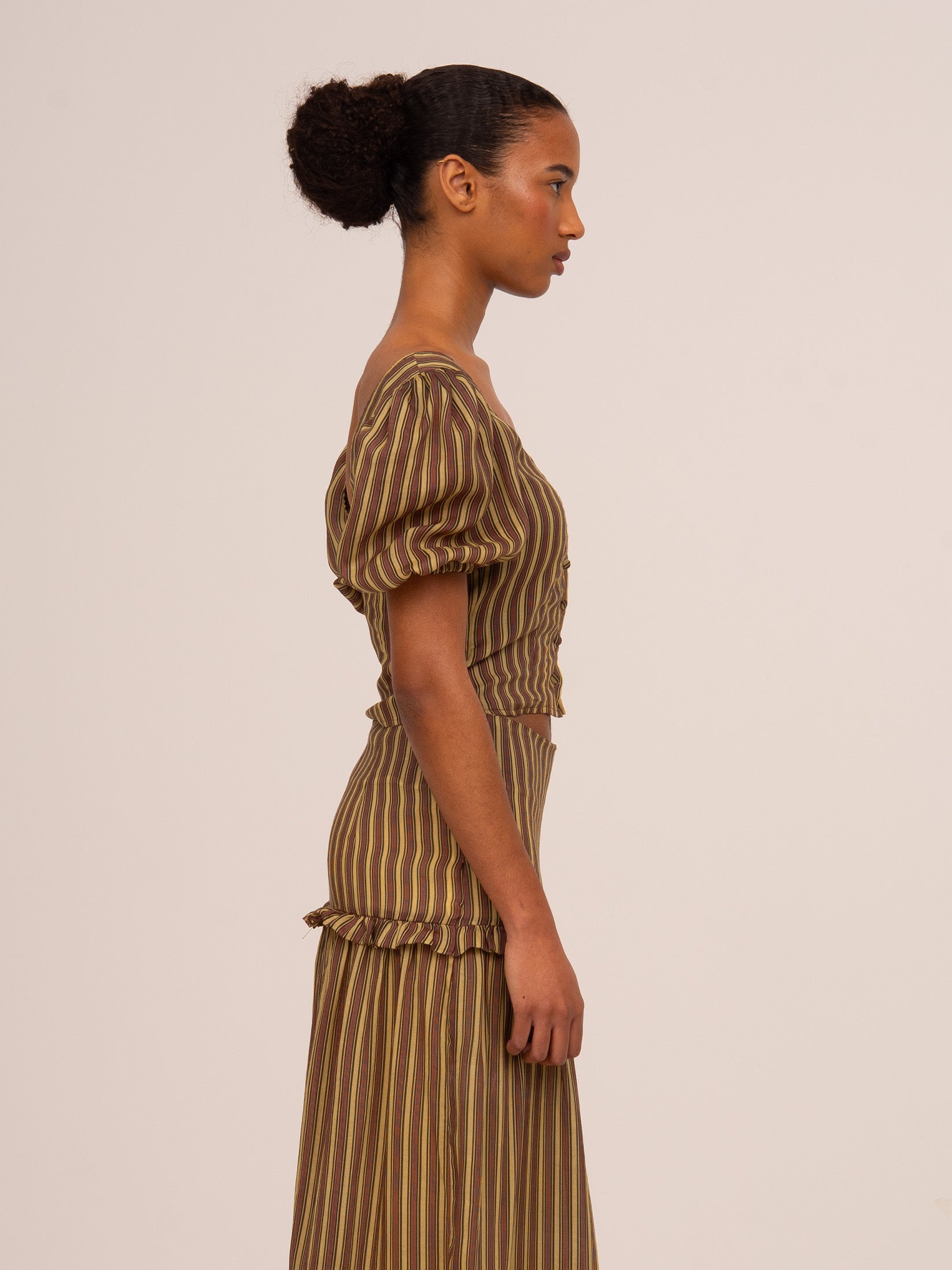 Top de rayas en tono rosa y amarillo. Con corte cropped, juvenil y femenino, perfecto para ocasiones especiales.