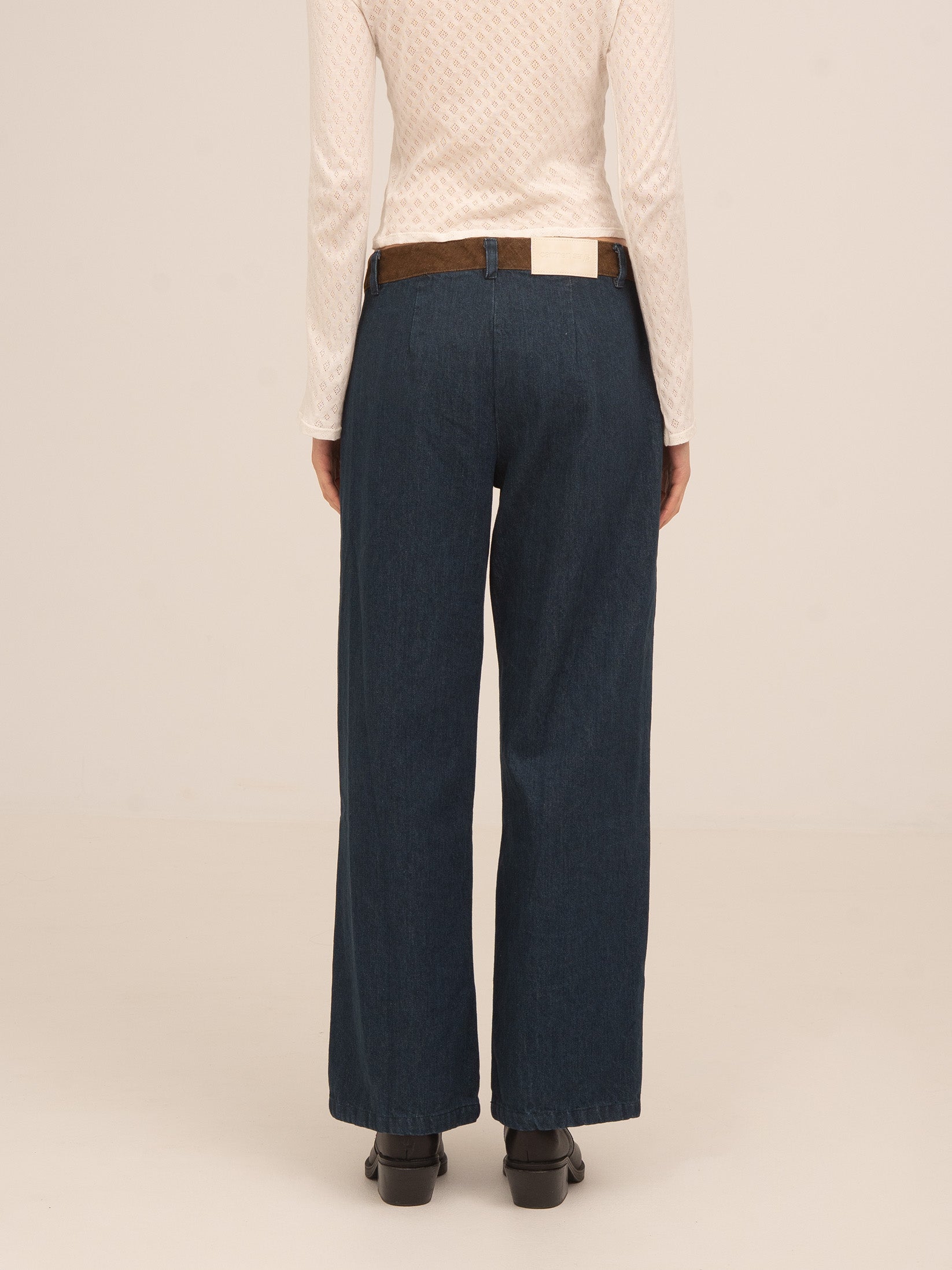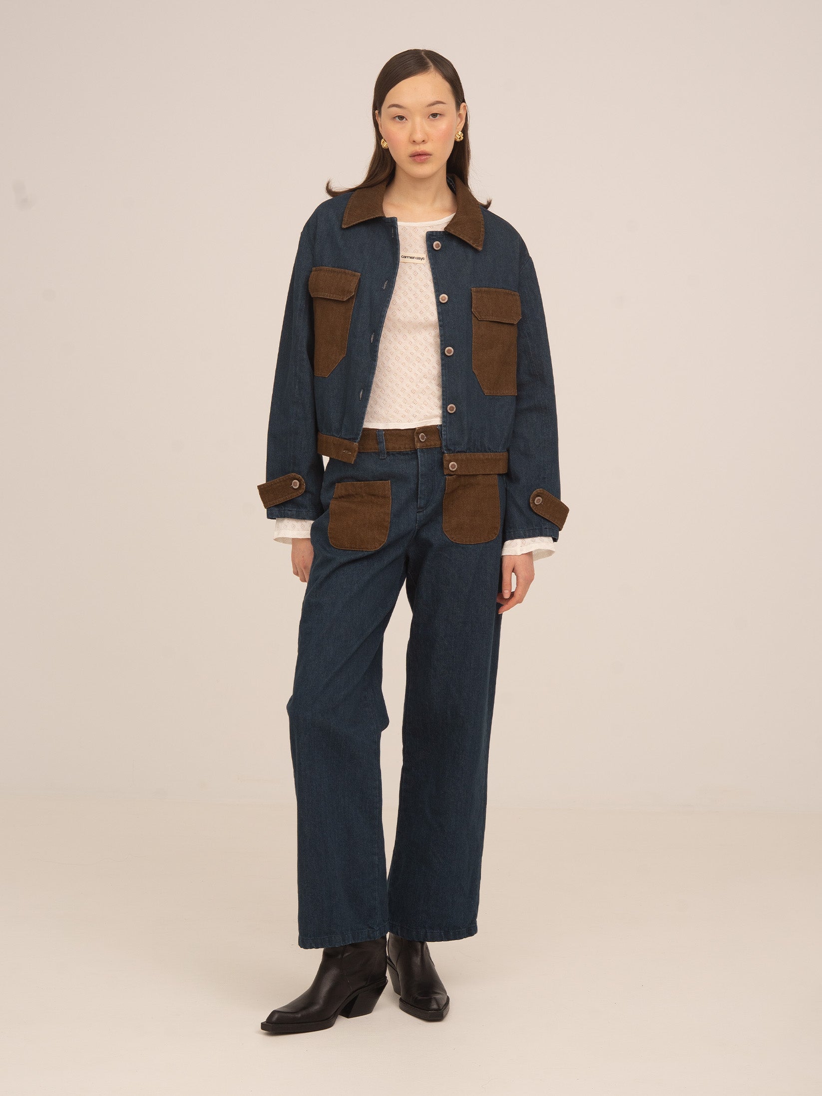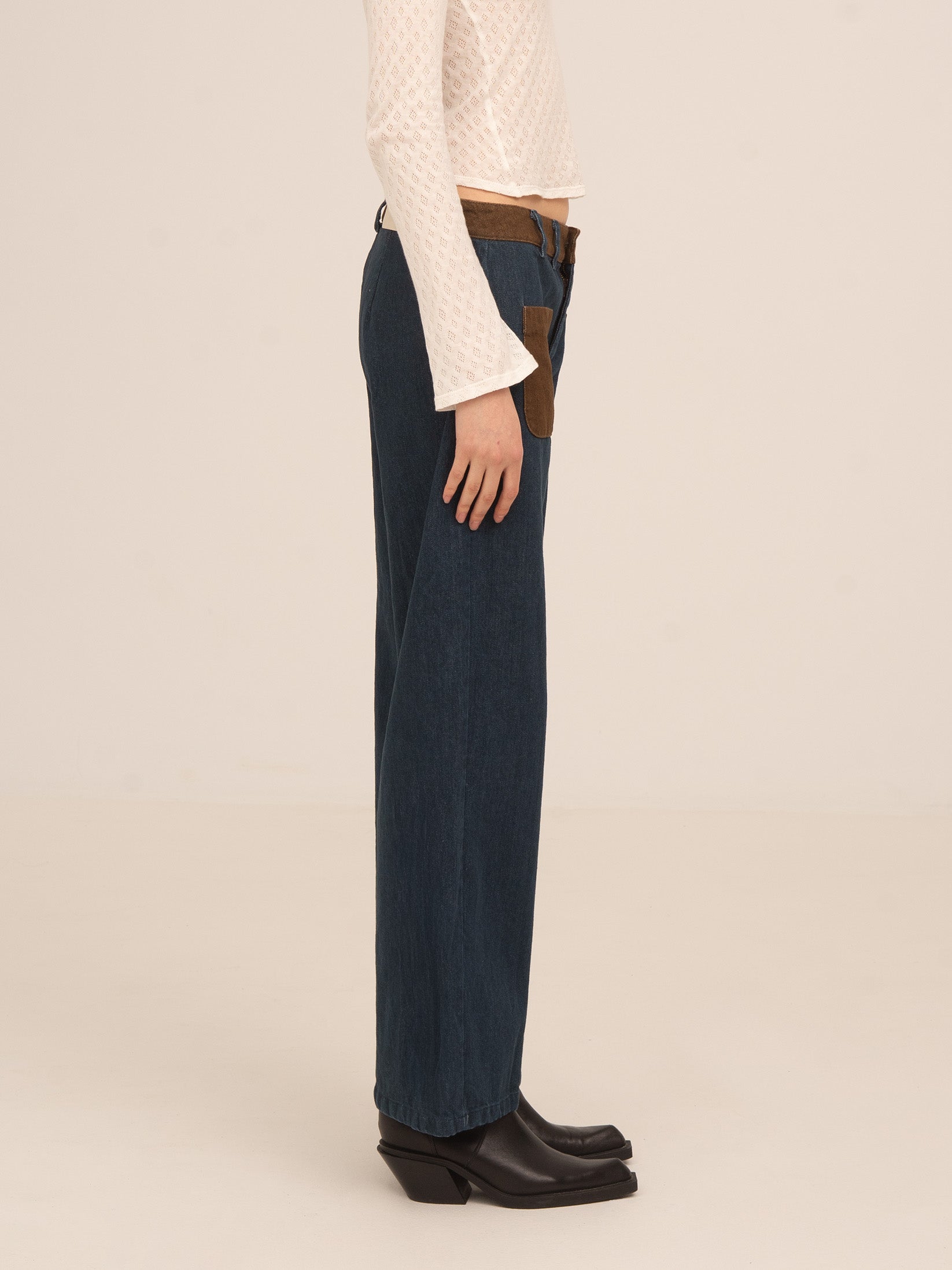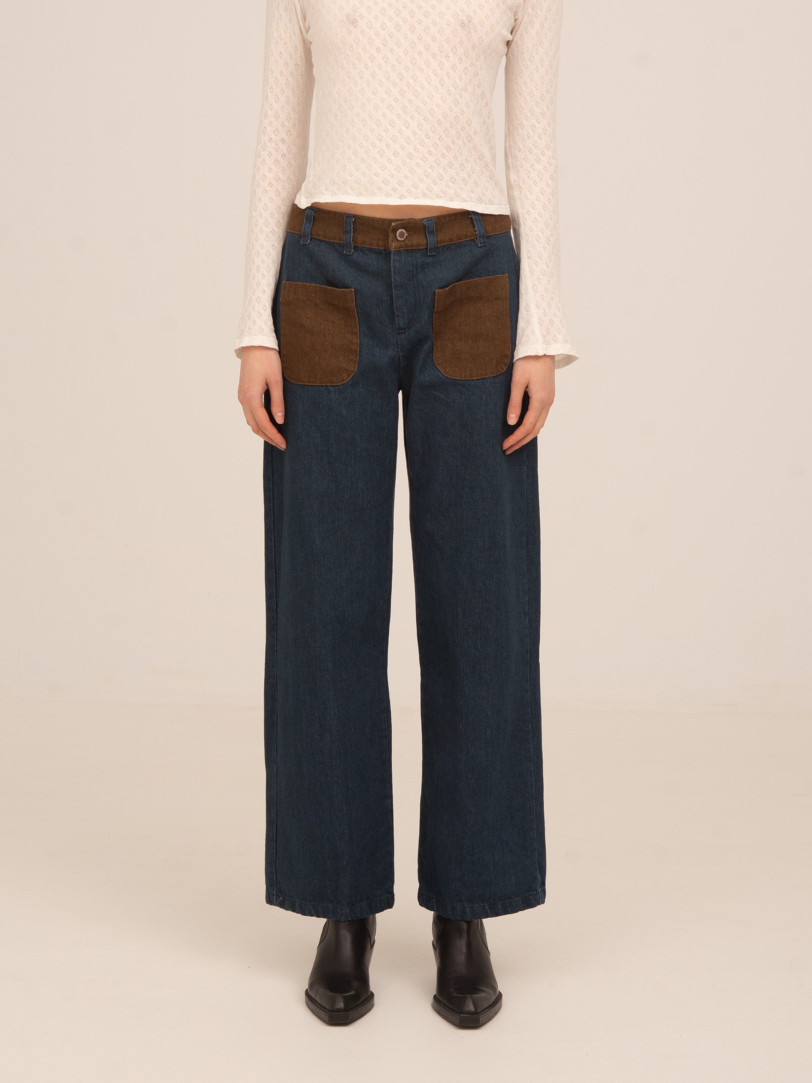 Pantalones de corte recto en denim azul y marrón. De cintura baja. Dos bolsillos de parche en el delantero. Cierre mediante cremallera metálica y botón metálico.