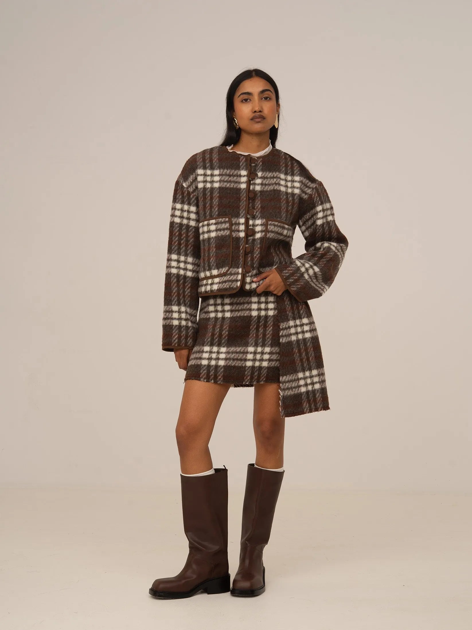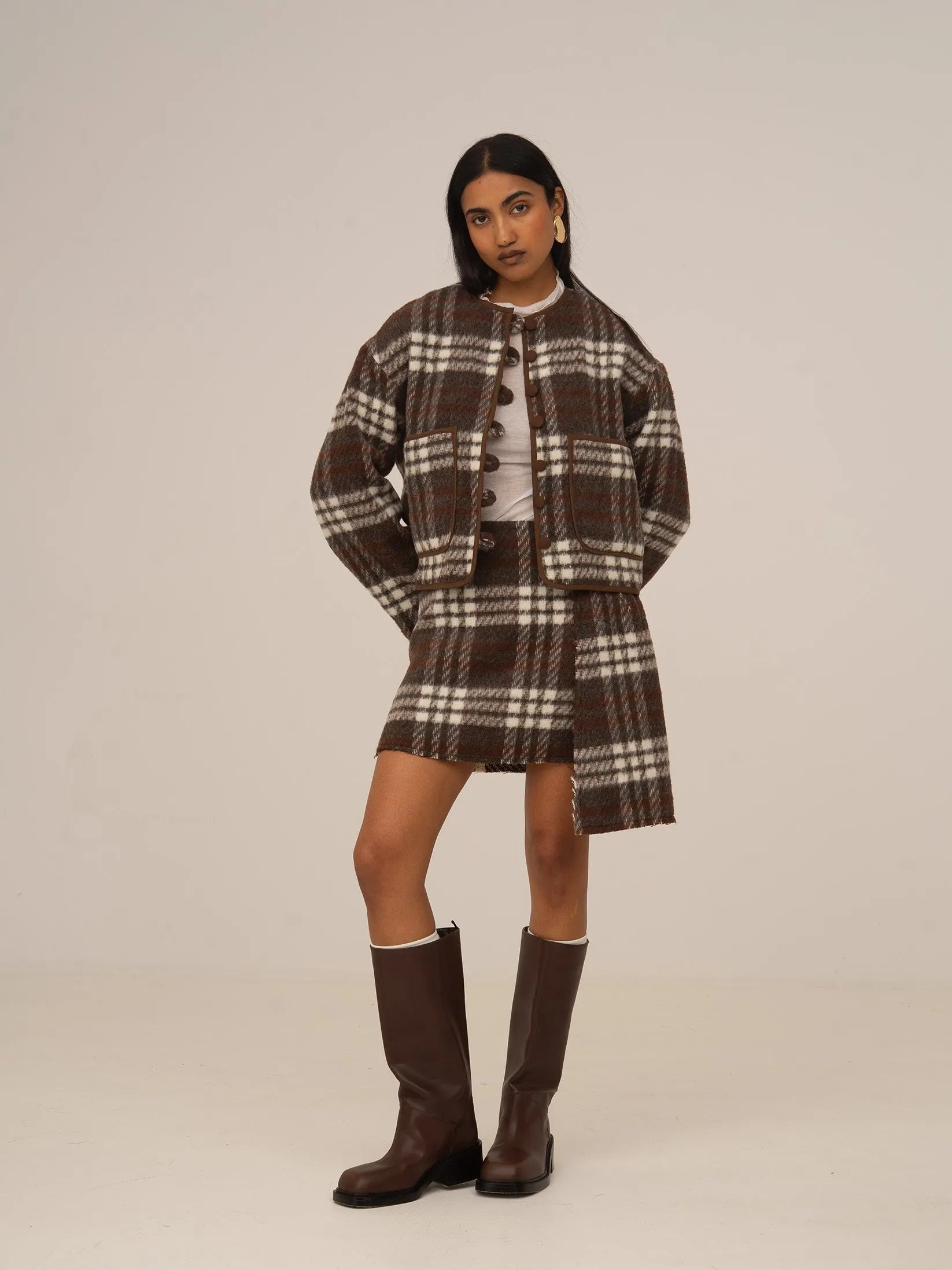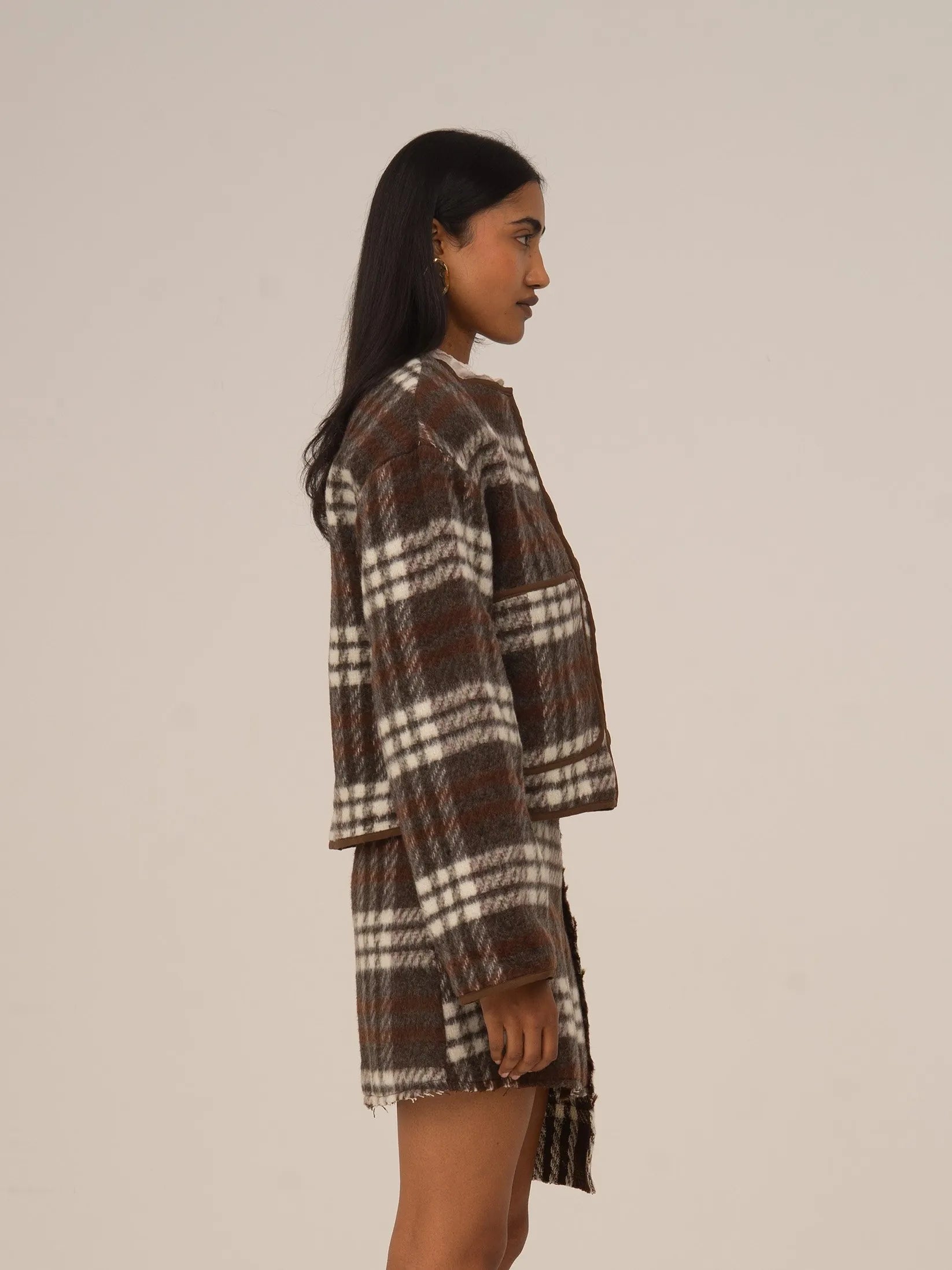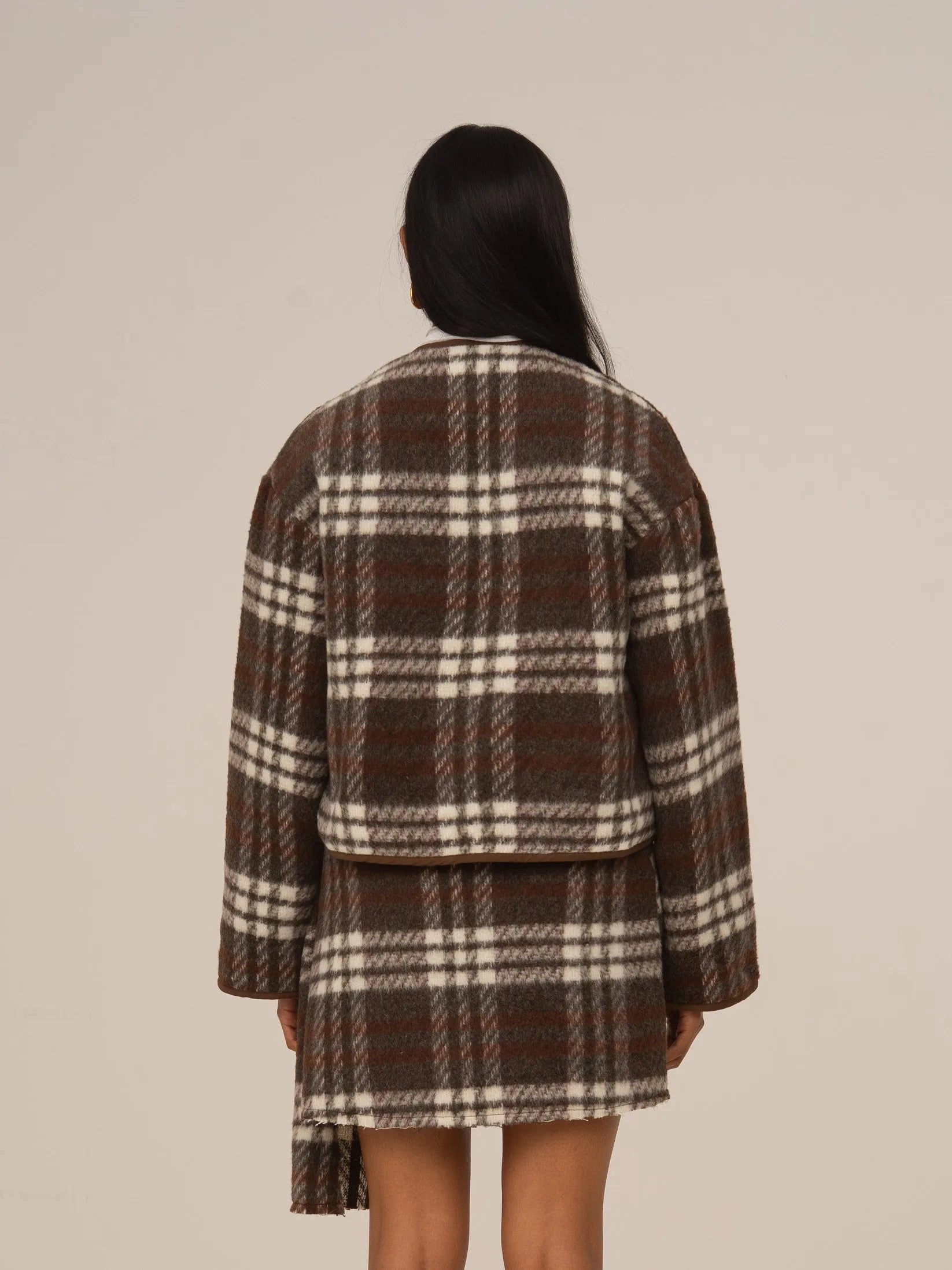 Chaqueta de cuadros marrón con estilo oversize y acabado elegante.