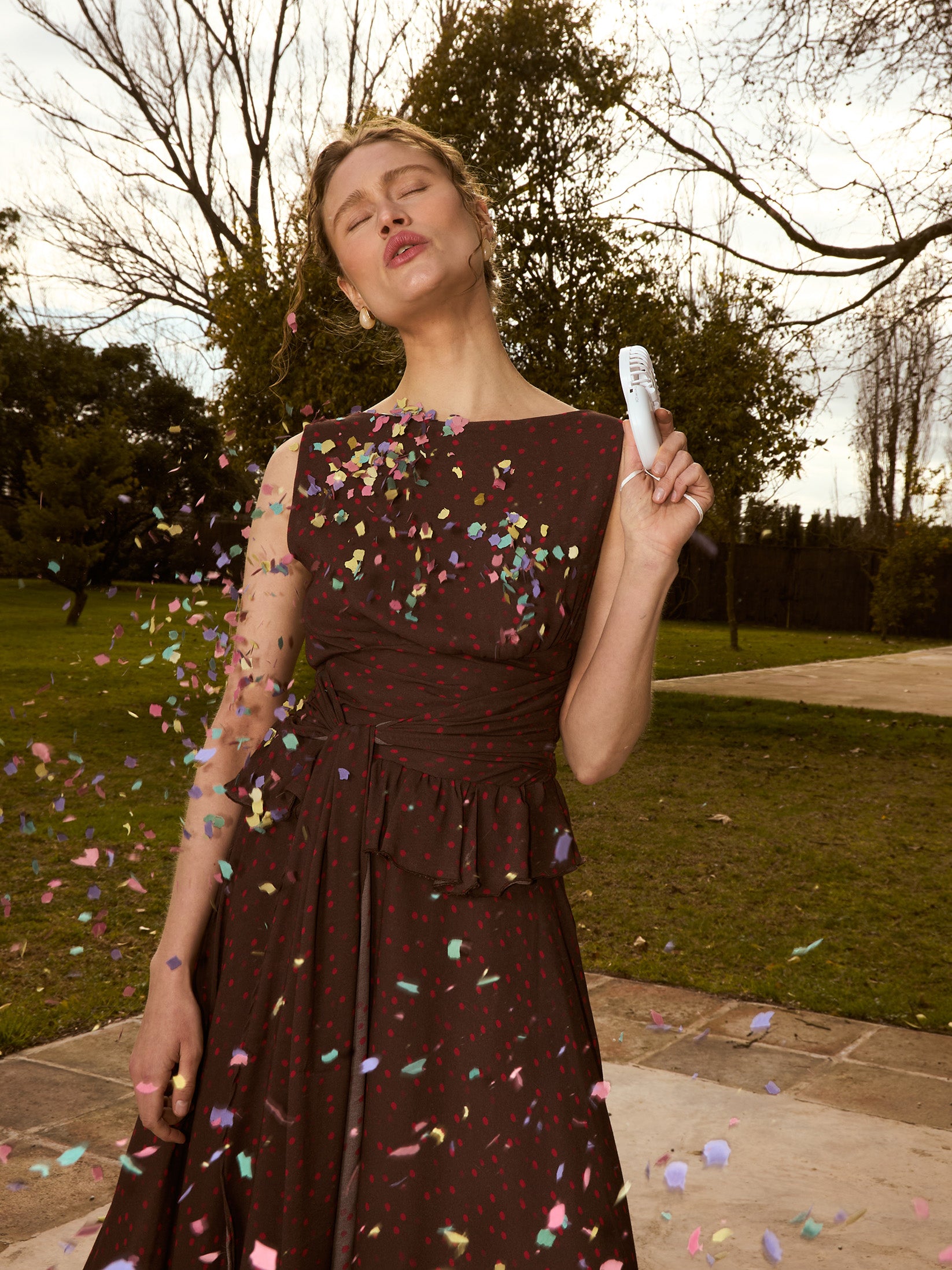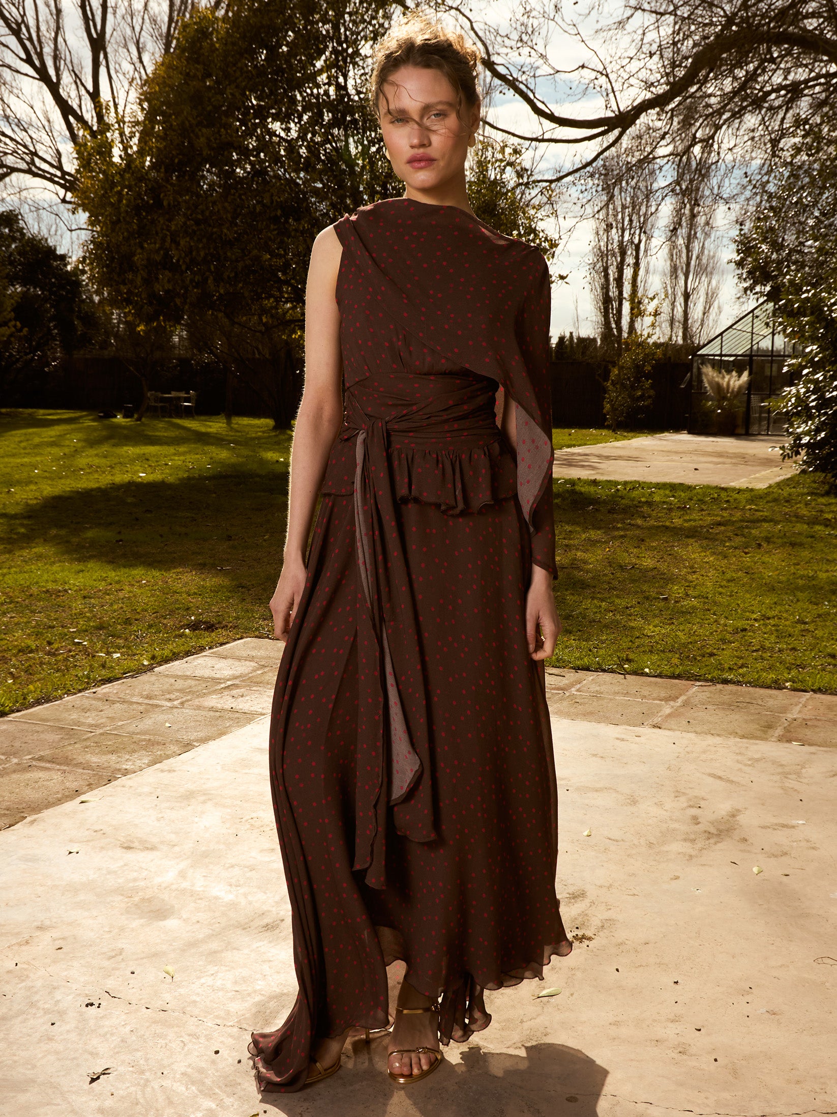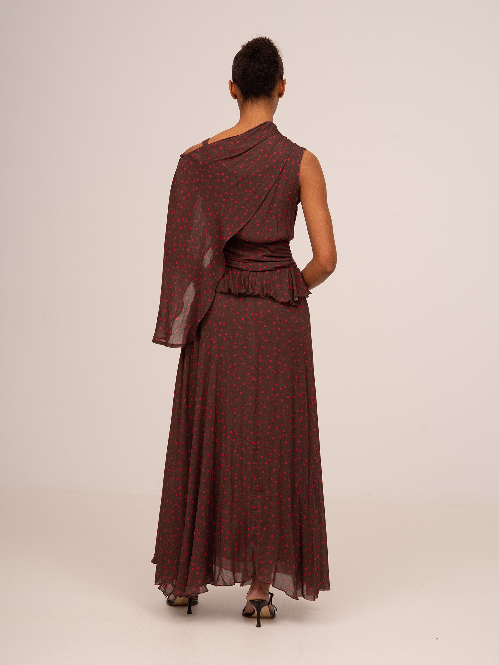 Vestido largo en tono marrón con estampado de lunares en tono rojo. Escote tipo barco con capa asimétrica desmontable. El diseño se ajusta a la cintura mediante lazada y detalle fruncido. Falda larga y fluida.