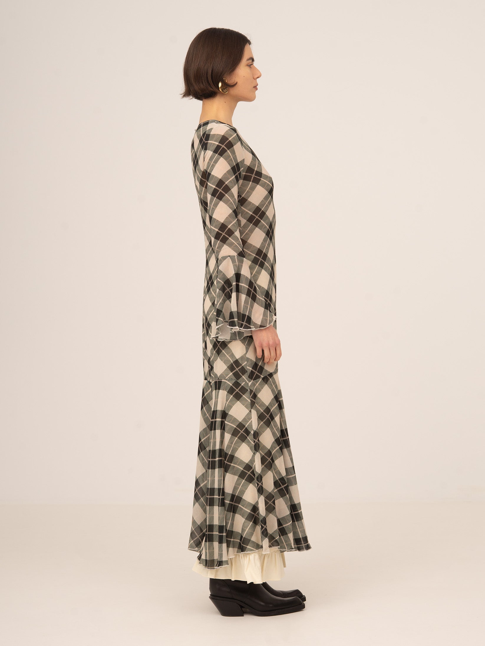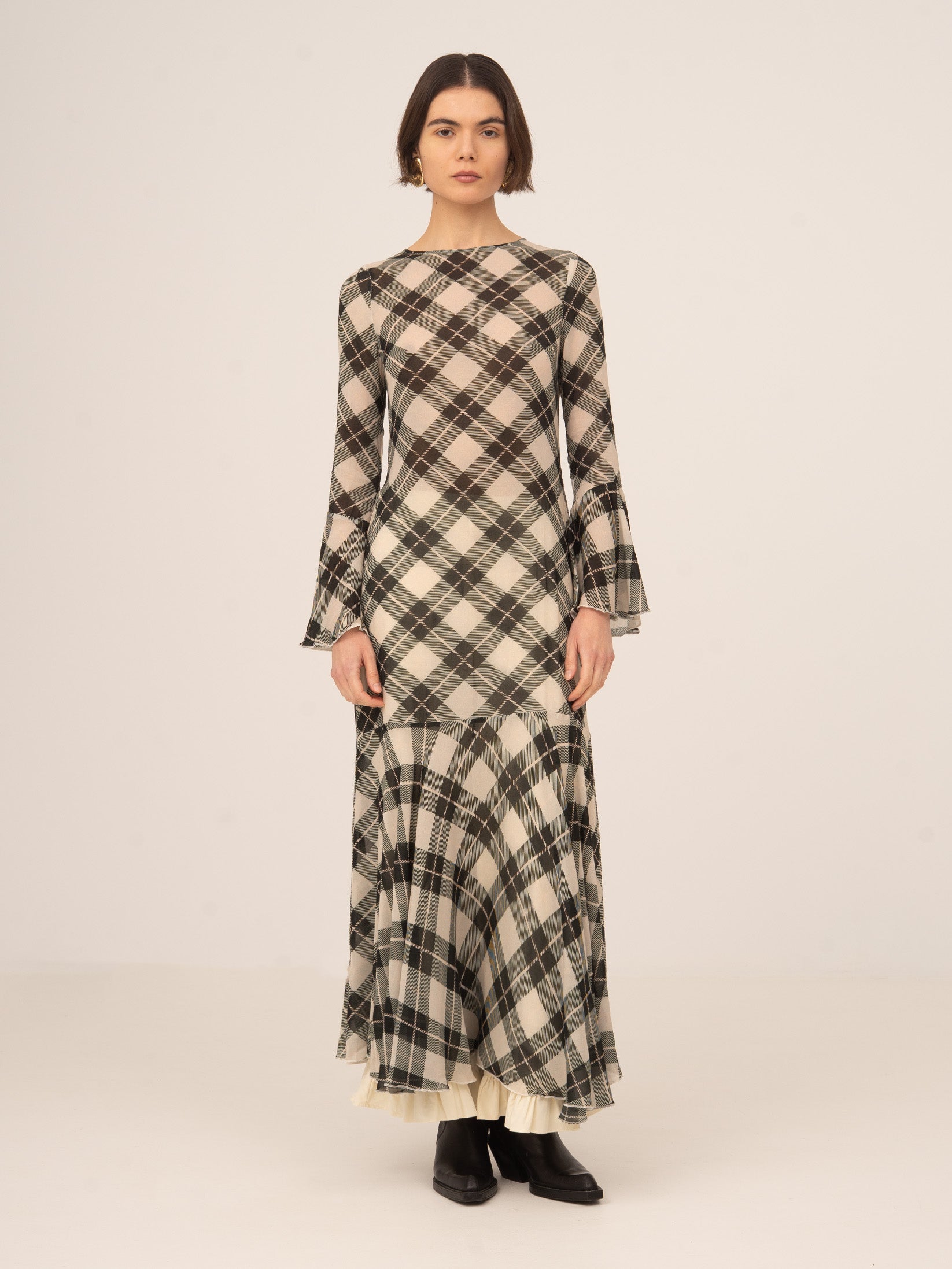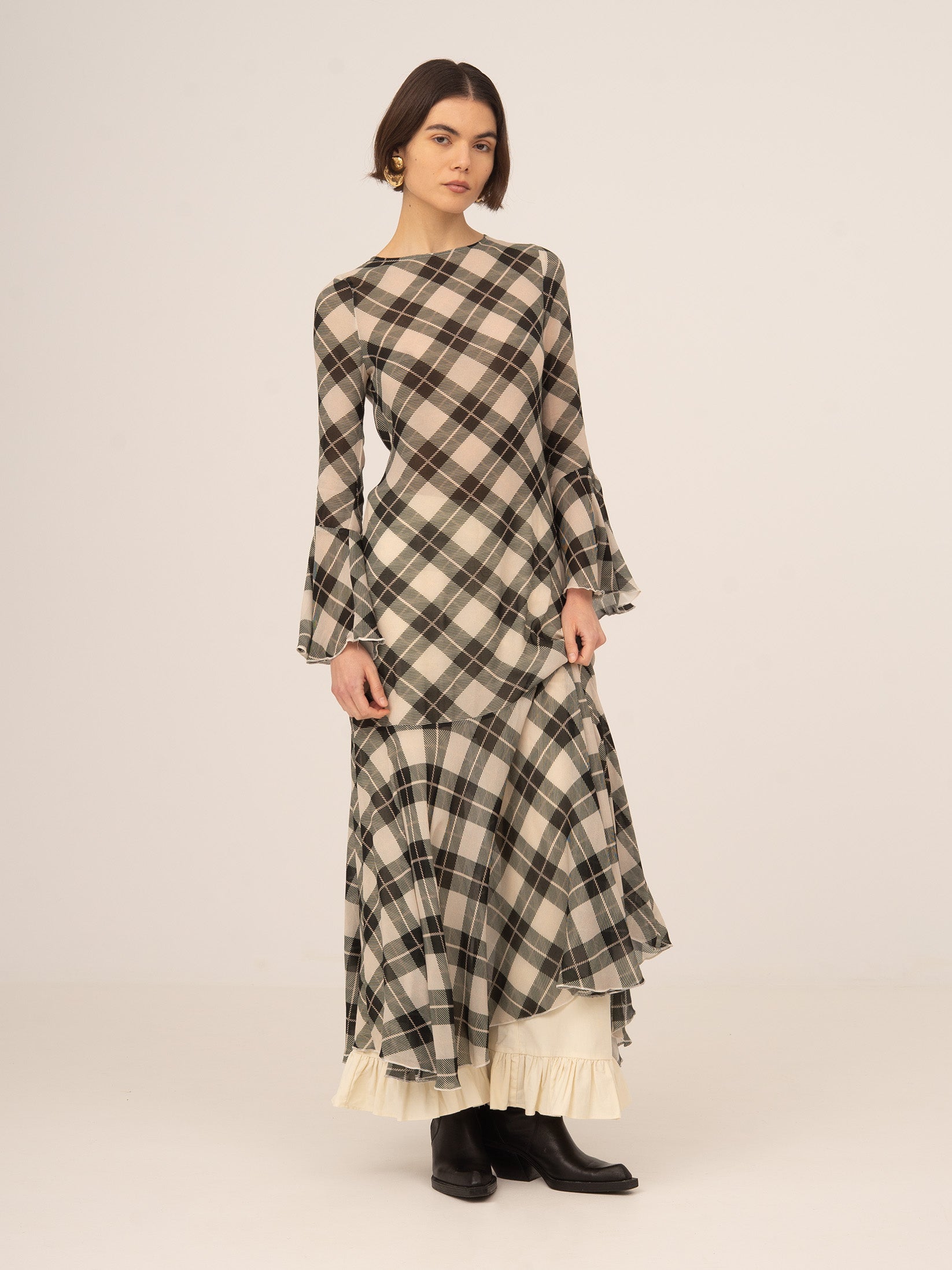 Vestido midi con estampado de cuadros en tono negro y fondo blanco. Silueta entallada, mangas largas con volantes acampanados y falda con vuelo sutil. Detalle de gota y botón en la espalda. El tejido es semitransparente.