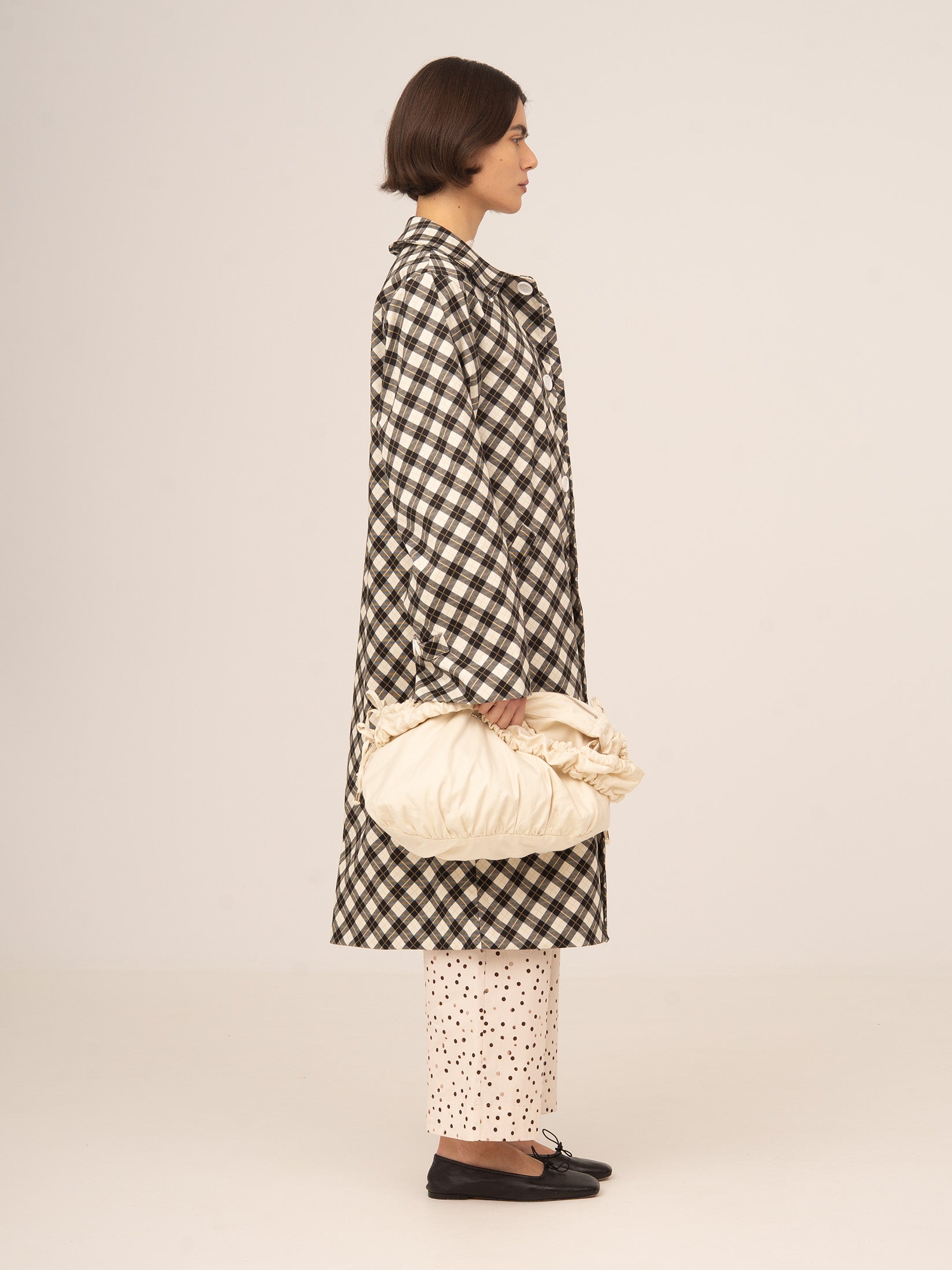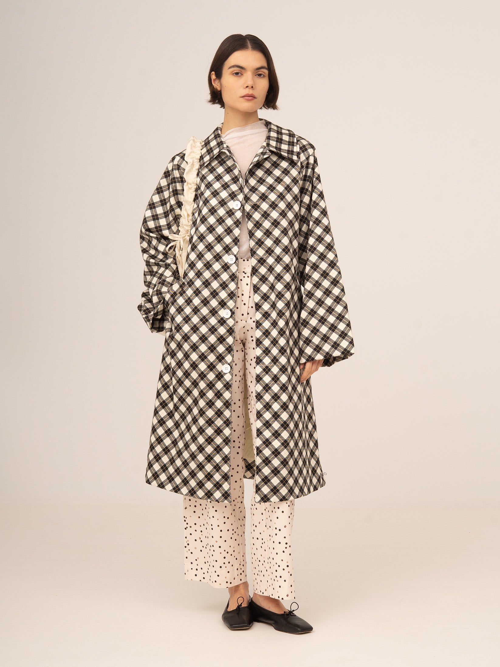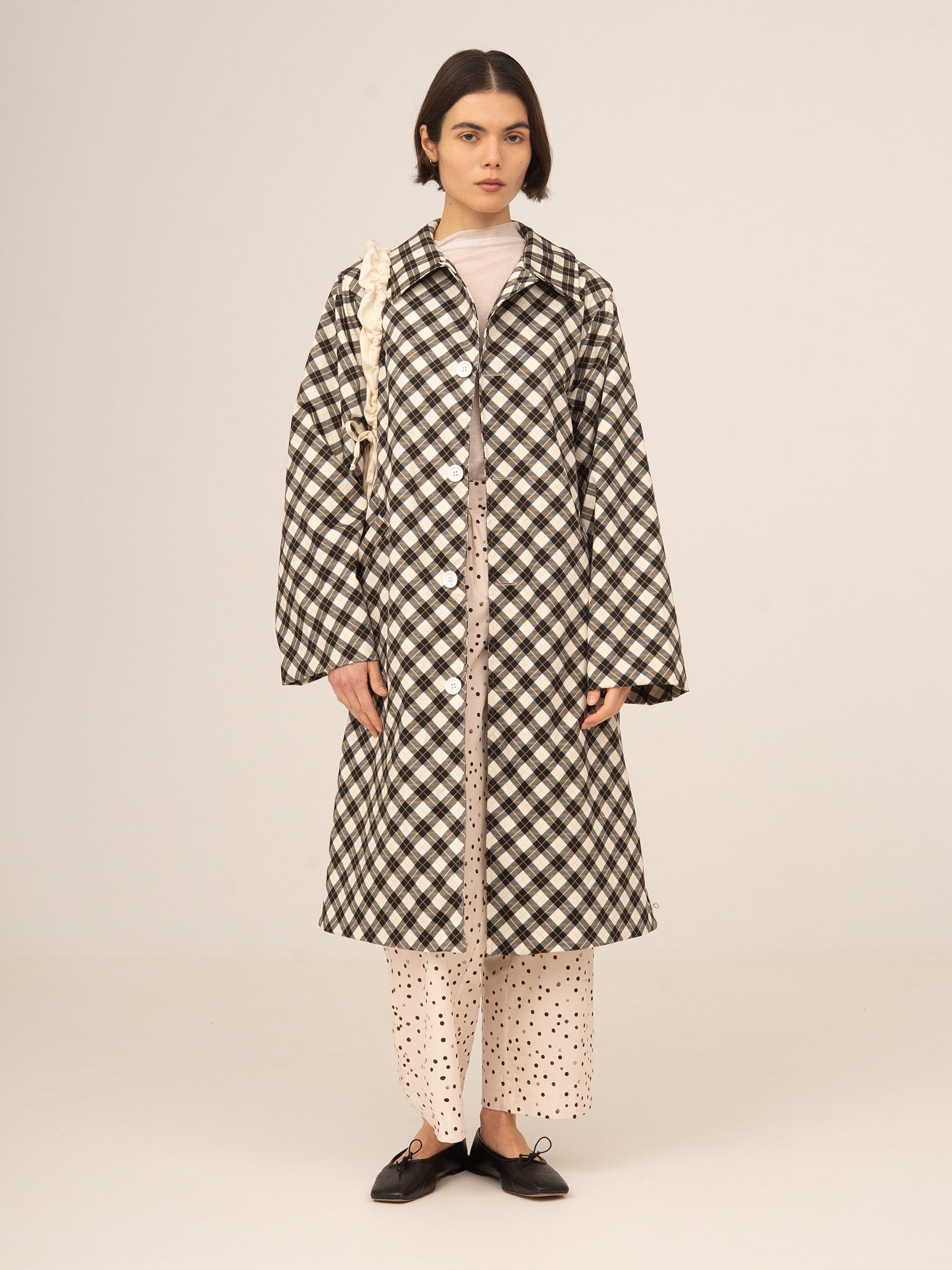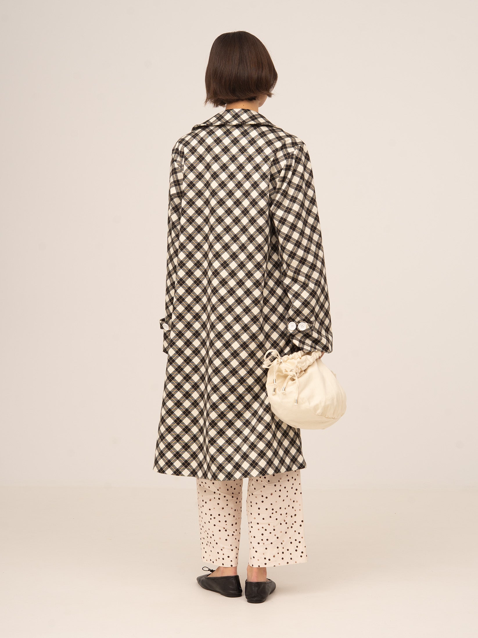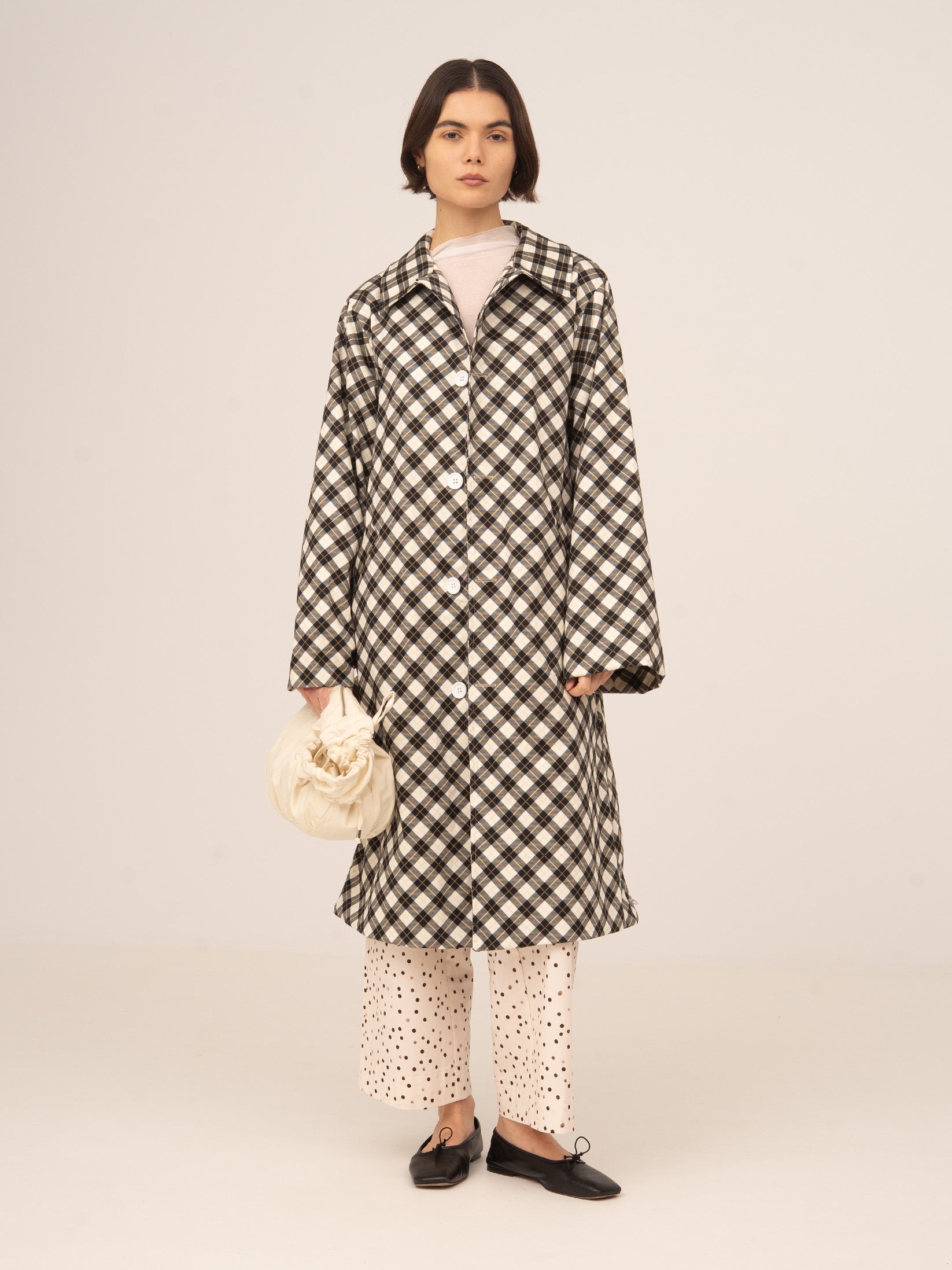 Gabardina larga con estampado de cuadros en tono negro y fondo blanco. Diseño amplio y fluido. Con cuello clásico y botones grandes. Abertura mediante botonadura central.