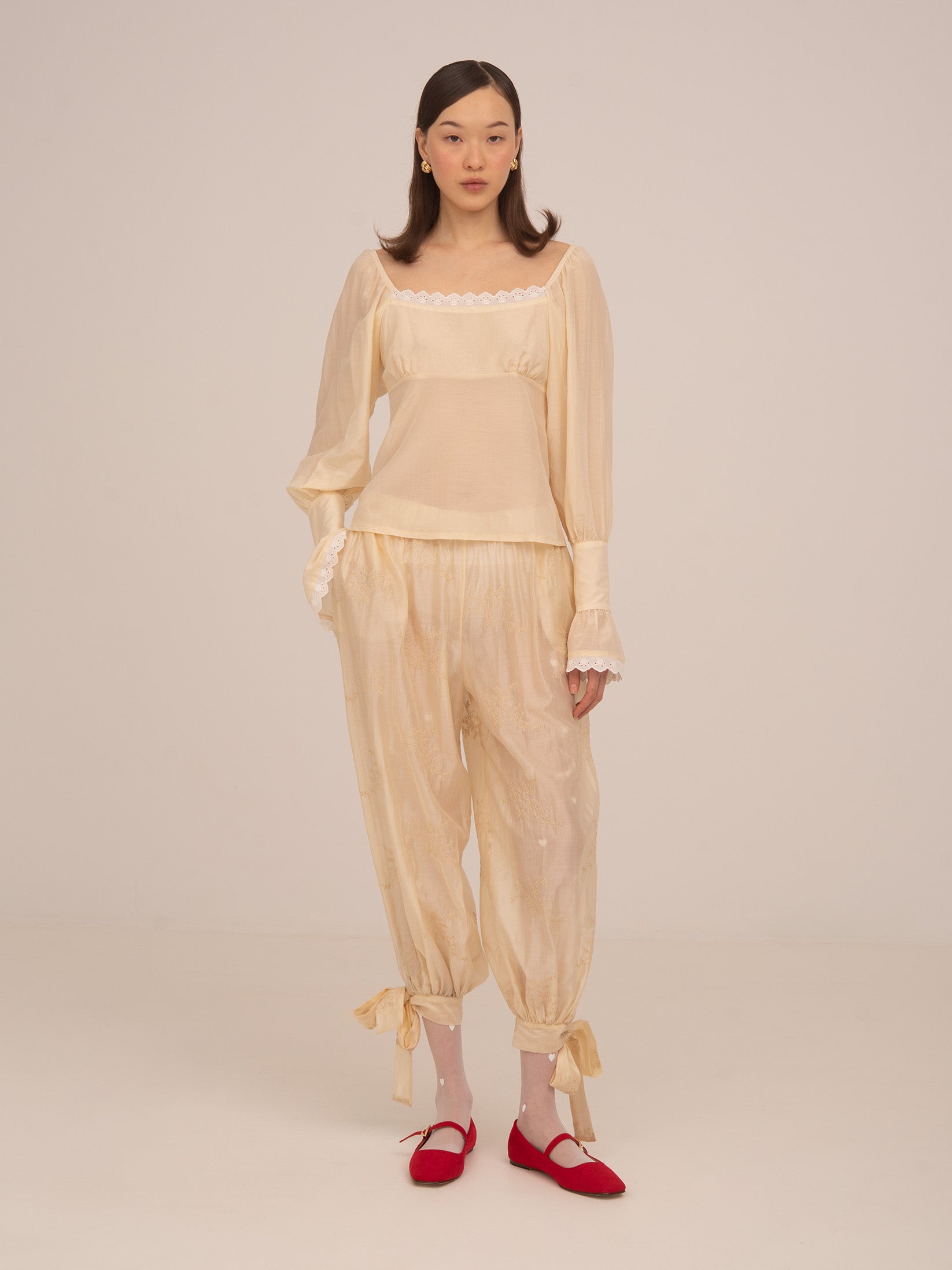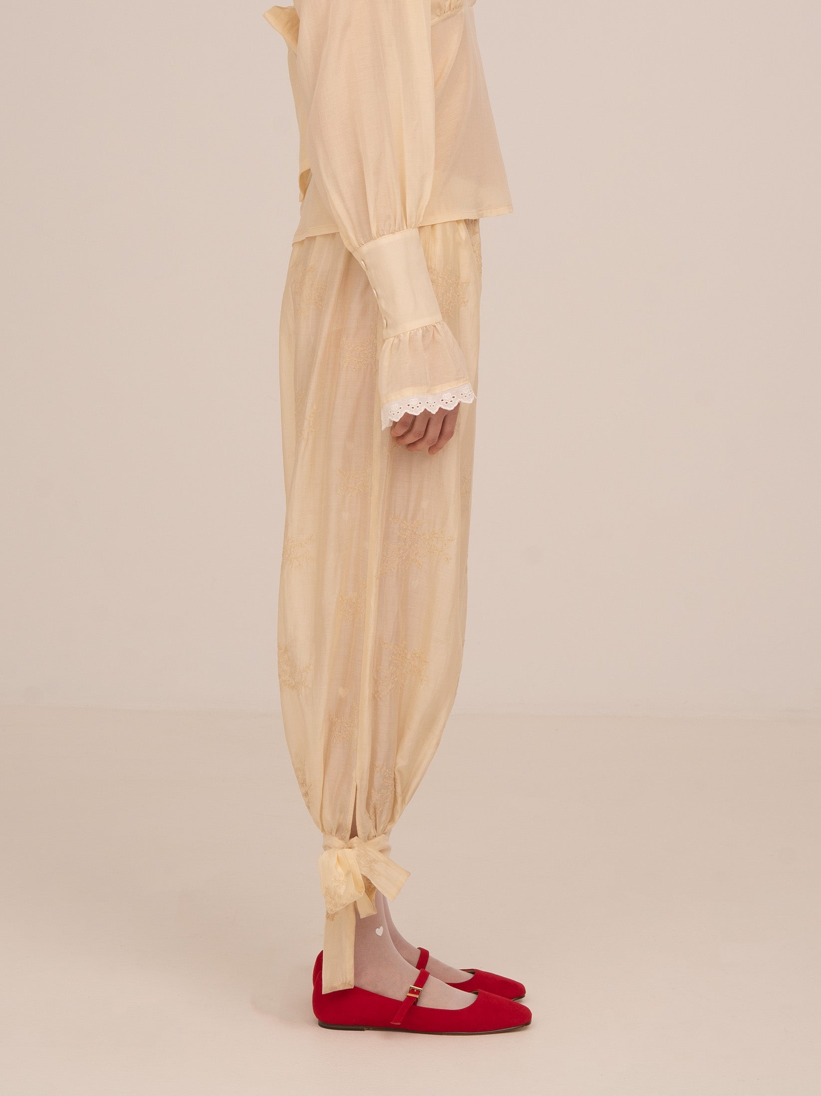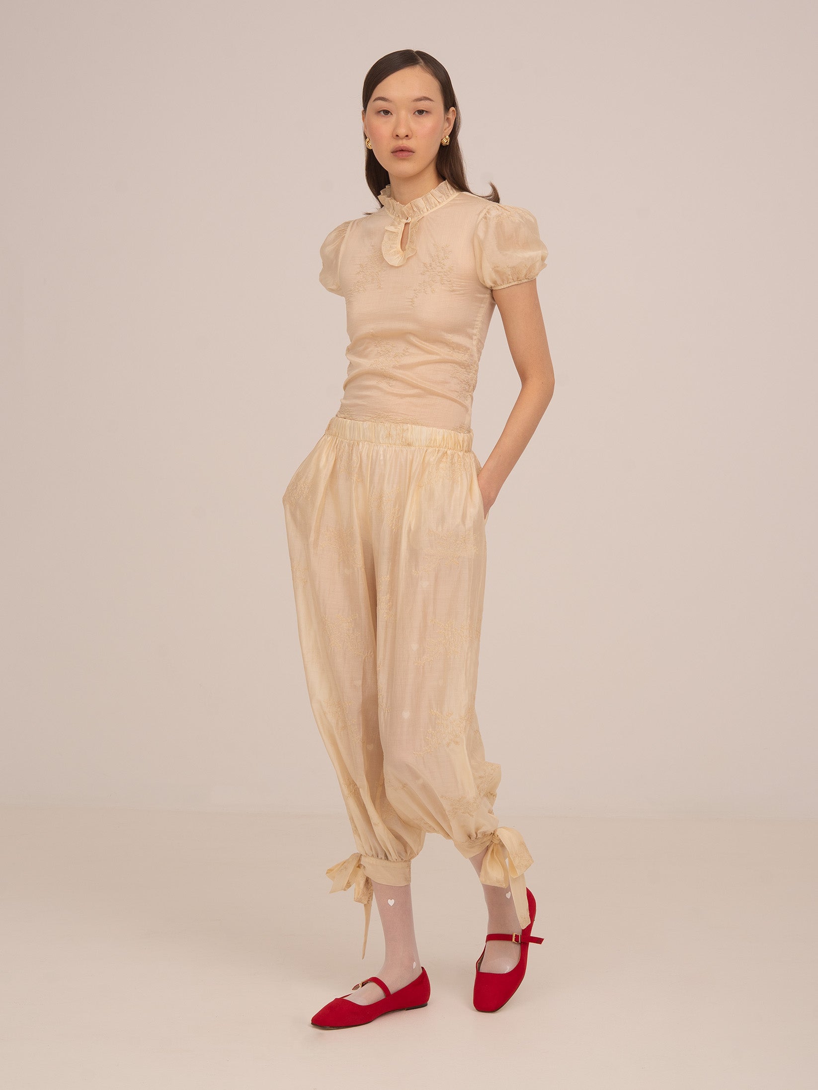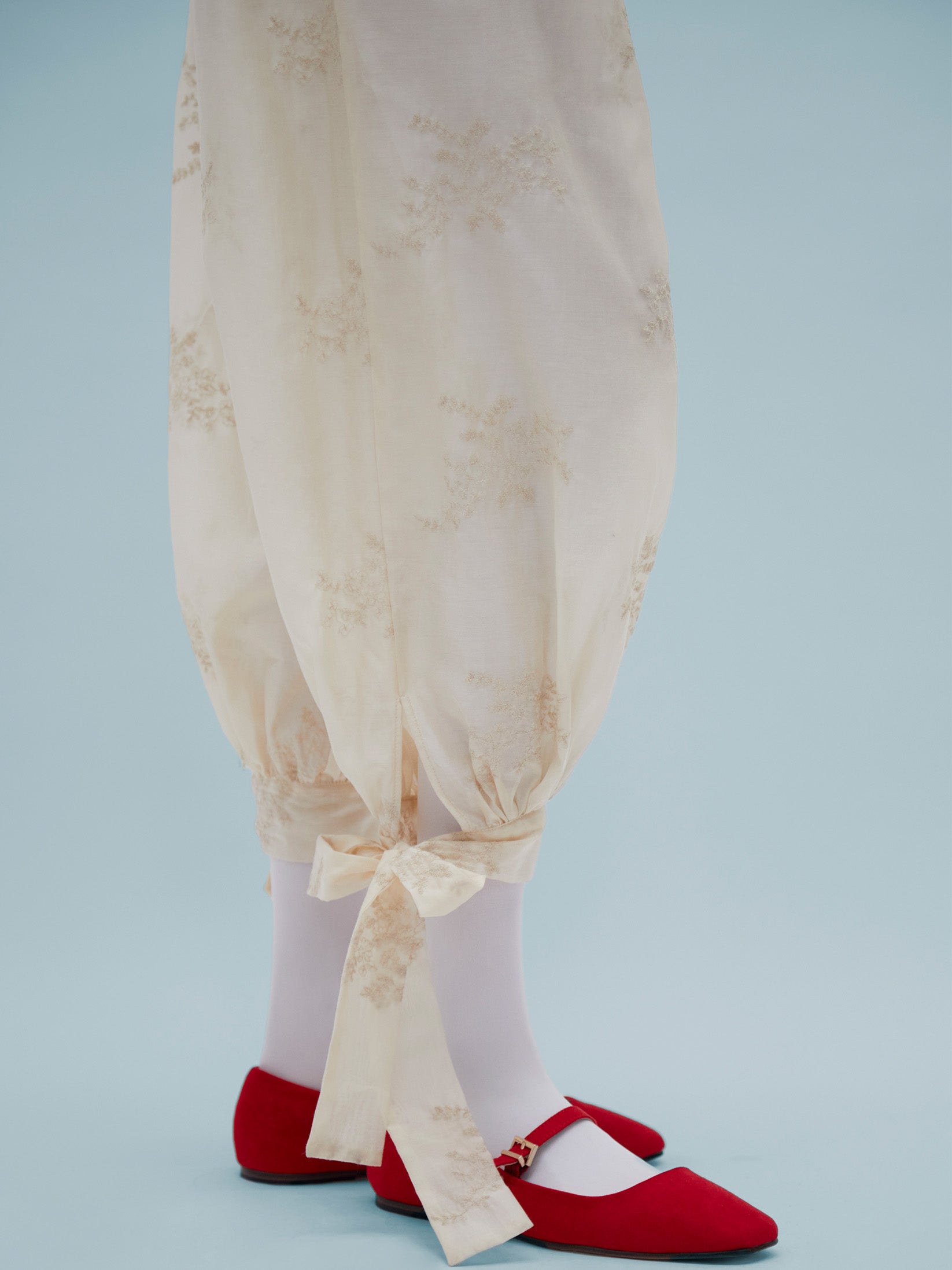 Pantalón tipo bombacho en tejido en tono crema con bordados y translúcido. Ajustable en cintura mediante cinturilla elástica, mientras que el diseño se estrecha en el bajo mediante lazadas ajustables, que permiten regular el largo y el volumen.