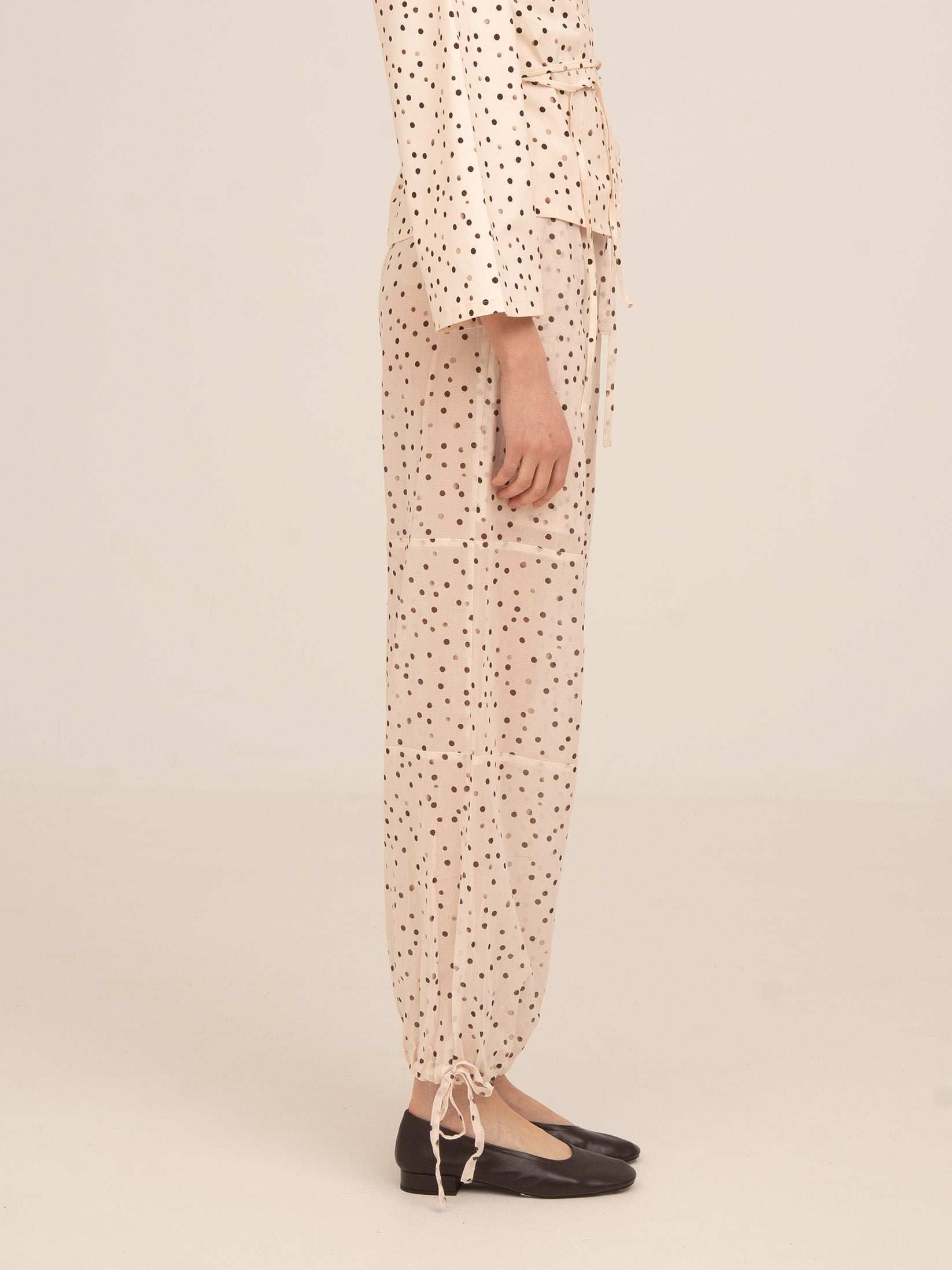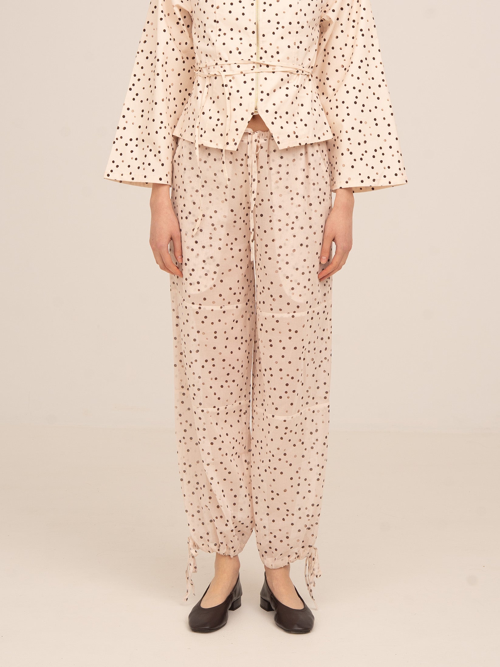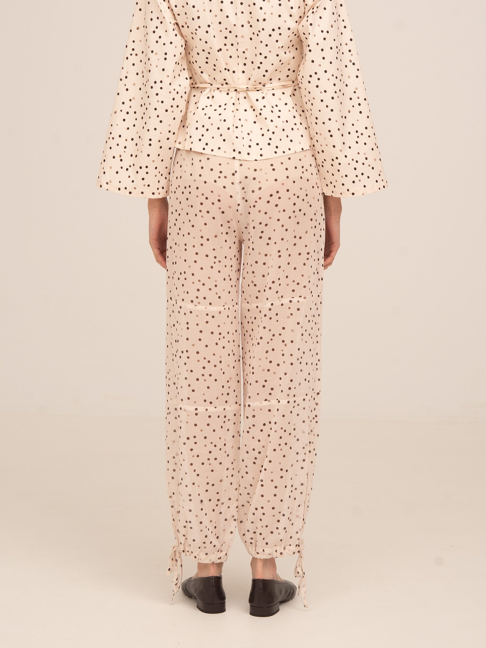Pantalón fluido tipo parachute con estampado de lunares en tonos marrón sobre fondo crema, una prenda de tendencia que combina ligereza, estilo y un aire relajado pero sofisticado.
